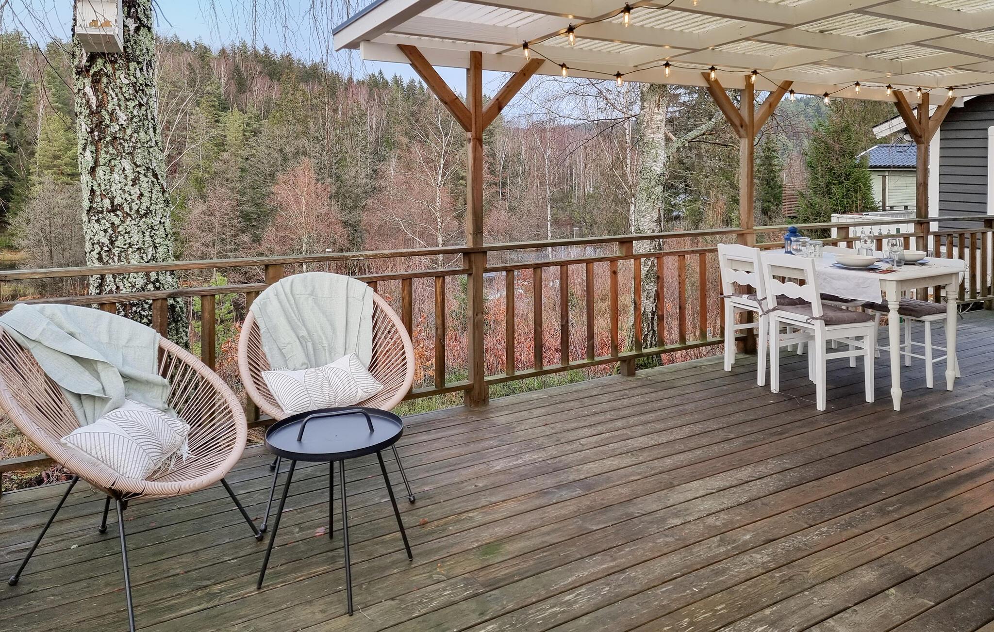 Det hyggelige og lyse interiør lægger op til afslapning, mens den store, overdækkede terrasse skaber ideelle betingelser for udendørs spisning. begynd dagene med en kop kaffe på verandaen og nyd den idylliske udsigt over vandet. Den idylliske rute fører jer direkte til søen - perfekt til morgenforfriskninger, afslappede fisketure eller blot dagdrømme med udsigt til den reflekterende vandoverflade.