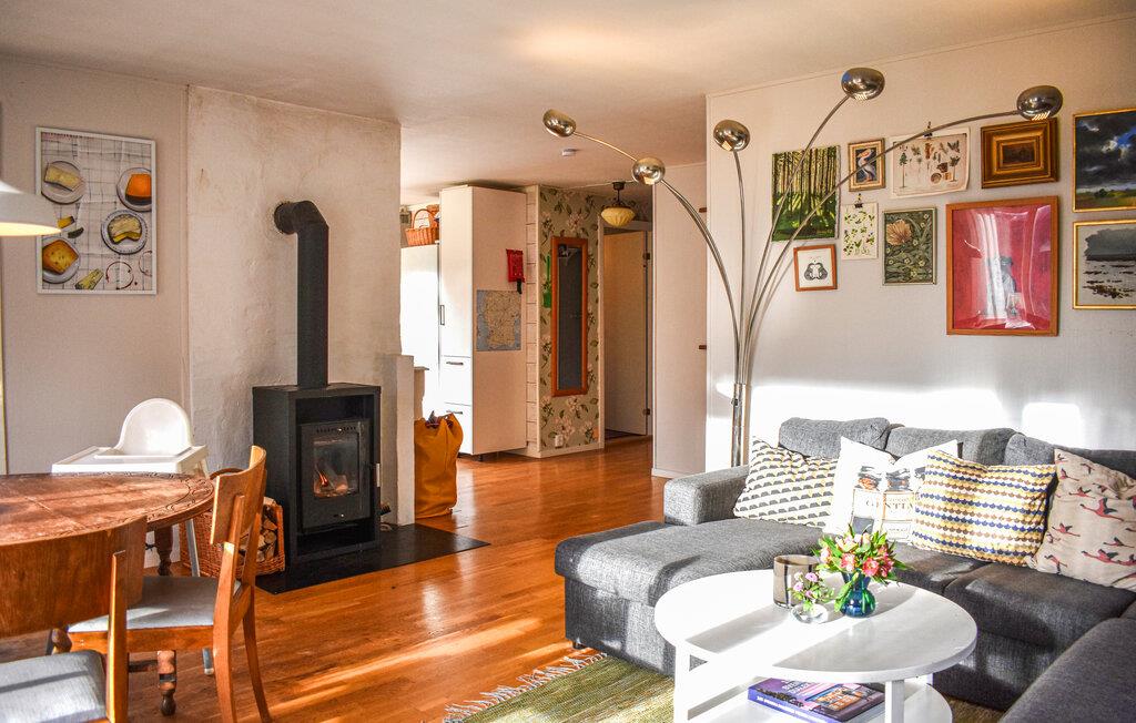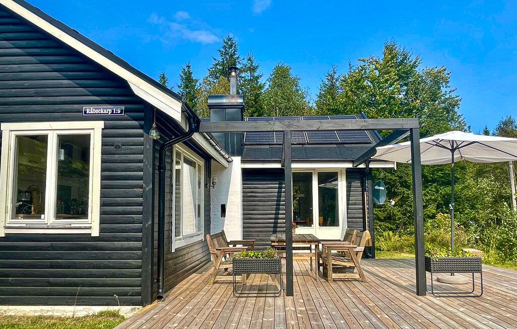 Fra stuen er der udgang til terrassen, hvor I kan nyde jeres lækre mad med udsigt til skoven på varme dage.
