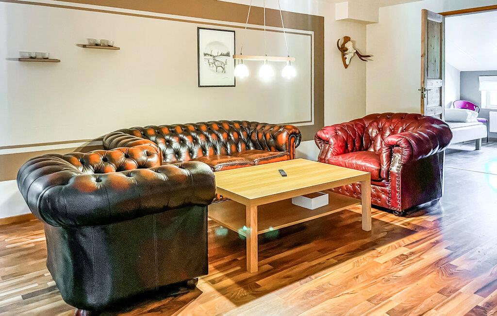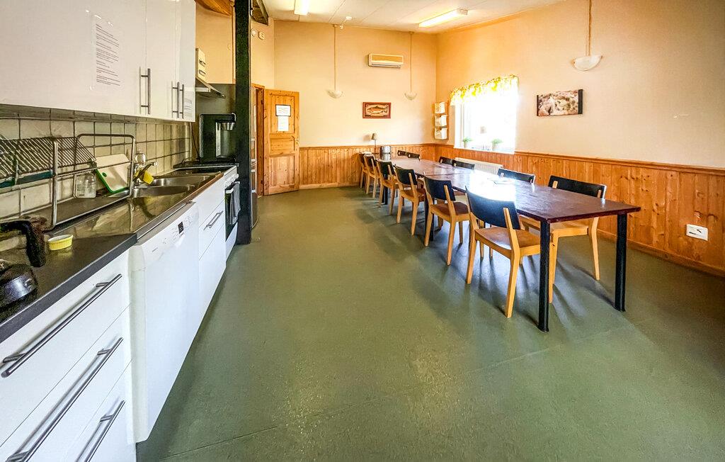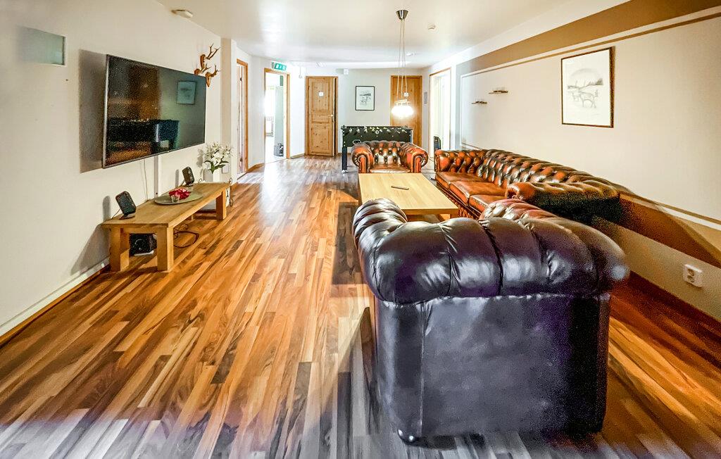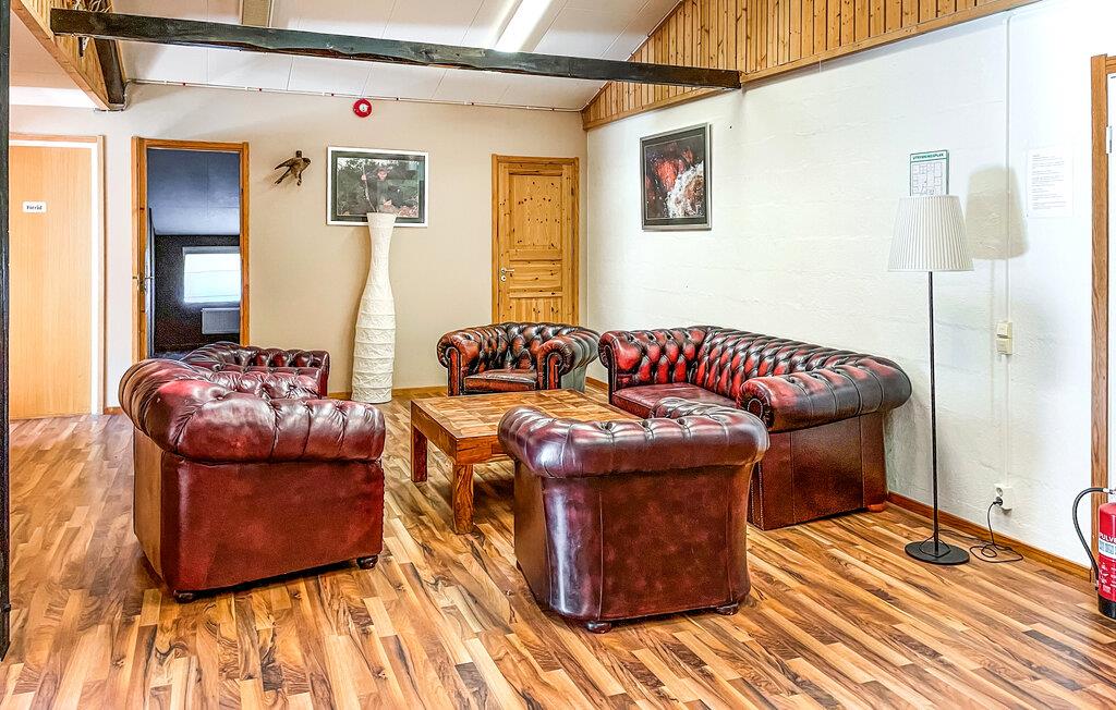Denne rummelige ferielejlighed er ideel til grupper eller familier, der ønsker at kombinere ro og aktivitet. Nyd de naturlige omgivelser, den direkte udsigt over søen og de mange fritidsaktiviteter på den store grund. Find jer godt til rette på de komfortable sofaer i stuen. Se en film sammen på det store tv eller spil bordfodbold. Det åbne opholdsområde lægger op til at sidde sammen og slappe af. Lav mad sammen i det veludstyrede køkken med stort spisebord, oplagt til lange aftener med god mad og snak. En flippermaskine og andre spillemuligheder i huset giver variation.