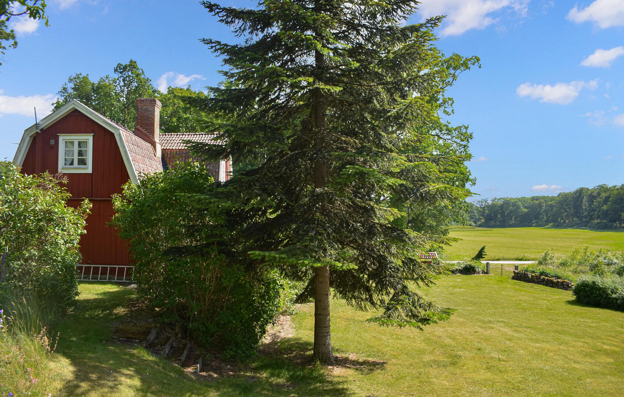 I dette charmerende røde træhus får I en idyllisk base for årets familieferie. Her er alt klar til en afslappende ferie omgivet af natur. Smid jer tilrette i sofaen og nyd samtalerne sammen. Nyd tiden med at lege, lave mad og se film sammen.