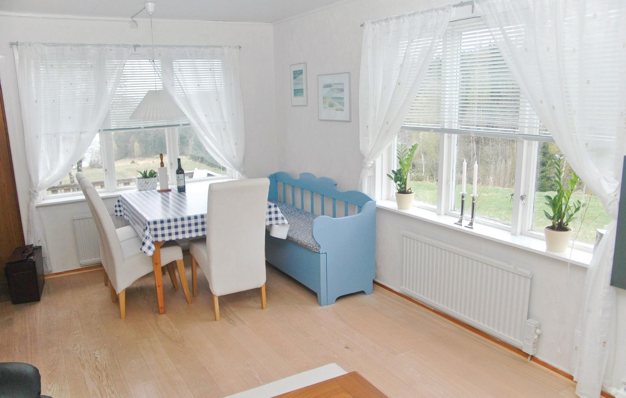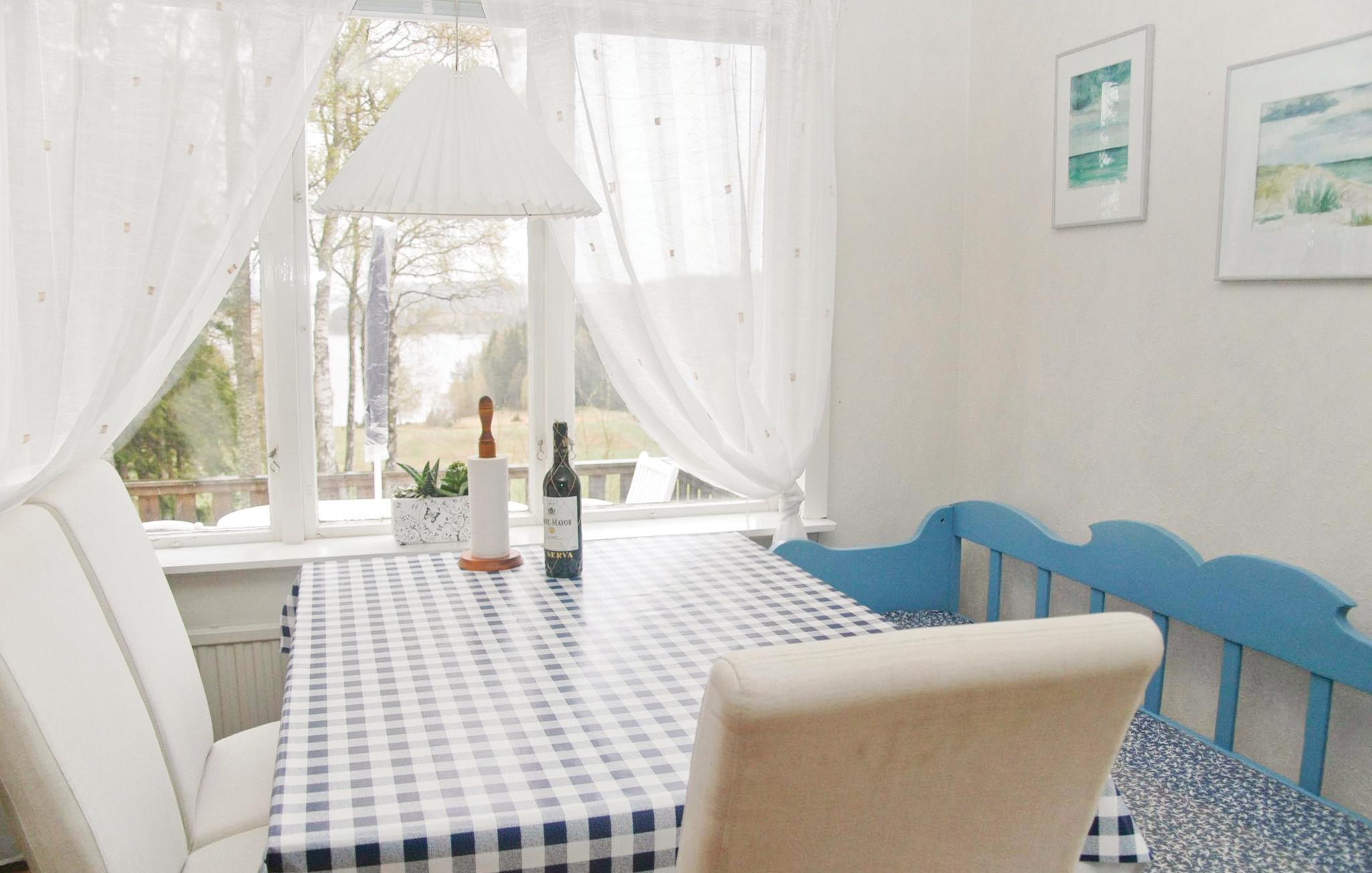 I huset findes to soveværelser, et gæstetoilet samt en bruser i kælderen. Indgangen til kælderen findes udvendigt. Her kan I tilbringe jeres ferie med en smuk udsigt over søen Kärnsjön. Der er ikke mere end 150 m ned til søen, hvor I kan bade ved sandstranden.