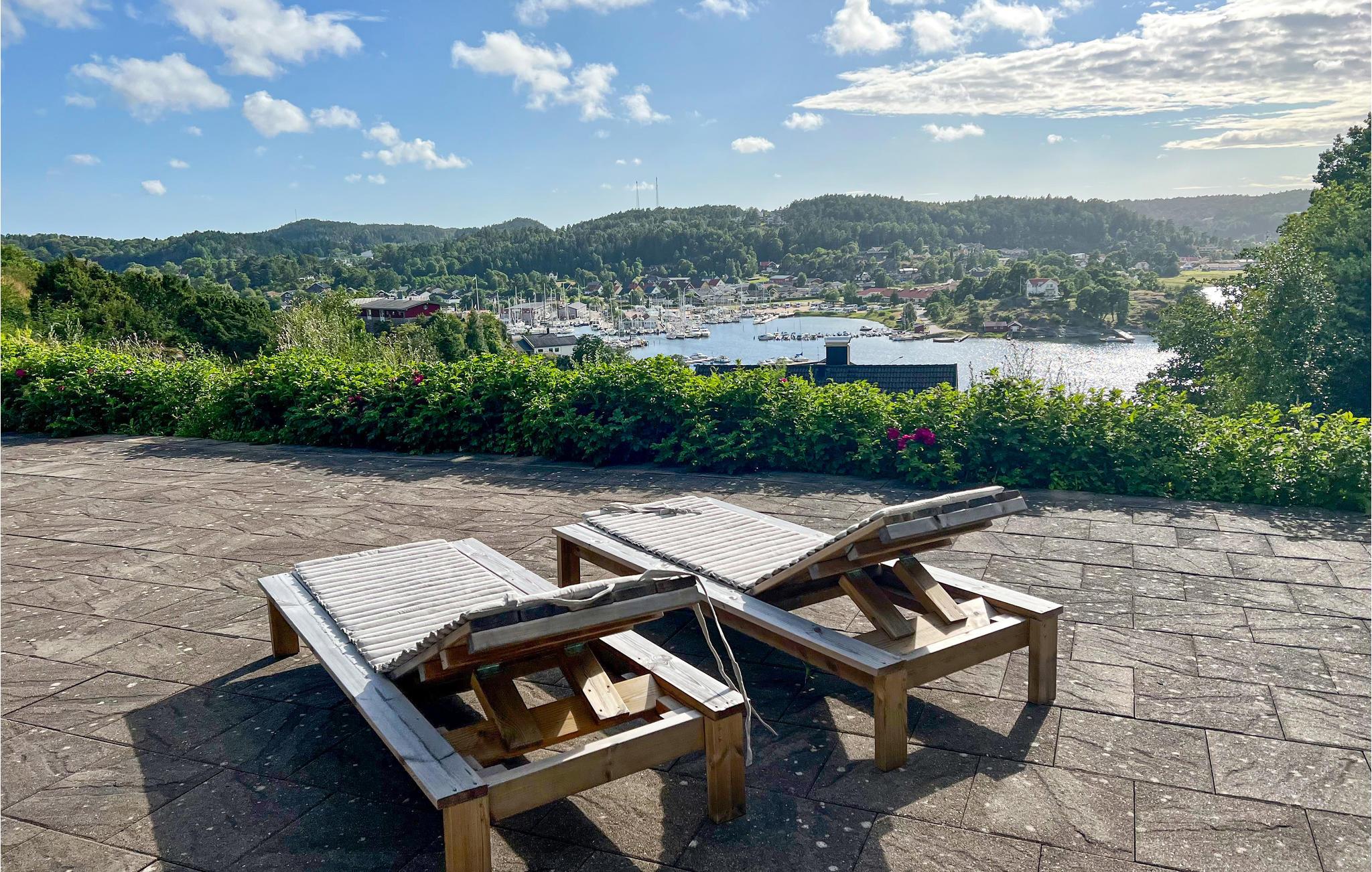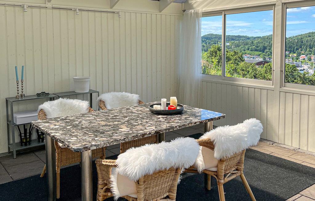 Dette feriehus ligger på en stor naturgrund nær Henån med god plads til sjov og leg. I det store spisekøkken er der brændeovn, som spreder behagelig varme på kølige dage og aftener. På den overdækkede terrasse med loungemøbler kan I nyde jeres måltider udendørs fra morgen til aften. På solrige dage kan I slænge jer i solstolene i den fælles have.