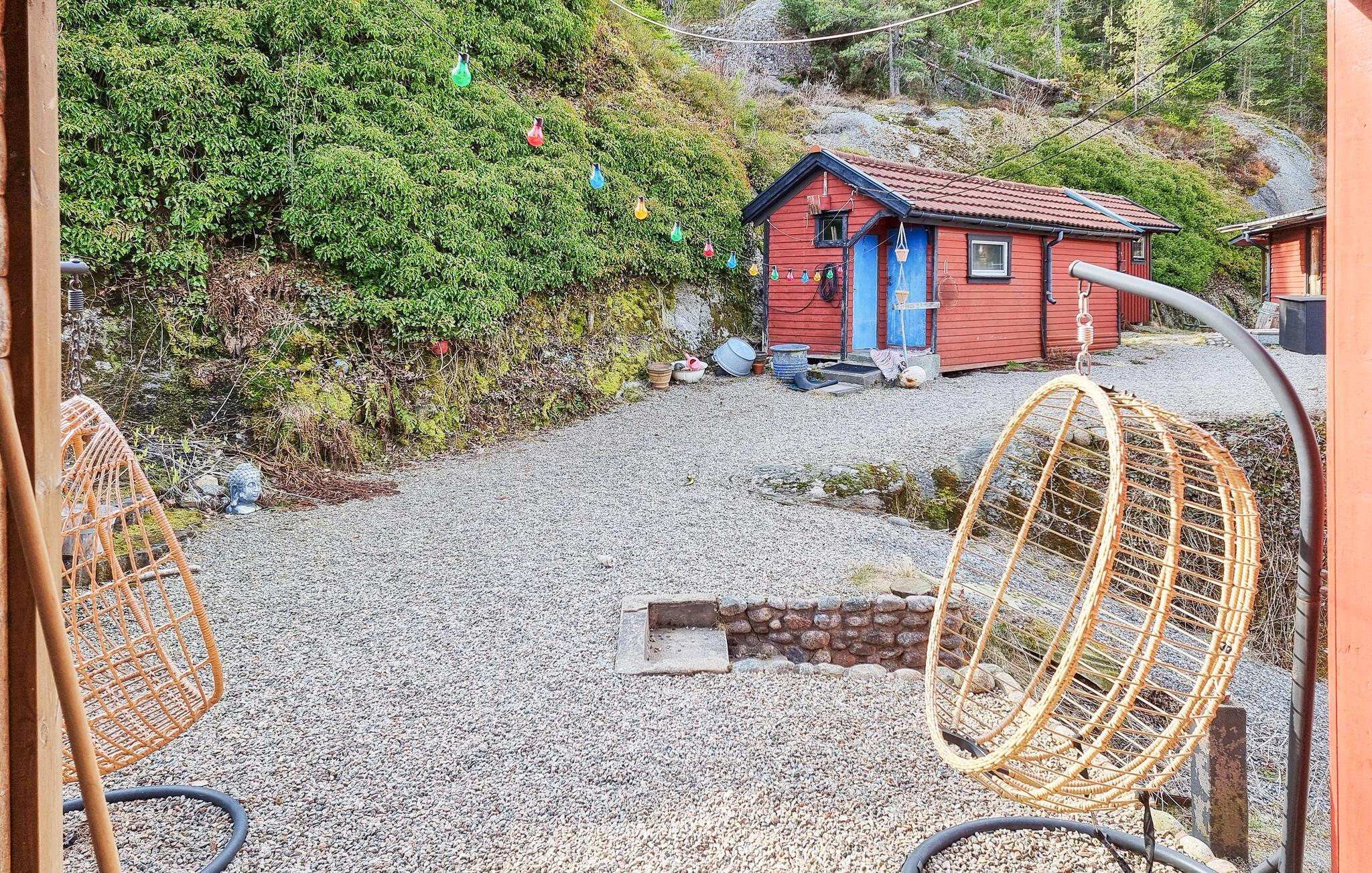 På den store hævede terrasse sidder I midt i naturen med udsigt til havet. Grill i det fri, slå jer ned i hængestolene, eller slap af med et glas vin ved bålpladsen. Udendørsområdet er flot integreret i det klippefyldte landskab og byder på mange skønne opholdssteder.