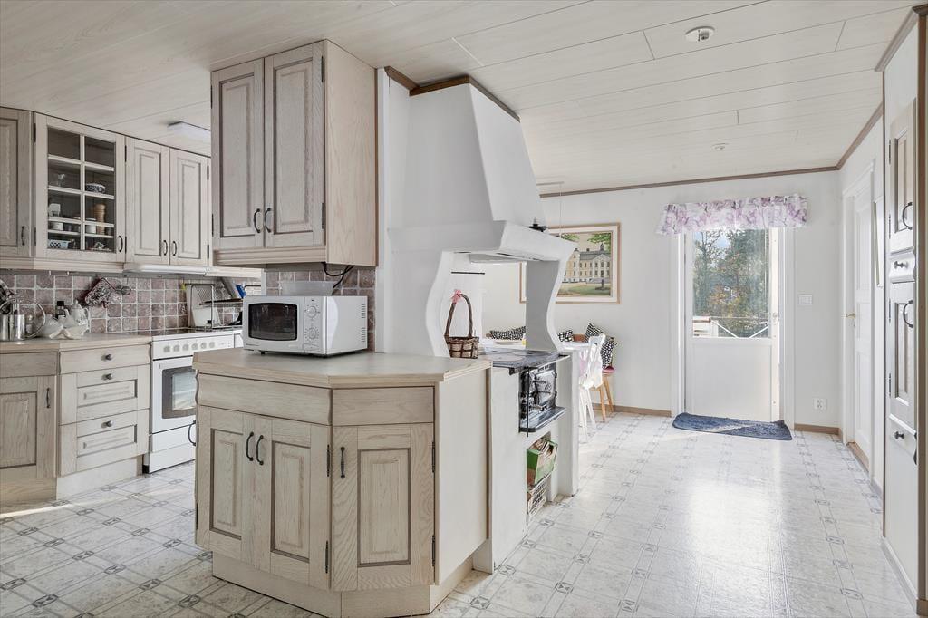 Fra en stor veranda kommer man ind i feriehuset på ca. 170 kvm. Fra entrén kommer man til det moderne køkken, der er bygget op omkring det gamle brændekomfur. Køkkenet er udstyret med elektrisk komfur med ovn og keramisk kogeplade, opvaskemaskine, mikrobølgeovn, kaffemaskine, køleskab med fryser og et lille spisebord. Fra køkkenet er der både adgang til bryggers, med vaskemaskine og tørretumbler, og til badeværelse med bruser, toilet og håndvask. Den rummelige opholdsstue er indrettet med en komfortabel sofa, kakkelovn og fladskærms-tv med valgfrie kanaler via Chromecast. Husets spisestue er indrettet med plads til 10 personer. Til venstre for spisestuen, med panoramaudsigt over Østersøen, ligger et soveværelse med dobbeltseng og et stort klædeskab. Til højre for spisestuen, er en udestue med glaselementer og en fantastisk udsigt, indrettet med havemøbler. Mellem stuen og spisestuen, overfor treppen til førstesalen, er der en stilfuld husbar med barstole og en skibsklokke. Den øverste etage, med en vidunderlig udsigt over Østersøen, byder på badeværelse med badekar og toilet, samt 3 værelser og et møbleret opholdsområde. Det ene værelse er indrettet med dobbeltseng, det andet værelse med to enkeltsenge, hvoraf den ene enkeltseng er 105 cm bred og den anden er 90 cm bred. Derudover er der nogle madresser som står gæsterne til rådighed, så de kan dele sovepladserne fleksibelt op. Der er i alt otte sovepladser i hovedhuset. I gæstehuset, som ligger få meter derfra, er der endnu et toilet og håndvask, og der er yderligere to senge. Der er ubegrænset internetadgang i huset, samt en kulgrill.
