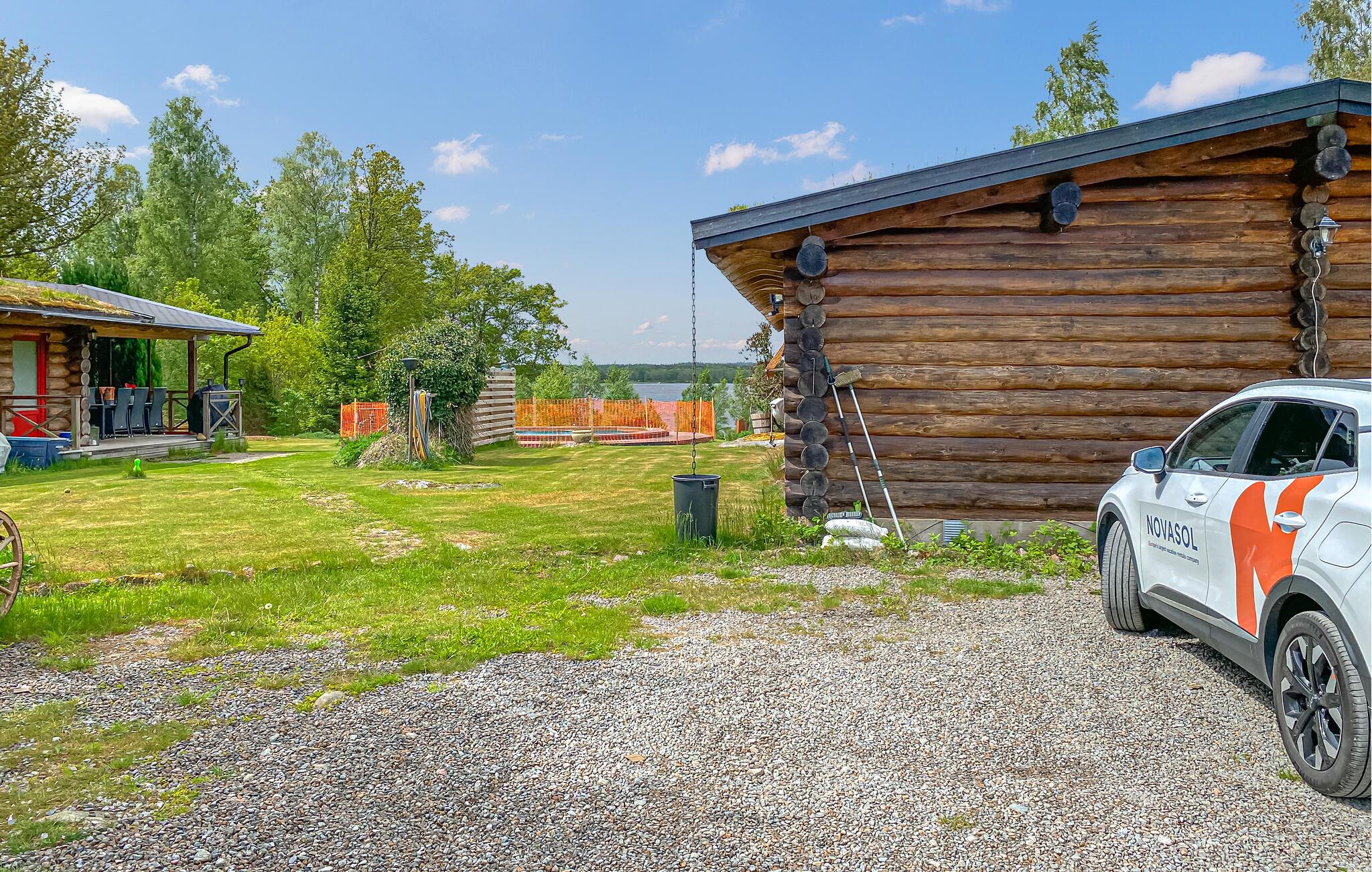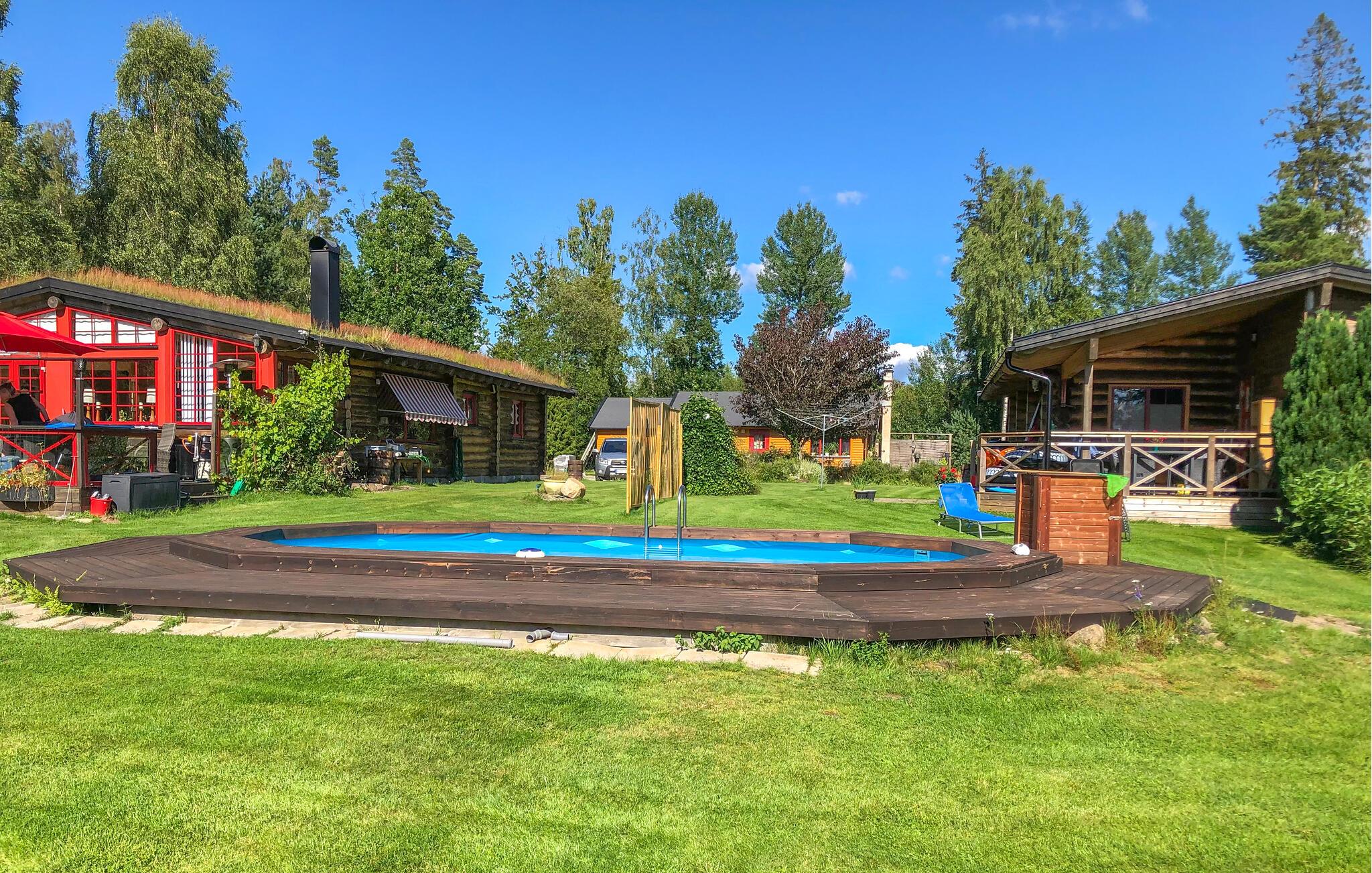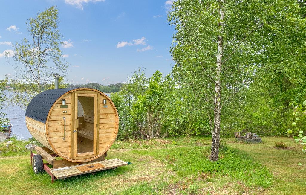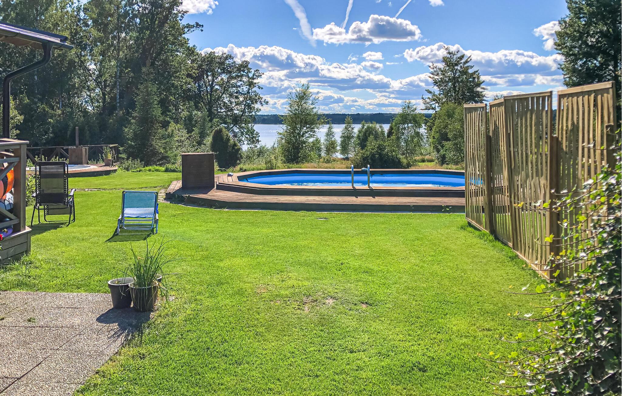 Brug det store fælles udendørsområde til lange timer i den friske luft. Tag en dukkert i poolen med træramme, eller gå direkte fra grunden ned til broen ved søen, hvor en båd venter på jer. Slap af i saunaen med panoramaudsigt over vandet, og nyd den fredelige stemning ved solnedgang. På den møblerede træterrasse kan I grille, spise og bare nyde roen.