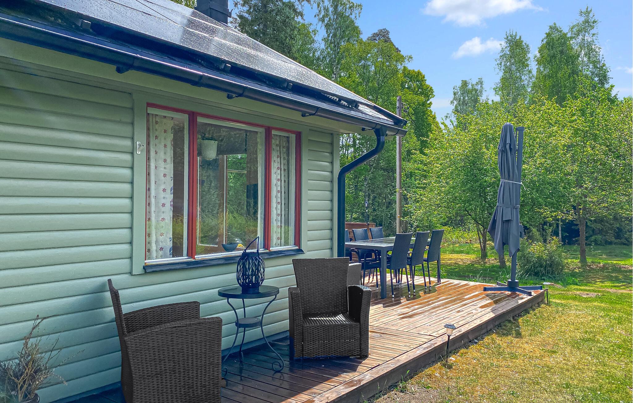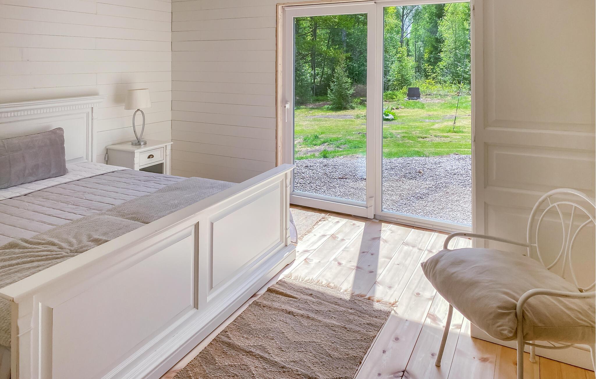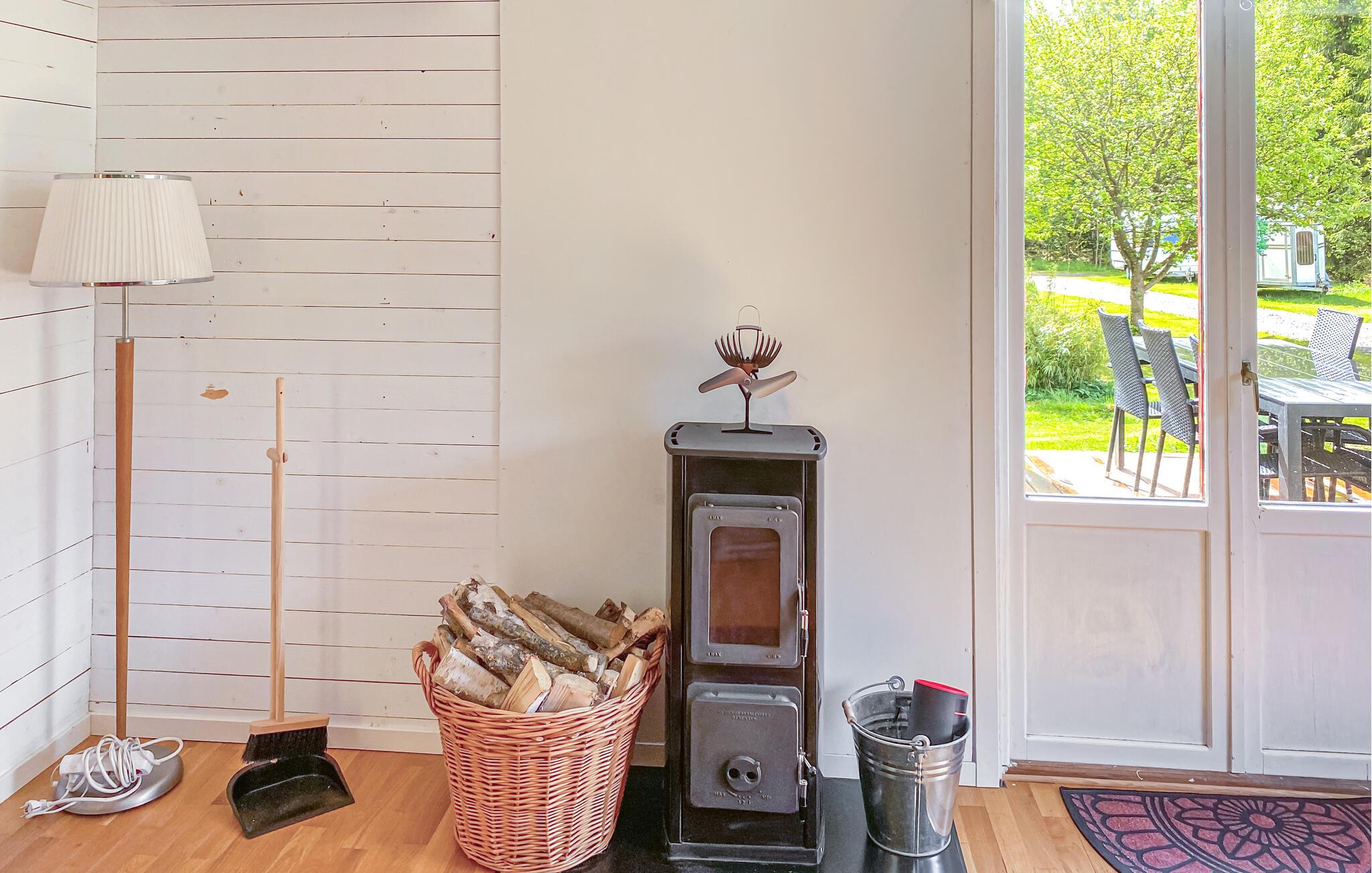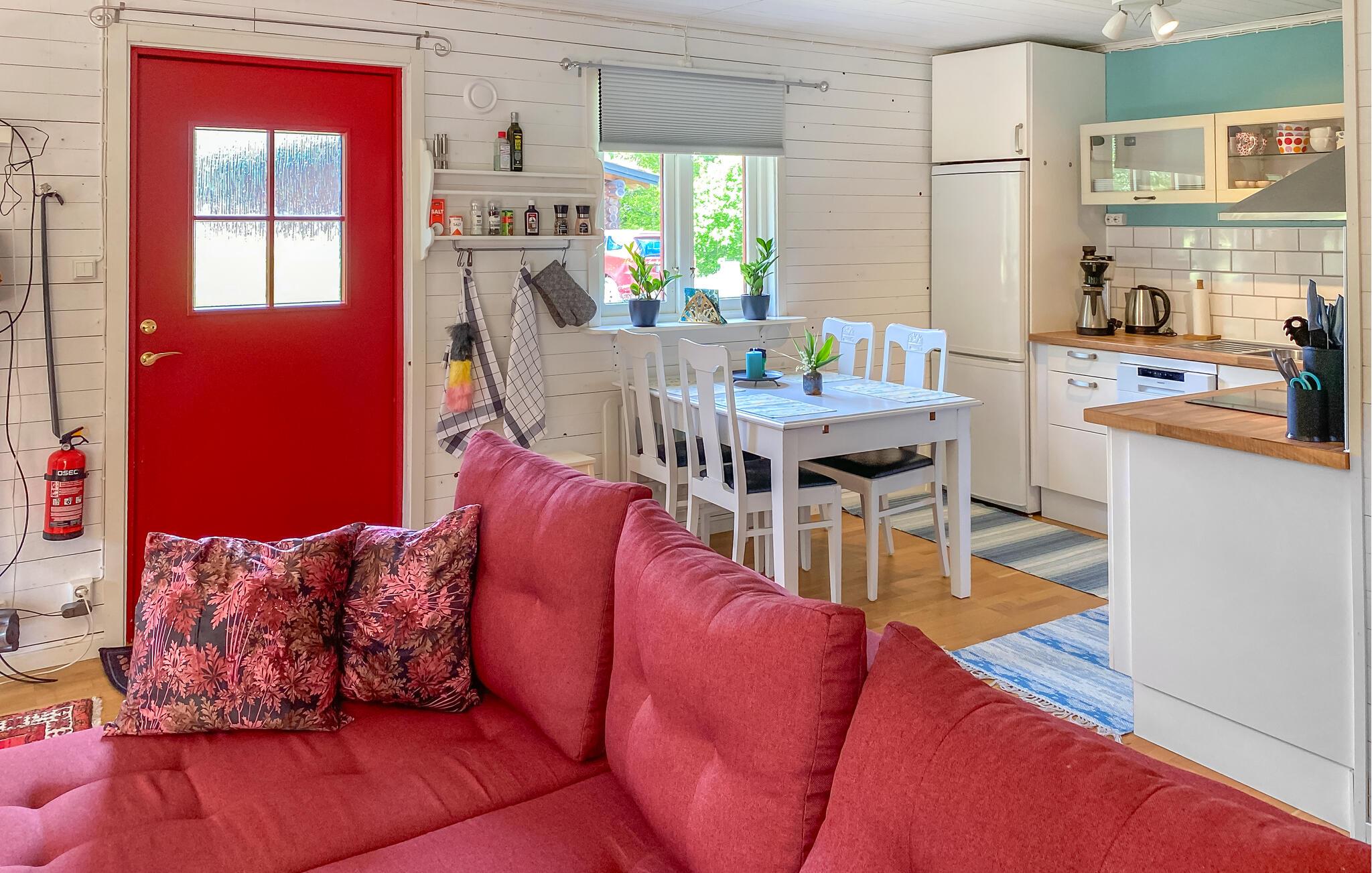 Jeres hyggelige feriehus ligger direkte ved søen Hönshyltefjorden og byder på ideelle betingelser for afslappende feriedage ved vandet. Indret jer i det smukt udformede interiør. Den åbne planløsning forbinder stue, spiseplads og køkken til en indbydende helhed. Læn jer tilbage i den bløde sofa, eller slap af i de komfortable lænestole. Nyd jeres måltider ved spisebordet ved siden af det praktisk indrettede køkken.