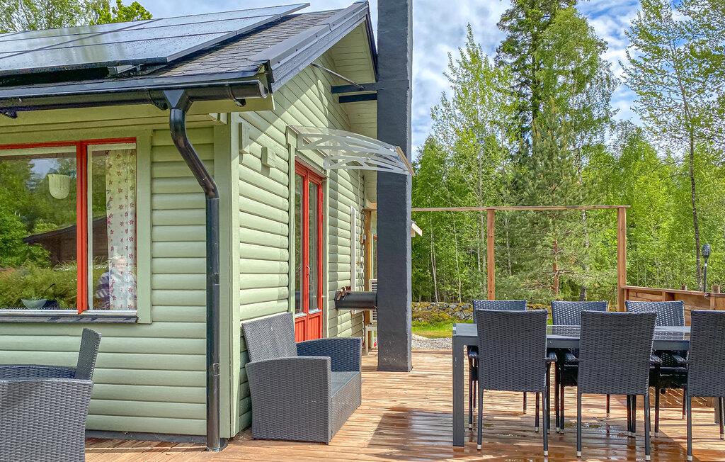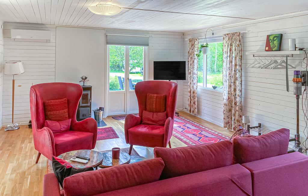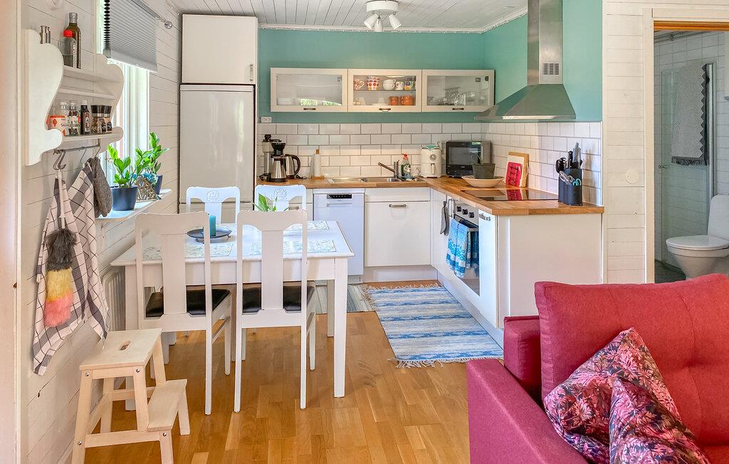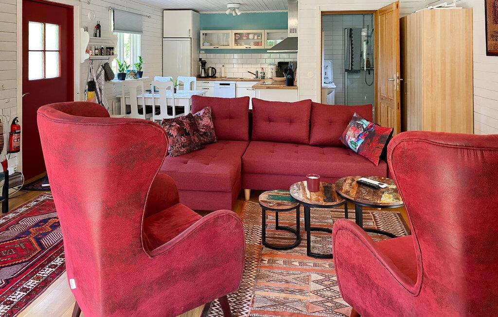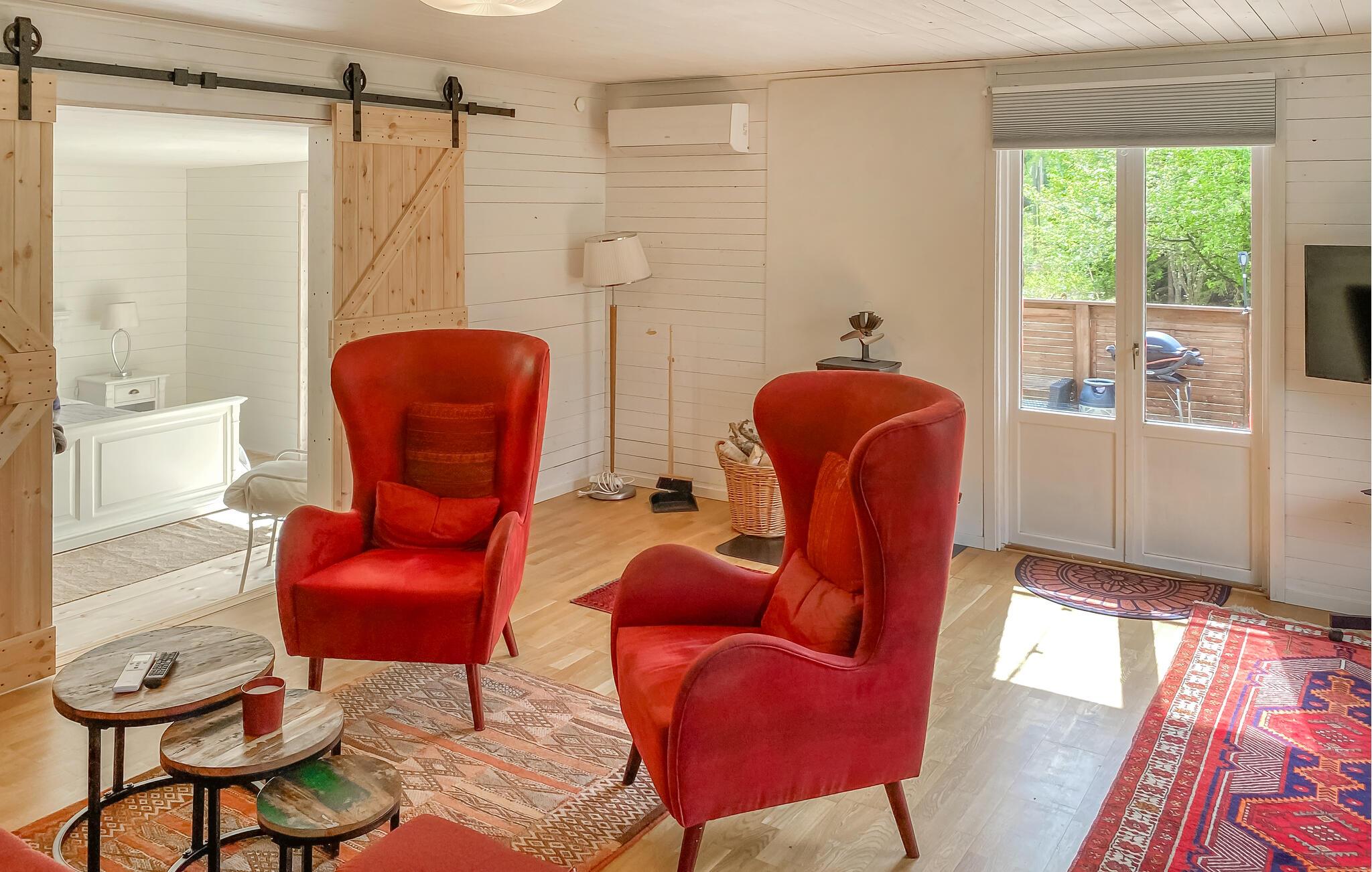 Jeres hyggelige feriehus ligger direkte ved søen Hönshyltefjorden og byder på ideelle betingelser for afslappende feriedage ved vandet. Indret jer i det smukt udformede interiør. Den åbne planløsning forbinder stue, spiseplads og køkken til en indbydende helhed. Læn jer tilbage i den bløde sofa, eller slap af i de komfortable lænestole. Nyd jeres måltider ved spisebordet ved siden af det praktisk indrettede køkken.