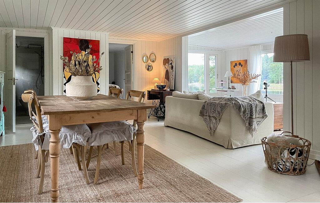 Nyd jeres tid i et smukt træhus, hvis beliggenhed ved søen byder på fred og afslapning. Gør jer til rette i den lyse opholdsstue, hvis store vinduer tilbyder en vidtstrakt udsigt over søen. Læn jer tilbage i sofaen, læs en bog eller brug tid sammen ved spisebordet. Brug det moderne køkken med rigelig bordplads og apparater af høj kvalitet til at lave mad sammen og tilberede regionale specialiteter.