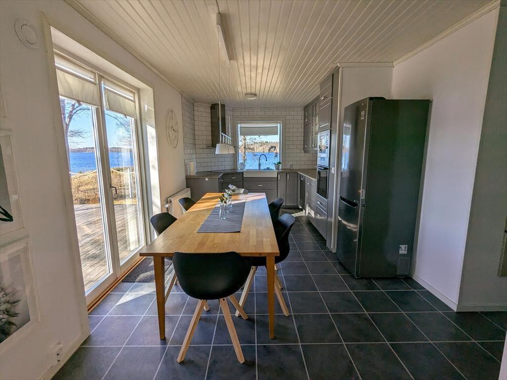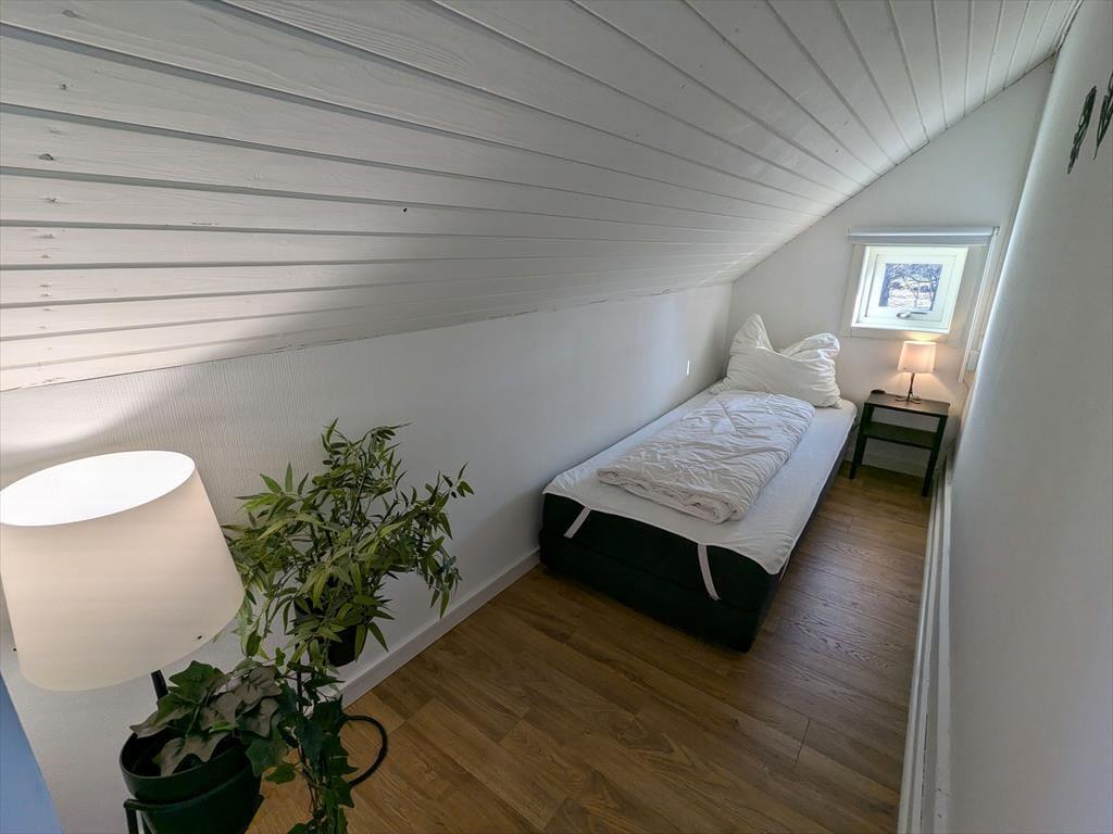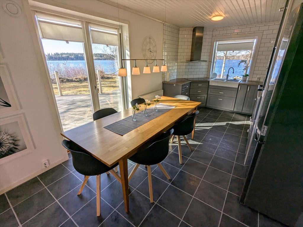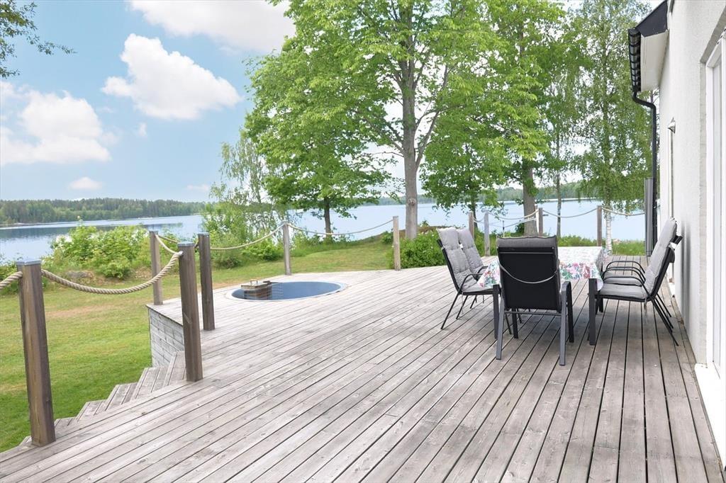 Med et boligareal på 107 m² tilbyder dette hus, der blev bygget i 1965, totalrenoveret og med fuld kælder, mere end nok plads til seks feriegæster. To kæledyr er også velkomne. I den store, lyse stue, der er åbent forbundet med spisebordet og køkkenet, finder du to moderne polstrede sofagrupper foran brændeovnen og foran fladskærms-tv'et. Både fra stuen og fra køkkenet kan du nyde en fantastisk udsigt over søen. Det moderne køkken er udstyret med elkomfur, ovn, emhætte, køleskab og fryser, opvaskemaskine, kaffemaskine og elkedel. Et af de i alt fire soveværelser ligger også i stueetagen og er indrettet med en dobbeltseng. Fra køkkenet kommer du også direkte ud på den store træterrasse. Praktisk nok er der også et gæstetoilet med håndvask i stueetagen. To yderligere soveværelser, begge med dobbeltsenge og udsigt over søen, samt et badeværelse med brusebad og toilet ligger på øverste etage af huset. Det fjerde soveværelse, der er indrettet med en enkeltseng, ligger i et skråloft, der er tilgængeligt fra gangen. På trods af de i alt syv tilgængelige sovepladser ønsker ejerne kun at have maksimalt seks gæster. Der er også internetadgang med mere end 100 Mbit samt vaskemaskine og tørretumbler i kælderen. Huset kan opvarmes centralt ved hjælp af en varmepumpe. En rummelig træterrasse med havemøbler og udsigt over søen samt en træopvarmet hot tub, der kan bruges året rundt, er prikken over i'et på dette fantastiske hus ved søen.