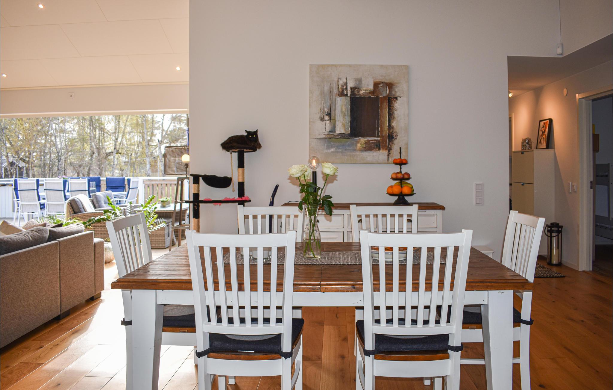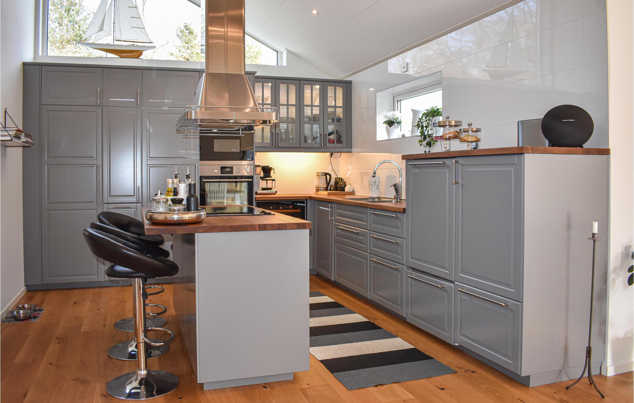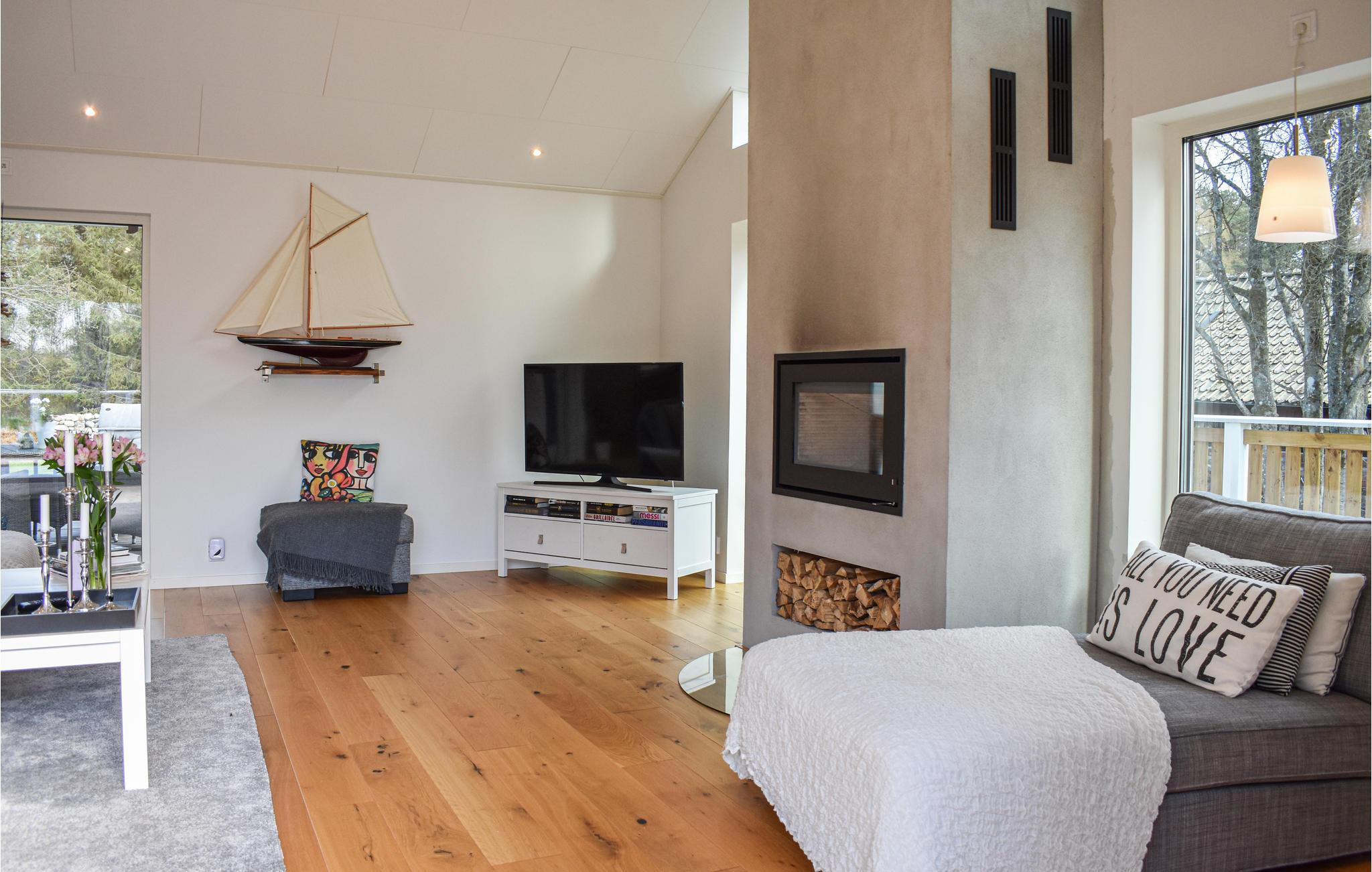 Huset er moderne og komfortabelt indrettet og byder på tre soveværelser og to badeværelser for op til otte personer. To kæledyr er også velkomne. Der er gulvvarme i hele huset, og på kølige aftener kan I sætte jer til rette foran brændeovnen.