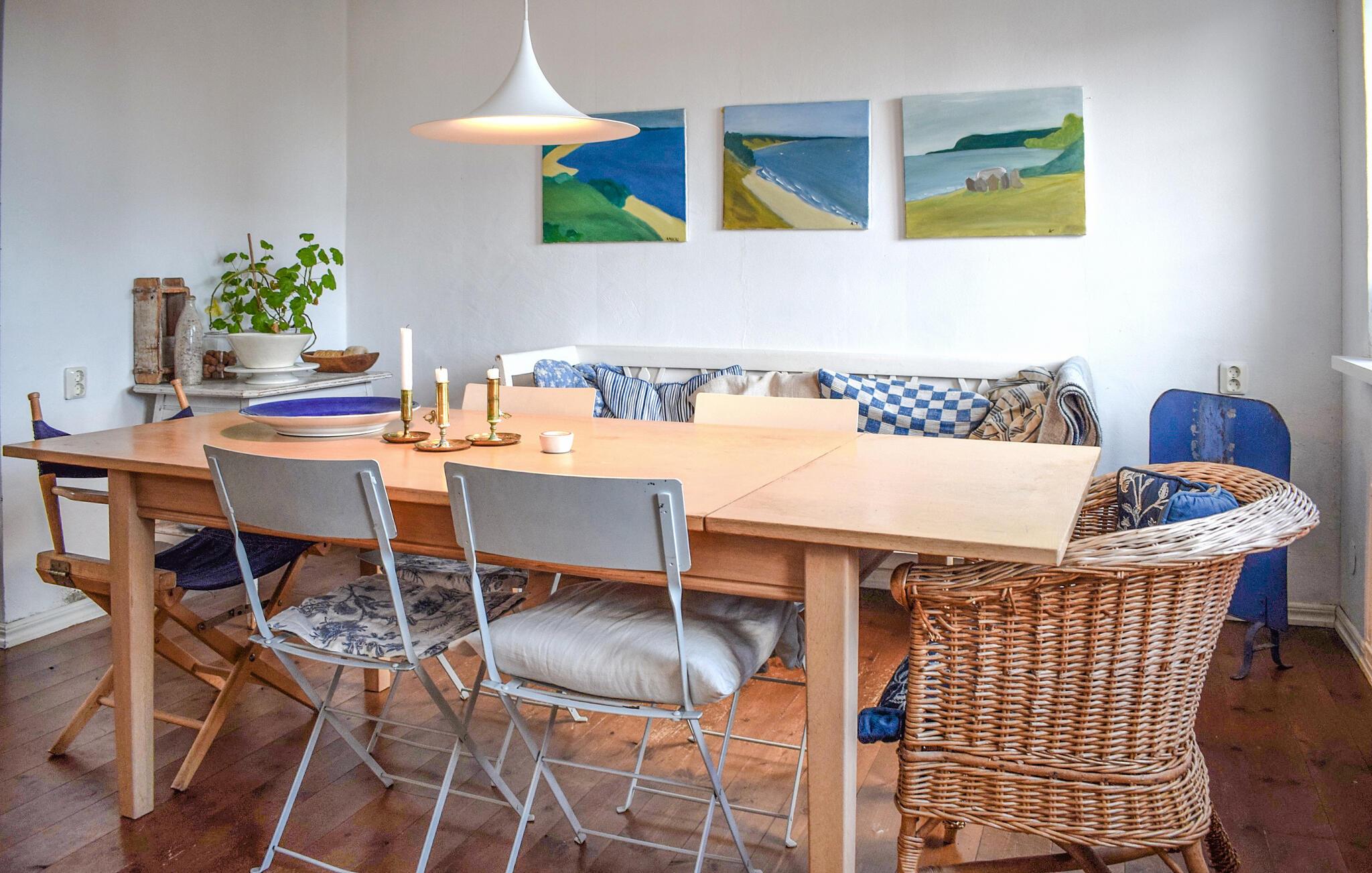 Genoplad batterierne i dette hyggelige feriehus nær havet. Huset er perfekt til en afslappende pause fra hverdagen. Smukke trædetaljer, en behagelig sofa og omhyggeligt udvalgte detaljer skaber en atmosfære, hvor I hurtigt vil føle jer hjemme. Tilbring en hyggelig filmaften, spil kort med børnene, eller lav lækre måltider i køkkenet. Nyd jeres første morgenkaffe med udsigt over havet, og mærk den blide brise, der blæser ind fra vandet. Nyd en afslappet morgenmad i haven, og slap derefter af med jeres ferielæsning. På lune sommeraftener kan I tænde op i grillen, og dagen kan I afslutte dagen med et afslappet måltid udenfor. Gå en tur langs den kilometerlange sandstrand, der er ideel til svømning, gåture og afslappende dage ved havet. Oplev Österlens smukke natur med steder som Stenshuvud, Haväng og Knäbäckshusen, samt regionens mange gårdbutikker, caféer og æbleplantager. Tag en tur til Kivik med det berømte marked, eller tag en tur med drænings- eller damptoget gennem Österlen.