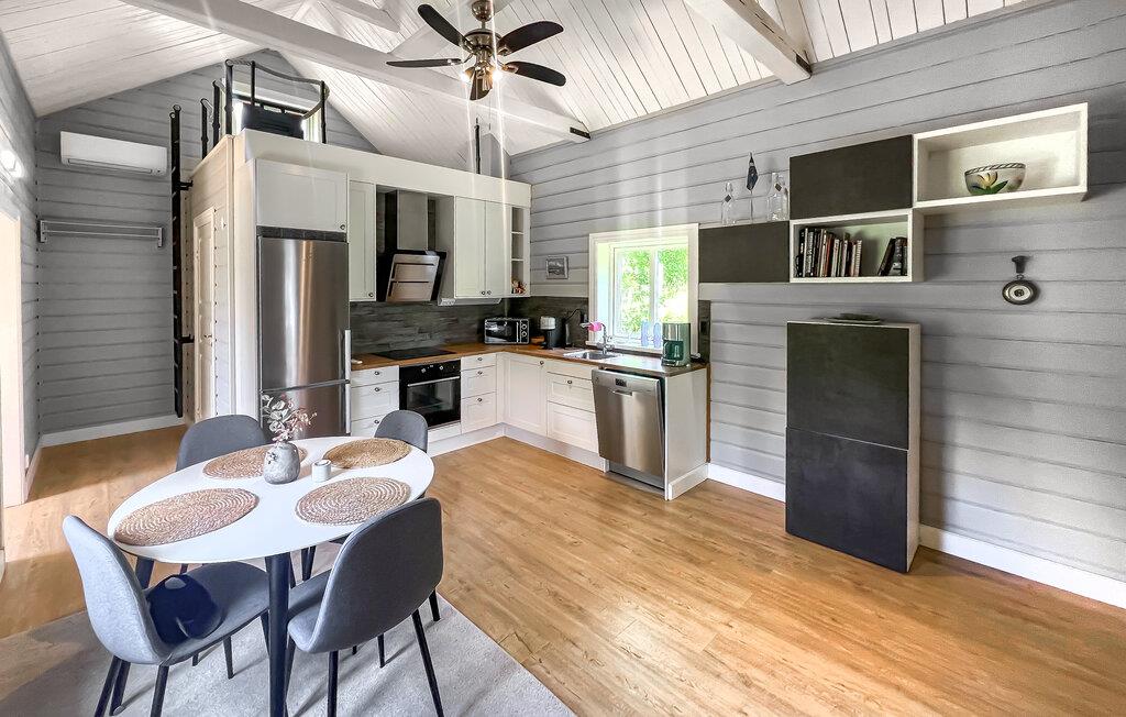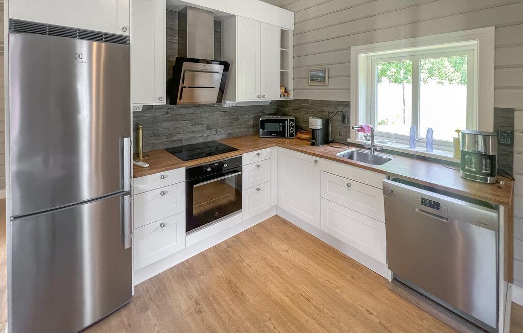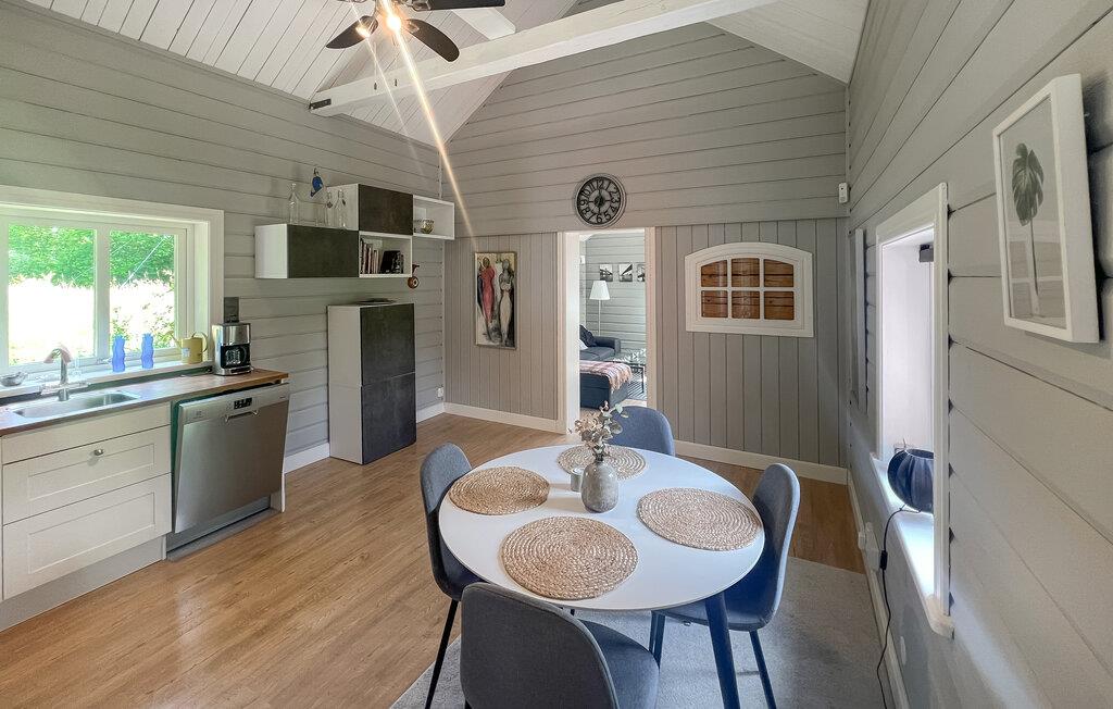 Feriehuset med moderne tilbygning ligger på en stor grund med udsigt til skov og marker. Det moderne køkken er veludstyret og byder på masser af plads til at lave mad og spise sammen. Fra køkkenområdet kommer I ind i den hyggelige stue, som er udstyret med en sovesofa og et sofabord og lægger op til afslappende aftener. Den rummelige veranda giver den perfekte mulighed for at begynde dagene med morgenmad udenfor eller nyde aftenen i den friske luft. Den velholdte græsplæne foran verandaen lægger op til at nyde forskellige udendørsaktiviteter som petanque.