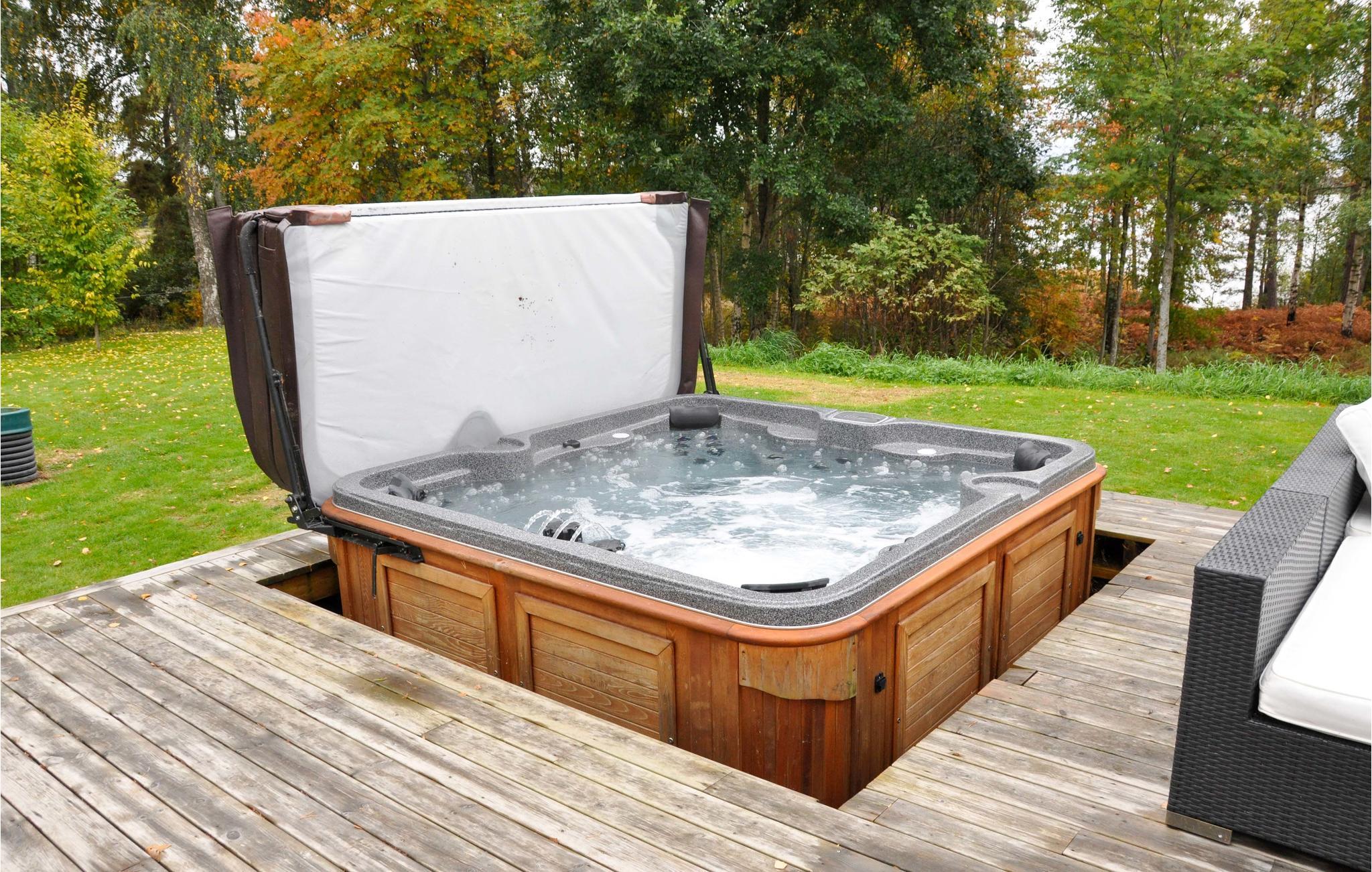 Den store skønne terrasse med udekøkken lægger op til madlavning og grill i det fri. Mens nogle passer grillen, kan de andre finde sig godt til rette i spabadet med saltvand.