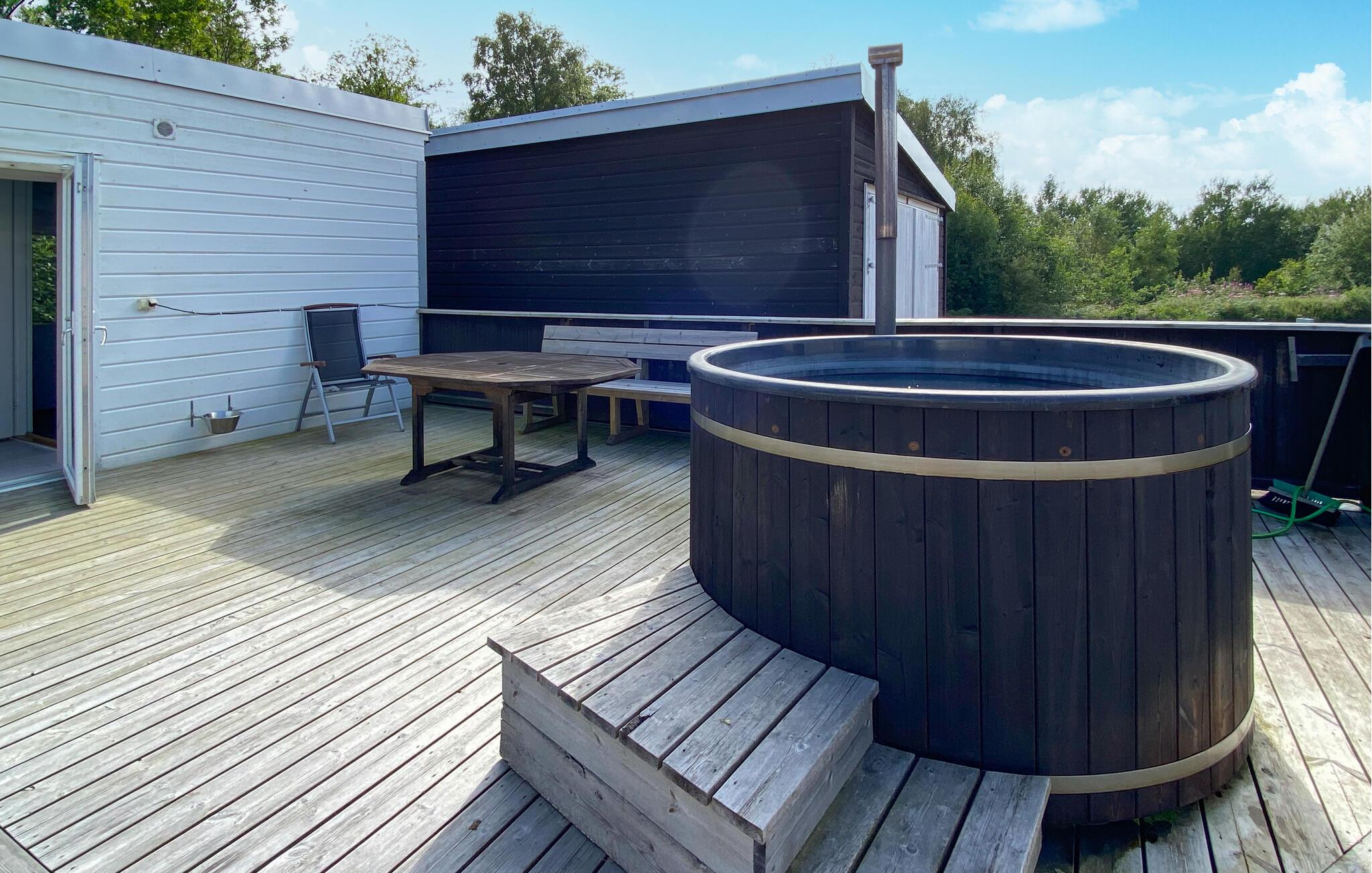Slap af i dette store feriehus med brændefyret spabad og træsauna.