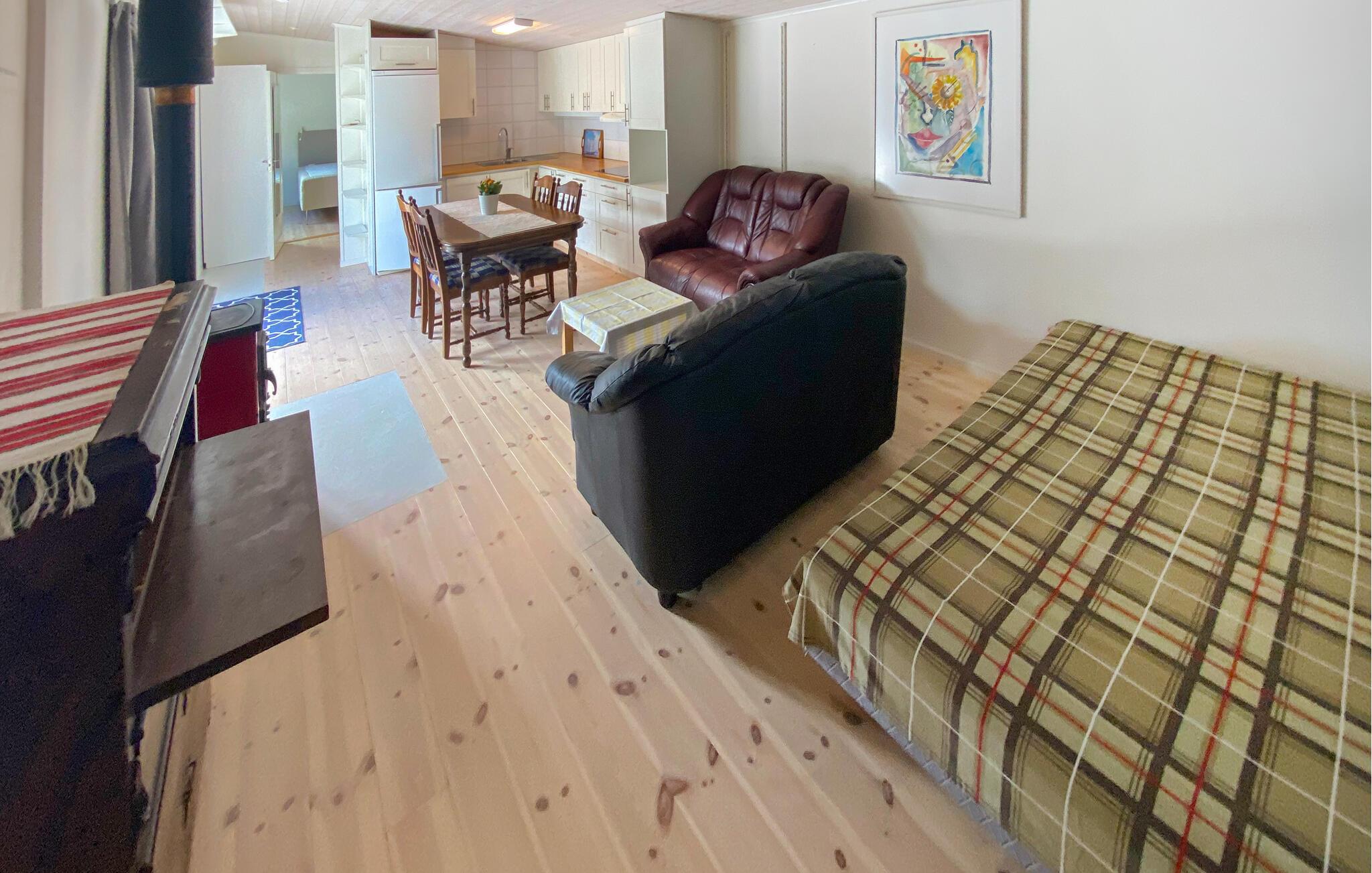 Rejs hertil og tilbring en afslappende ferie med jeres storfamilie eller en vennefamilie. Husejeren tager imod jer og vil vise jer husets fordele. I kan glæde jer til to separate boligenheder, hver med køkken og praktisk opholdsrum samt den rummelige træsauna og det brændefyrede spabad på terrassen. Den store terrasse ligger i en privat gårdhave, som er omgivet af bygningens dele. Sæt jer med jeres morgenkaffe på terrassen eller leg med jeres børn på græsplænen.