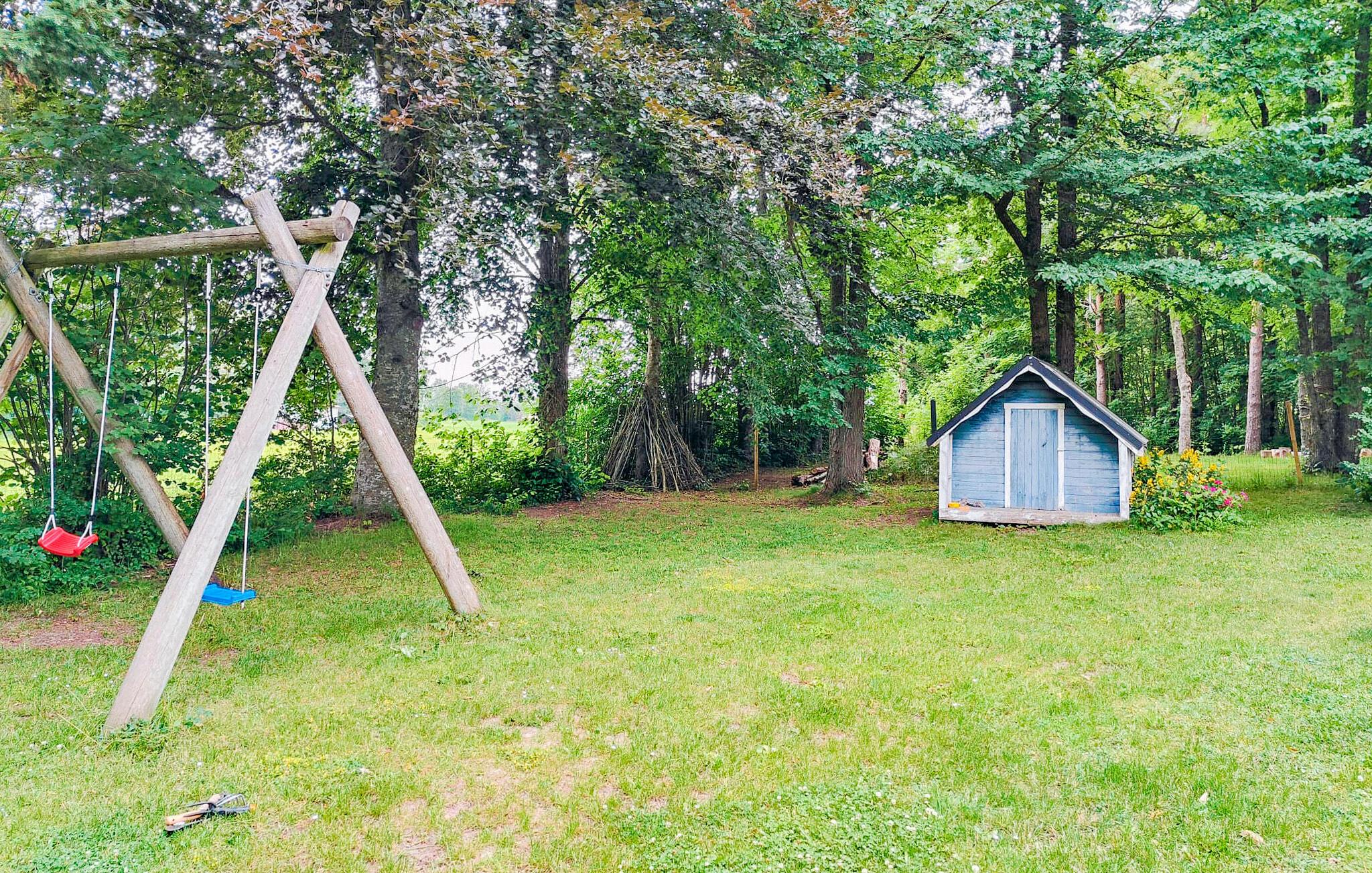 Træd udenfor og slap af i den rummelige, grønne have omgivet af høje træer. Børnene kan lege frit her, mens I nyder freden og roen.