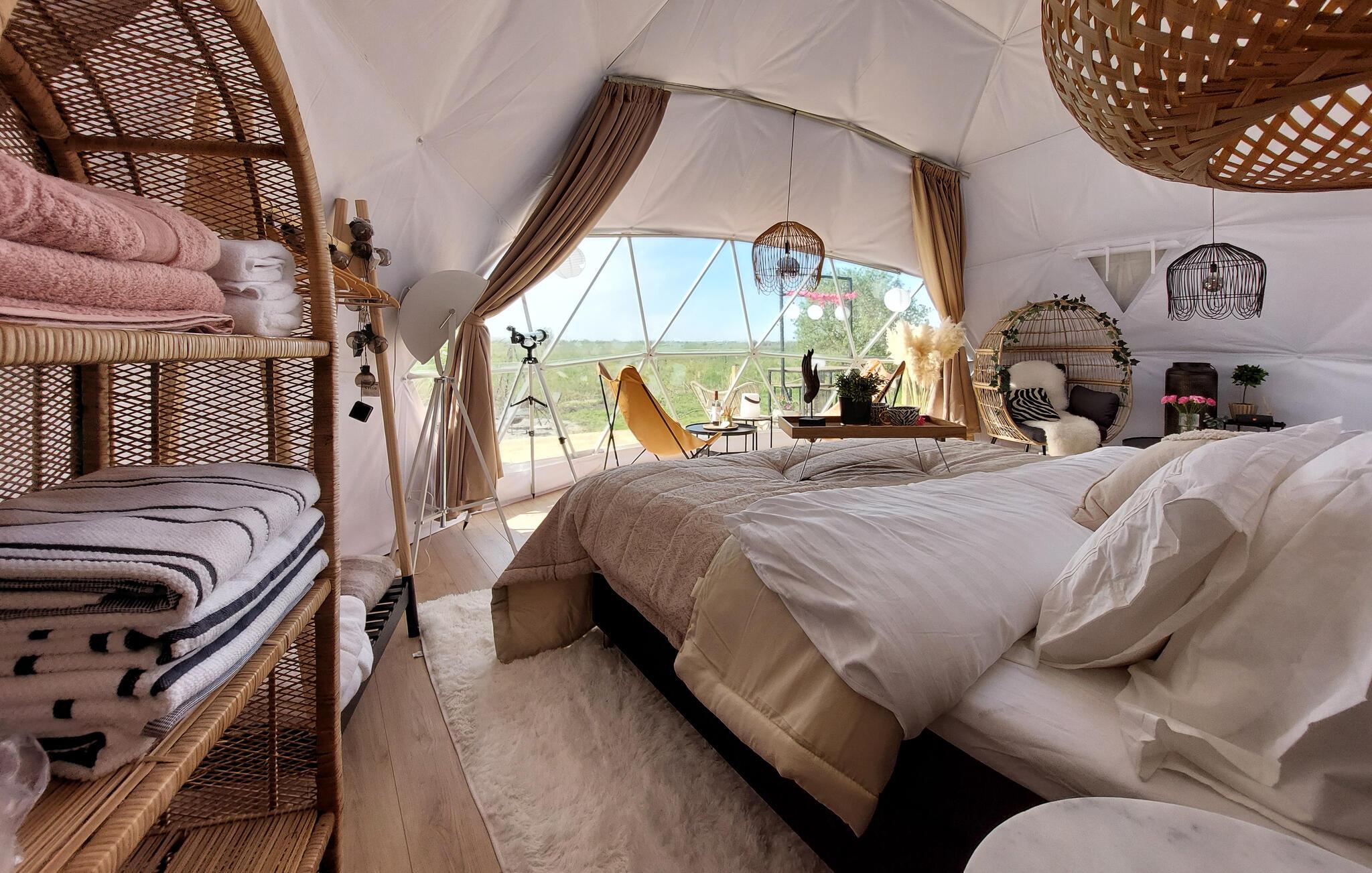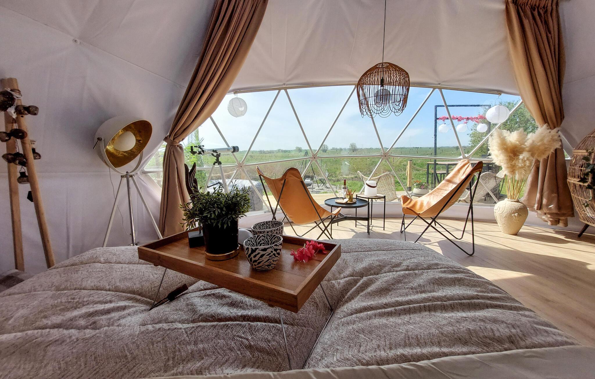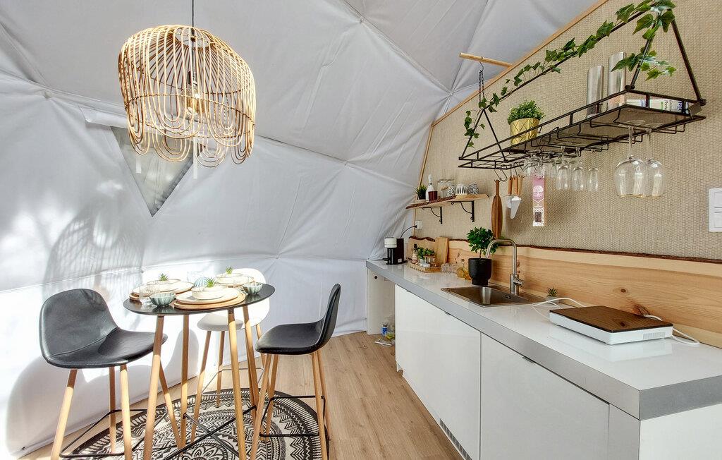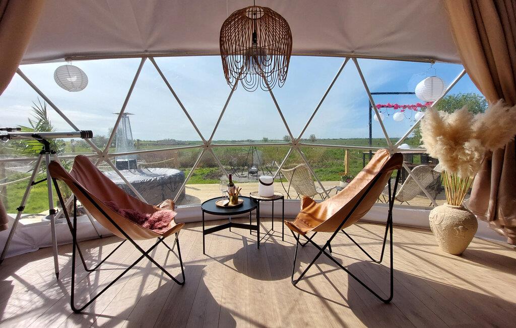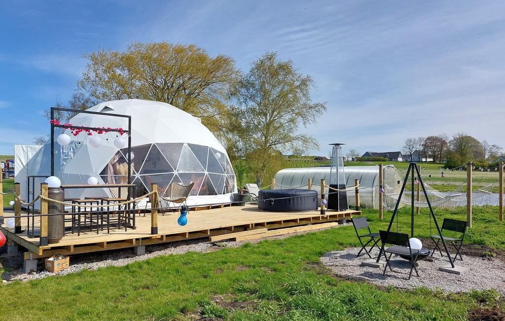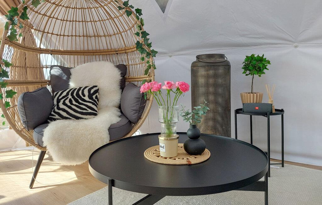 Hvis I er på udkig efter en ferieoplevelse ud over det sædvanlige, og vil I gerne opleve naturen fra allernærmeste hold, er I kommet til det helt rette sted. Denne bolig er en såkaldt Glamping Dome, der på utrolig vellykket vis forener komfort og camping og skaber en helhedsoplevelse, I sent vil glemme. Indvendigt emmer det af hygge med finurlige udsmkningsdetaljer og en vidunderlig udsigt, som kan nydes fra de behagelige hængestole med en god bog eller en kop kaffe fra morgenstunden.