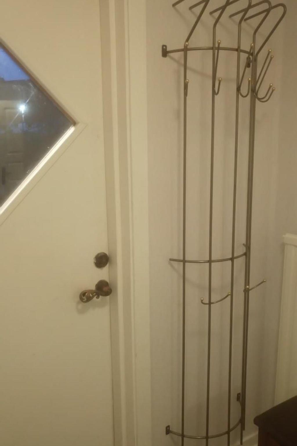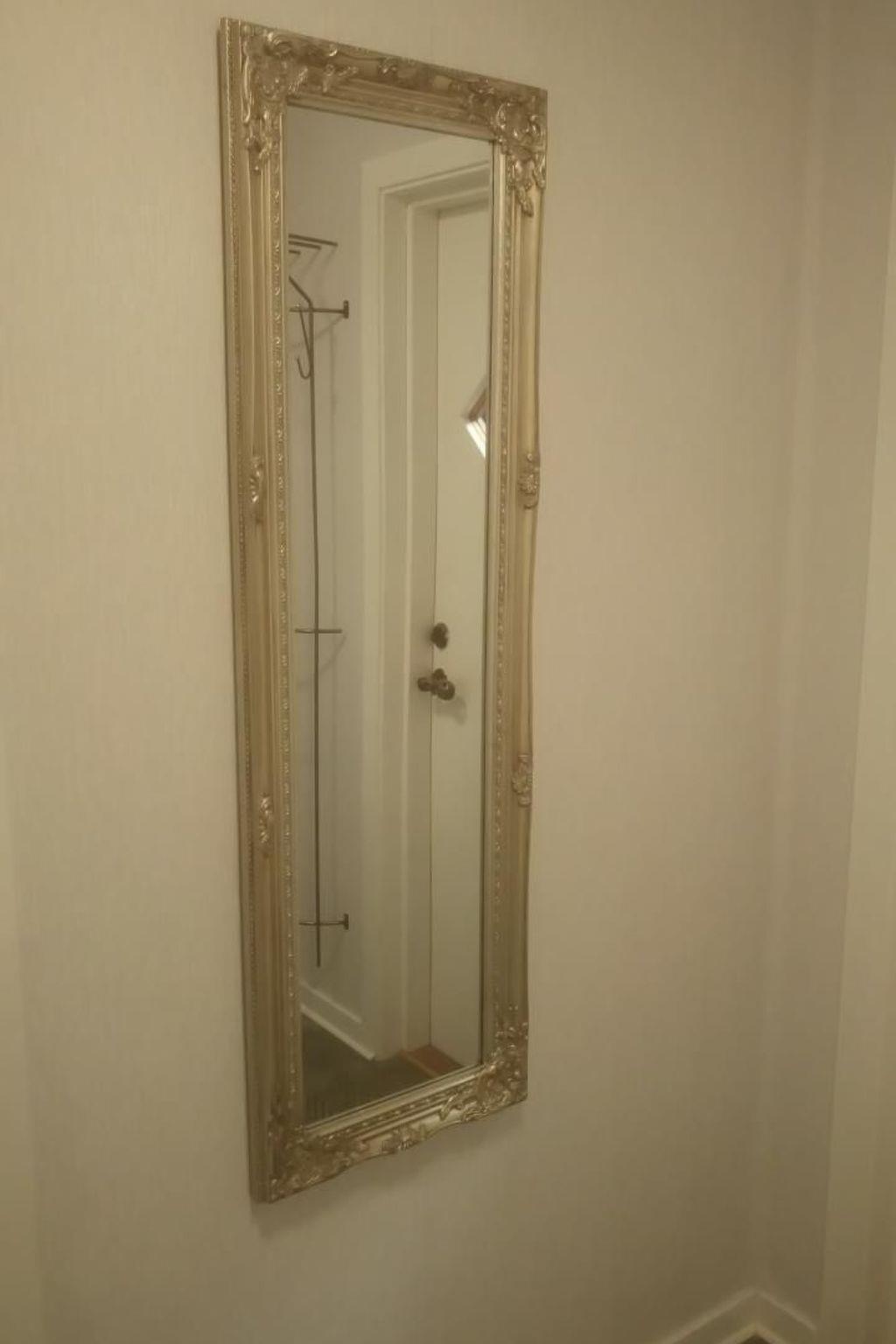 The entrance to the house, which is accessed by a few steps up, leads to a small hallway with a mirror, a coat rack and a small stool. To the left is a modern kitchen connected to a small pantry.