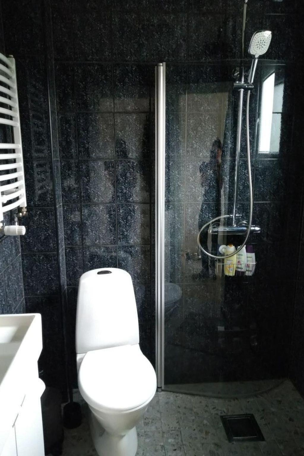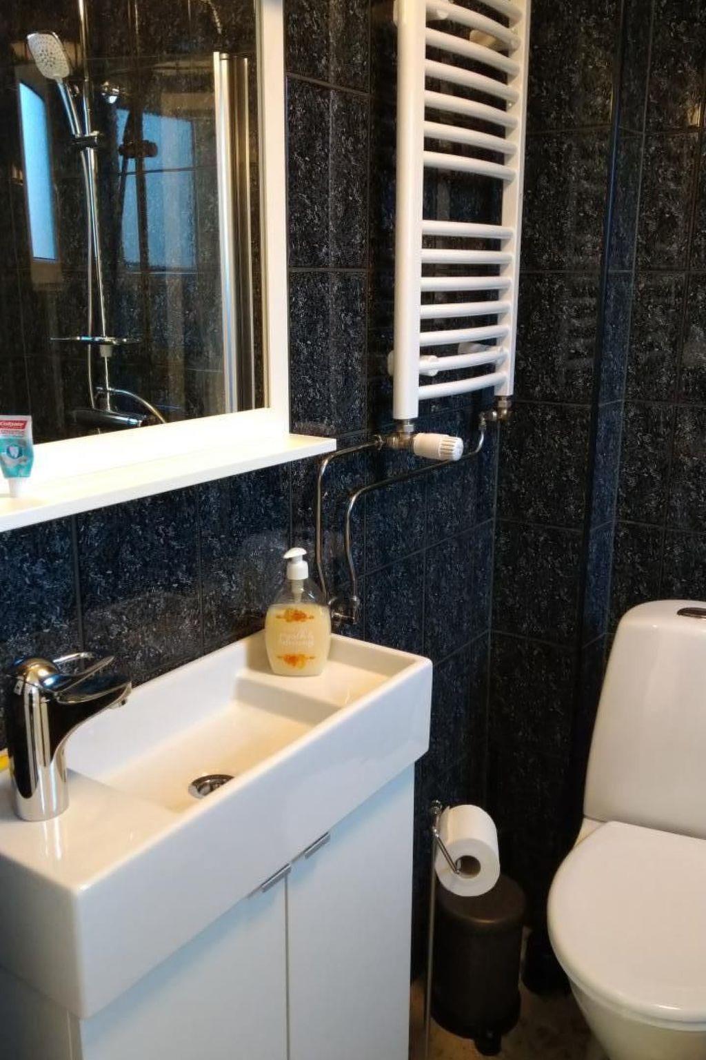 From the corridor you reach the bathroom. It is functionally furnished and equipped with a toilet, sink, shower and washing machine.