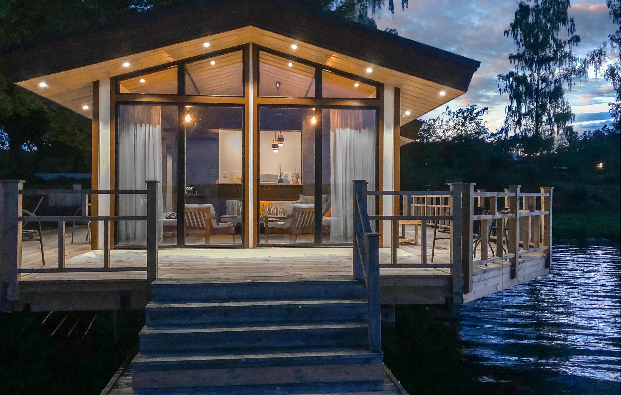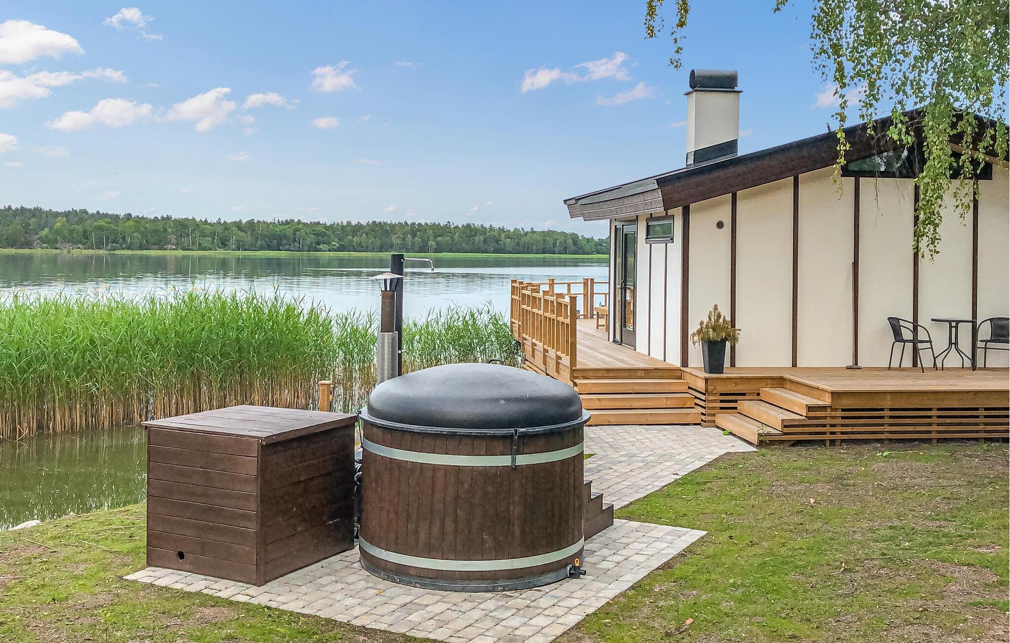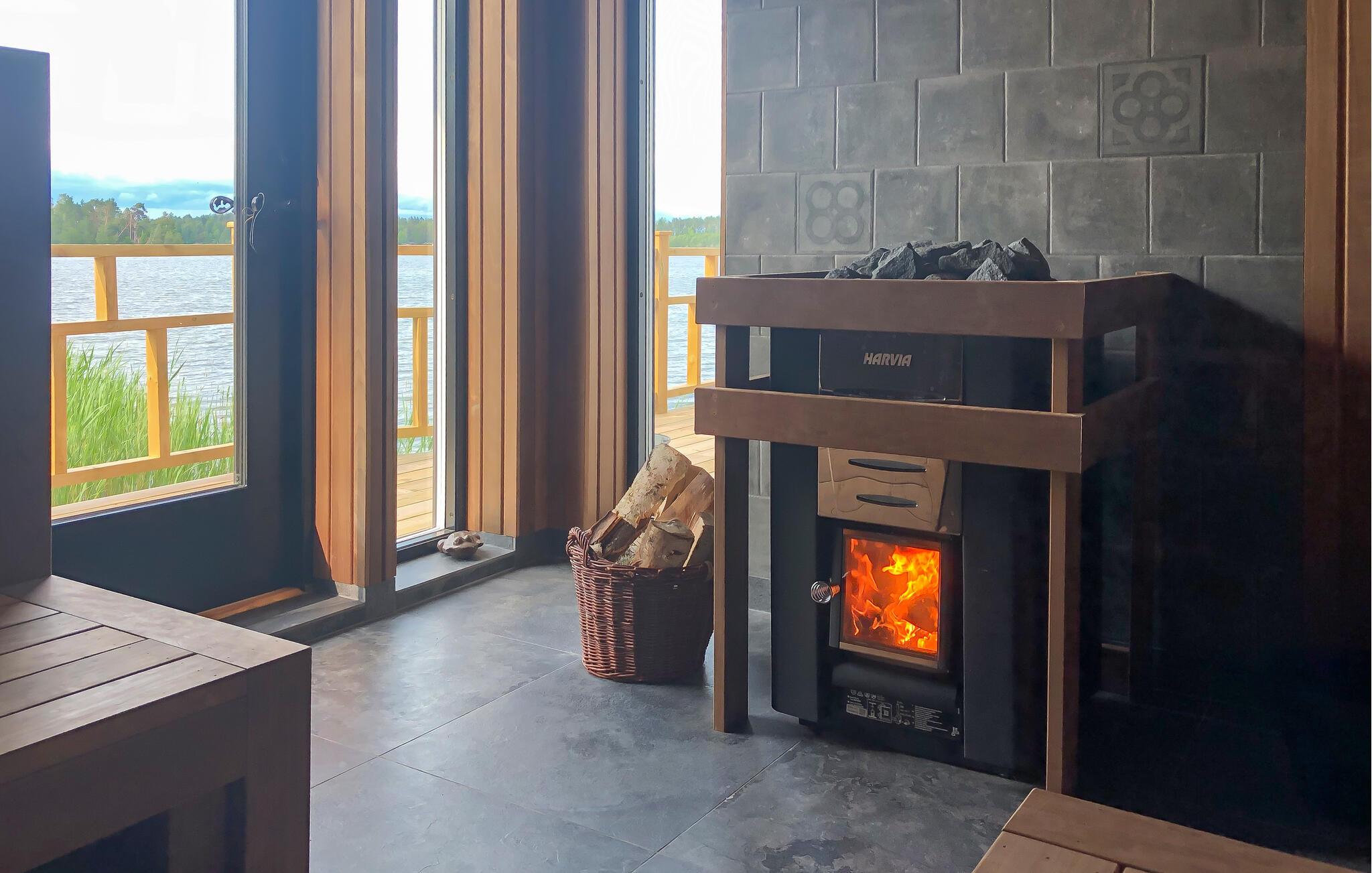 Den store, overdækkede, sydvendte terrasse med betagende panoramaudsigt over vandet er ideel til afslapning. En rummelig træterrasse forbinder huset med saunaen, som tilbyder masser af plads til afslapning. Der er også et køleskab til forfriskninger. Udenfor finder I et brændefyret spabad og et forfriskende udendørs brusebad.