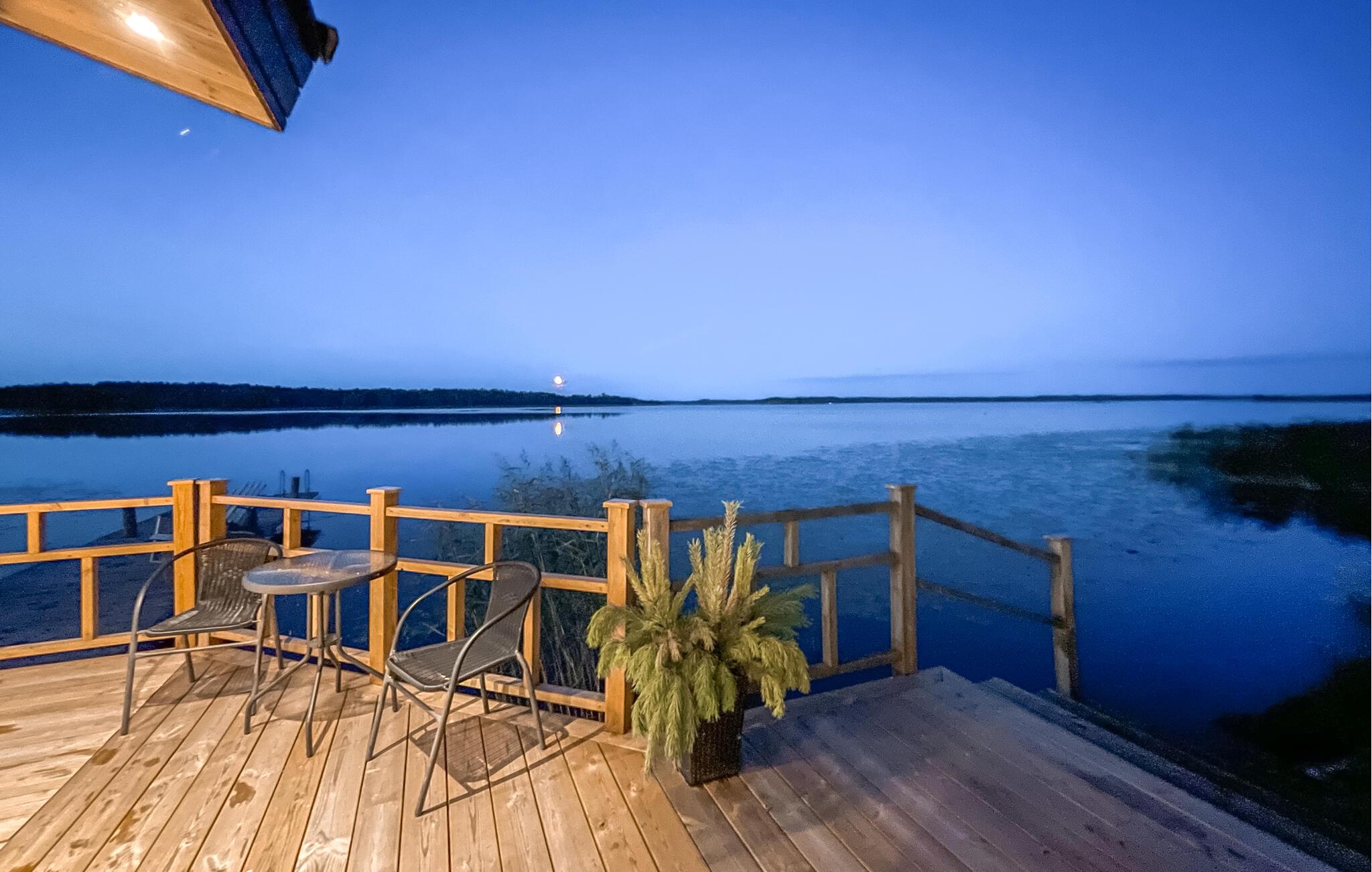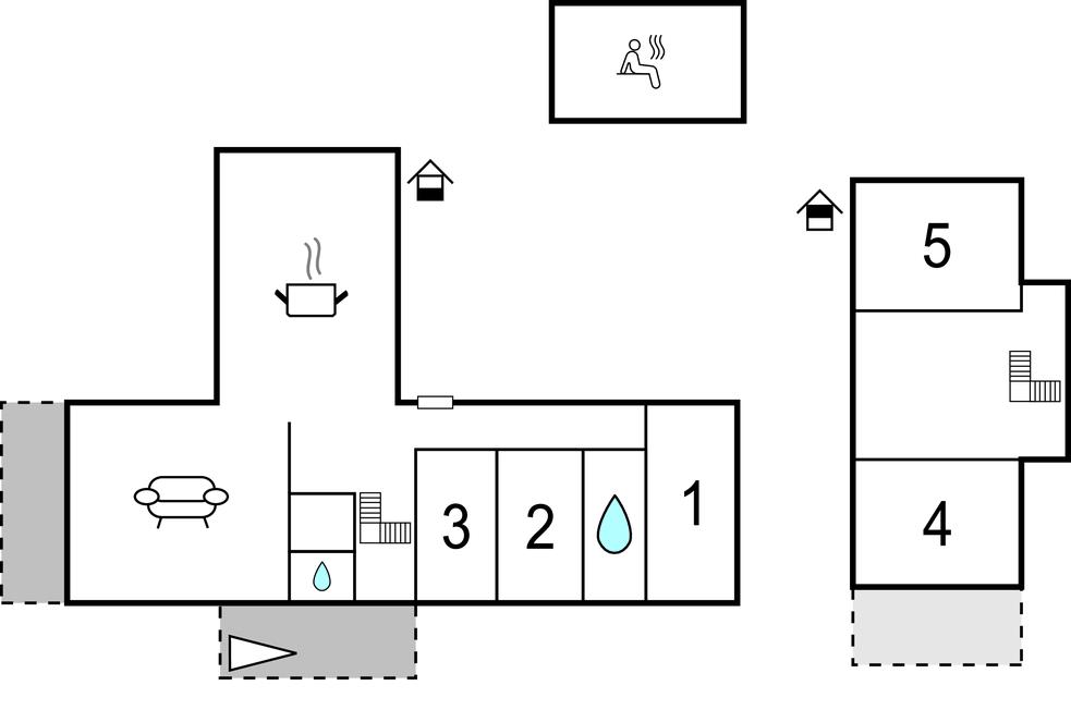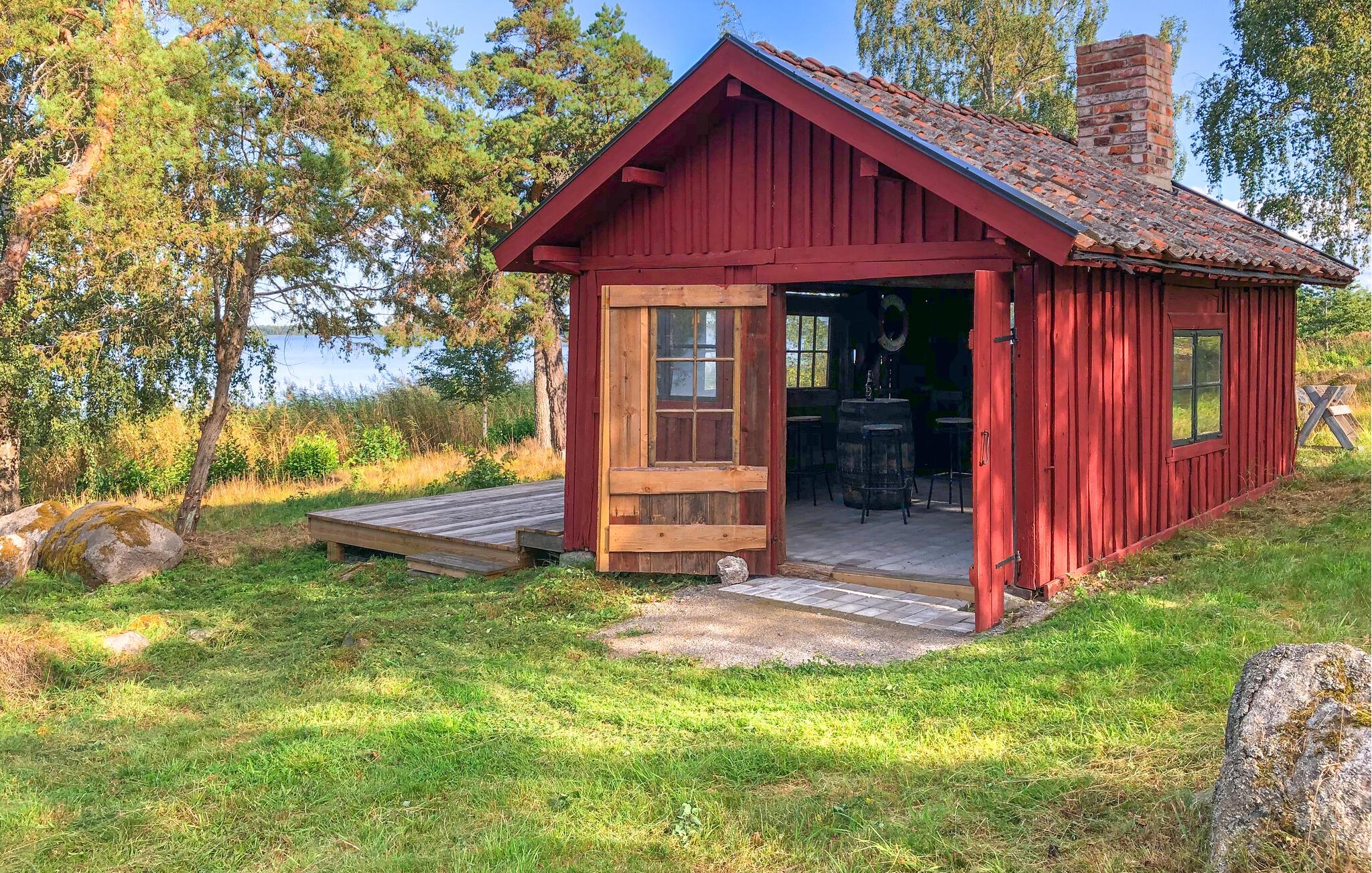 Den store, overdækkede, sydvendte terrasse med betagende panoramaudsigt over vandet er ideel til afslapning. En rummelig træterrasse forbinder huset med saunaen, som tilbyder masser af plads til afslapning. Der er også et køleskab til forfriskninger. Udenfor finder I et brændefyret spabad og et forfriskende udendørs brusebad.
