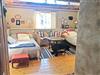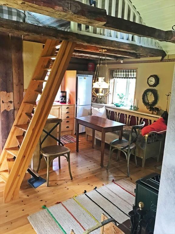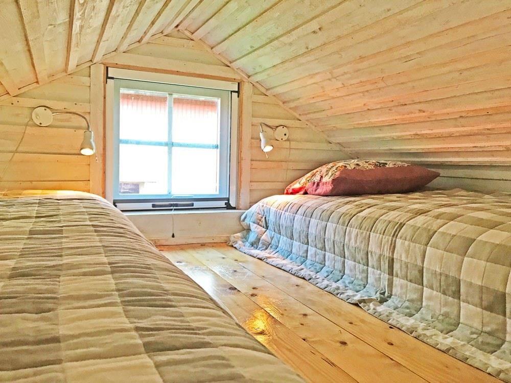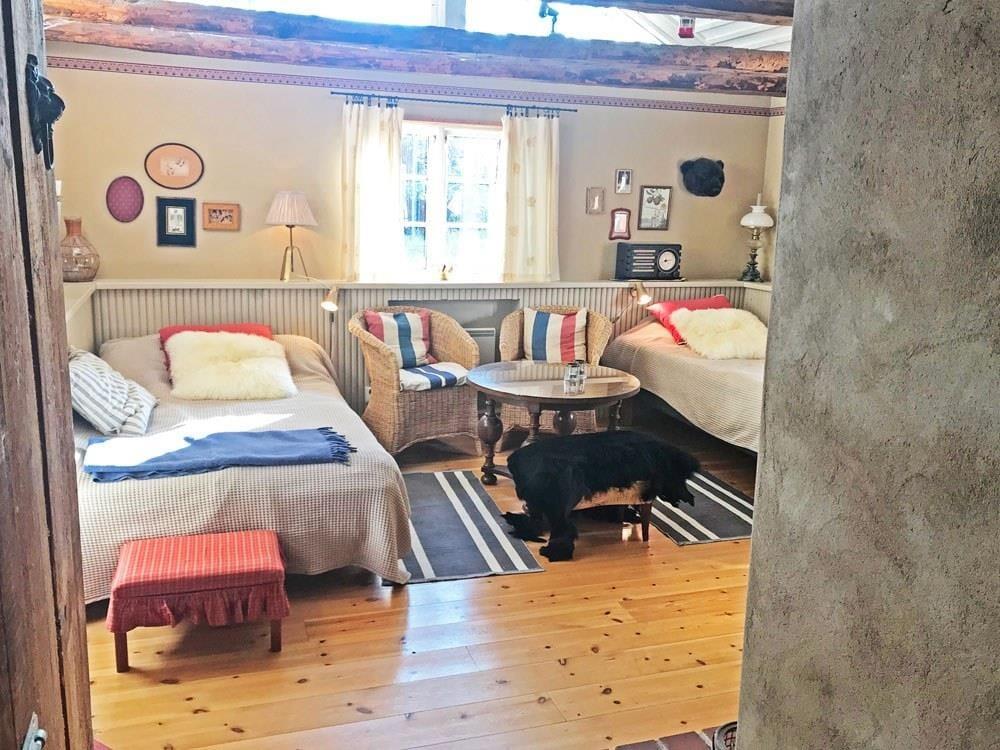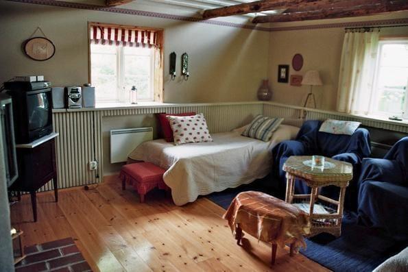 Den hyggelige, rustikke hytte fra 1920 har et åbent køkken-alrum med elektrisk komfur med ovn, køle- og fryseskab, mikrobølgeovn, brødrister, kaffemaskine og en støbejernsovn. I opholdsområdet findes en åben pejs, en siddegruppe og SAT-TV med tyske programmer. Badeværelset er udstyret med bruser, WC og gulvvarme. Der er to enkeltsenge i opholdsområdet samt en sovehems med to ekstra enkeltsenge, som er tilgængelig via en stejl trappe og egnet til børn og unge op til ca. 14 år. Foran huset på den lille terrasse findes havemøbler samt en grill. Der er også en parkeringsplads til bilen. En robåd står til rådighed under hele opholdet.