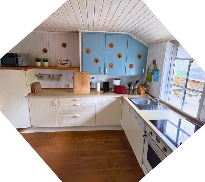 Med sine 110 m² tilbyder huset plads til op til 6 personer til en uforglemmelig ferie. To hunde er også velkomne. Man kommer ind i huset via en lille overdækket veranda og står i entreen. Herfra kommer man ind i hjertet af huset, nemlig den store stue med en stor, centralt placeret brændeovn, der giver behagelig varme i den kolde årstid. Sammen med en tværgående, typisk svensk træsofa adskiller den stuen med polstret siddegruppe og fladskærms-tv med tyske programmer fra det store moderne køkken. Dette indeholder ud over 3 keramiske kogeplader, ovn, køle- og frysekombination, opvaskemaskine, mikroovn og kaffemaskine alt, hvad du har brug for til at tilberede almindelige retter. Du serverer dem på det store spisebord. Når vejret er varmt, kan du også nyde måltiderne eller en forfriskning på den solrige træterrasse, der omgiver huset på to sider med udsigt over søen. Der er også en grill til rådighed.