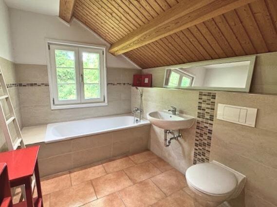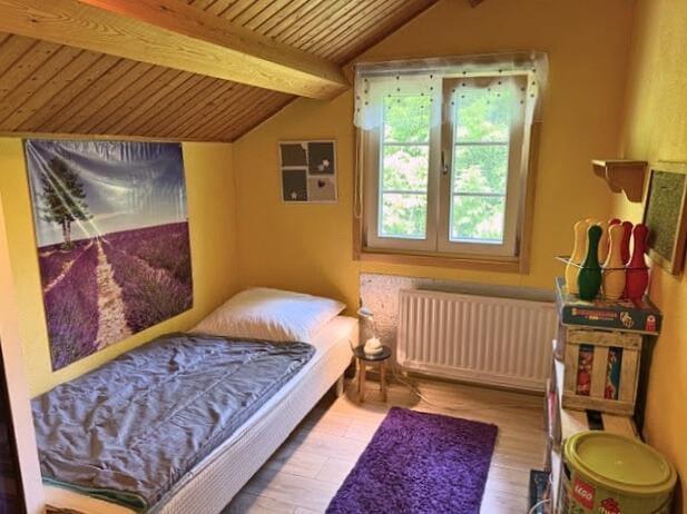 På overetagen findes de to øvrige soveværelser, hvoraf det ene – ligesom i stueetagen – har en dobbeltseng og det andet en enkeltseng. Badeværelset på øverste etage har toilet og badekar.