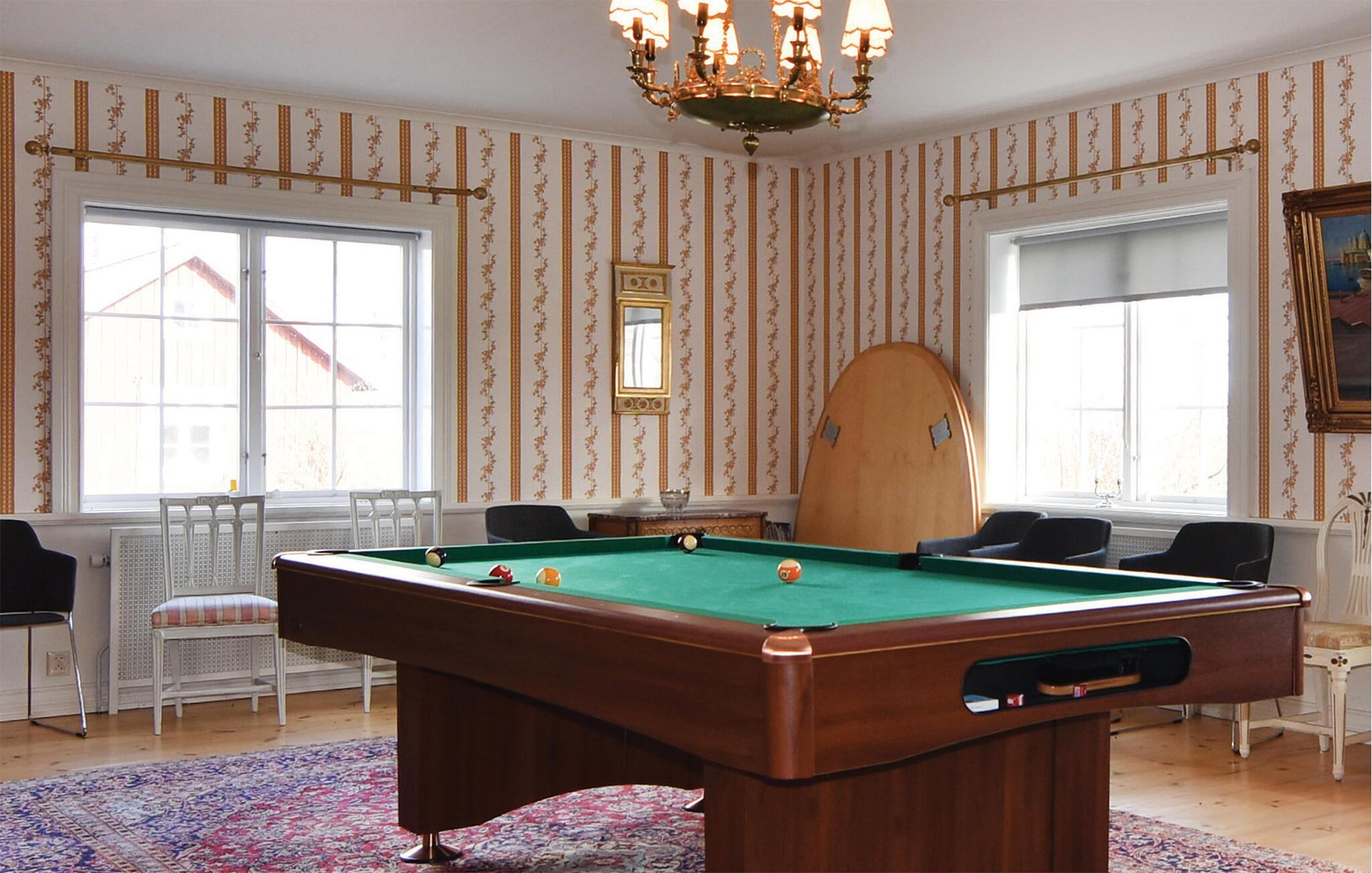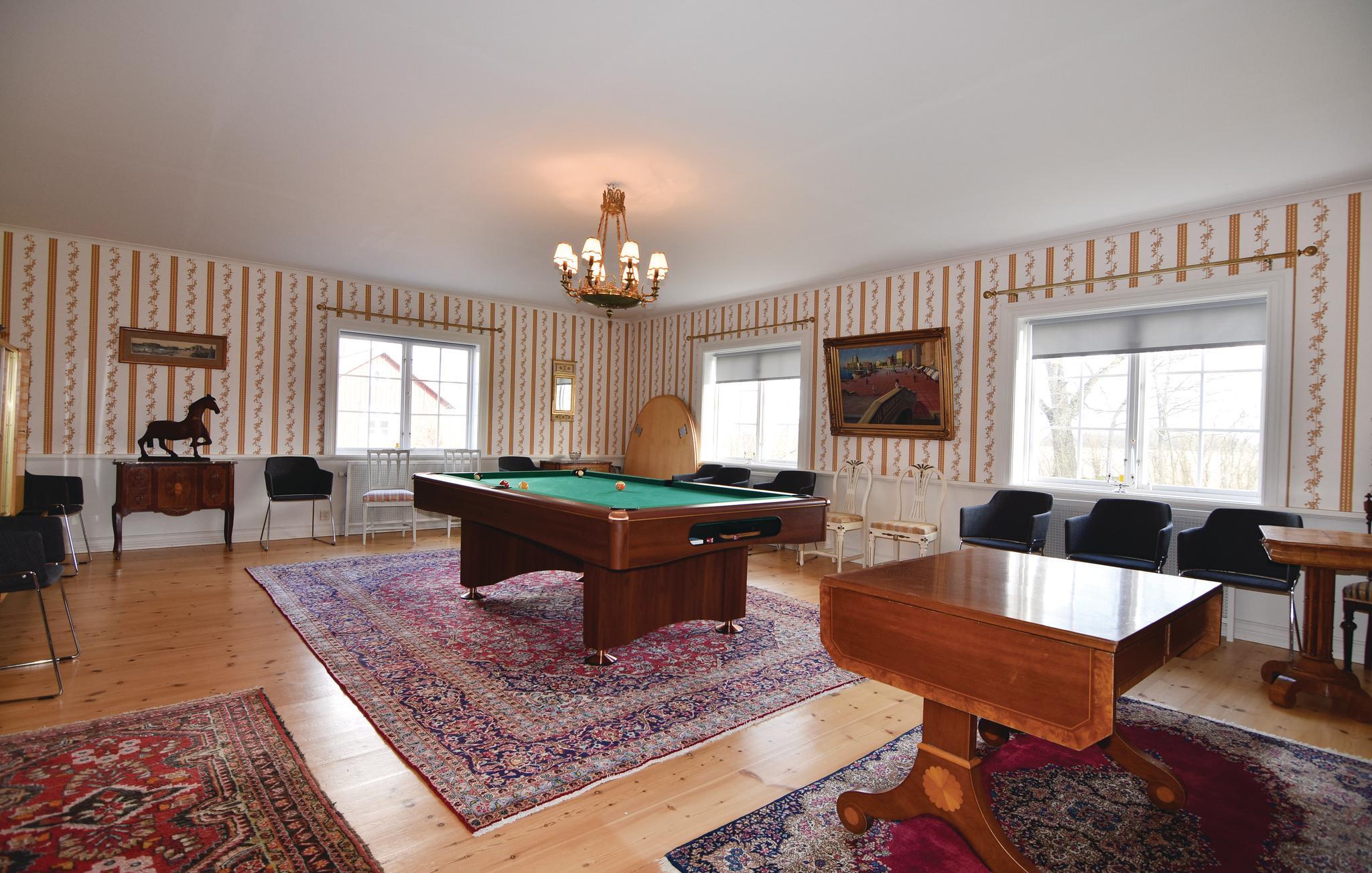 Dette smukt beliggende gods har frodige marker og enge lige op til grunden. I bor i den rummelige hovedbygning, som er indrettet i klassisk herregårdsstil. Træd ind og lad jer straks fortrylle af den smukke krystallysekrone i hall'en. Her på godset er der store rum til selskabeligt samvær, hvilket passer perfekt til to familier. Her kan I kan spille billard, slappe af i saunaen og lave lækker festmad i det store landkøkken.