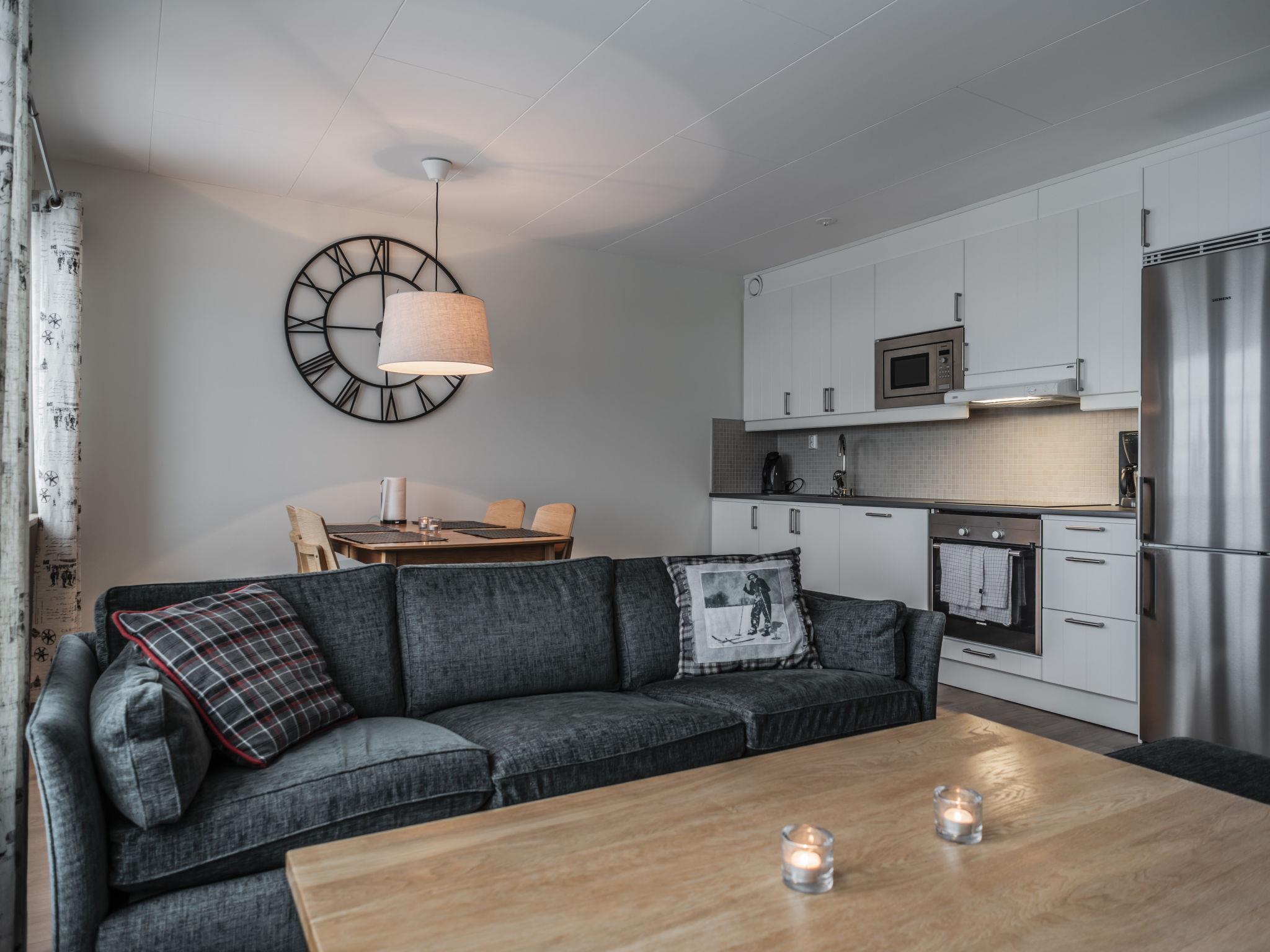 "Trillevallen 2", 3-room apartment. Bright, modern and tasteful furnishings: open living/dining room with dining table and TV. Exit to the balcony. 1 room with 1 double bed. 1 room with 2 beds. Open kitchen (oven, dishwasher, 4 ceramic glass hob hotplates, toaster, microwave, freezer, electric coffee machine). 2 showers/WC, Sauna. Balcony. Very beautiful view of the mountains and the forest. Facilities: washing machine. Internet (WiFi, free). Please note: non-smoking house. Smoke alarm, fire extinguisher.