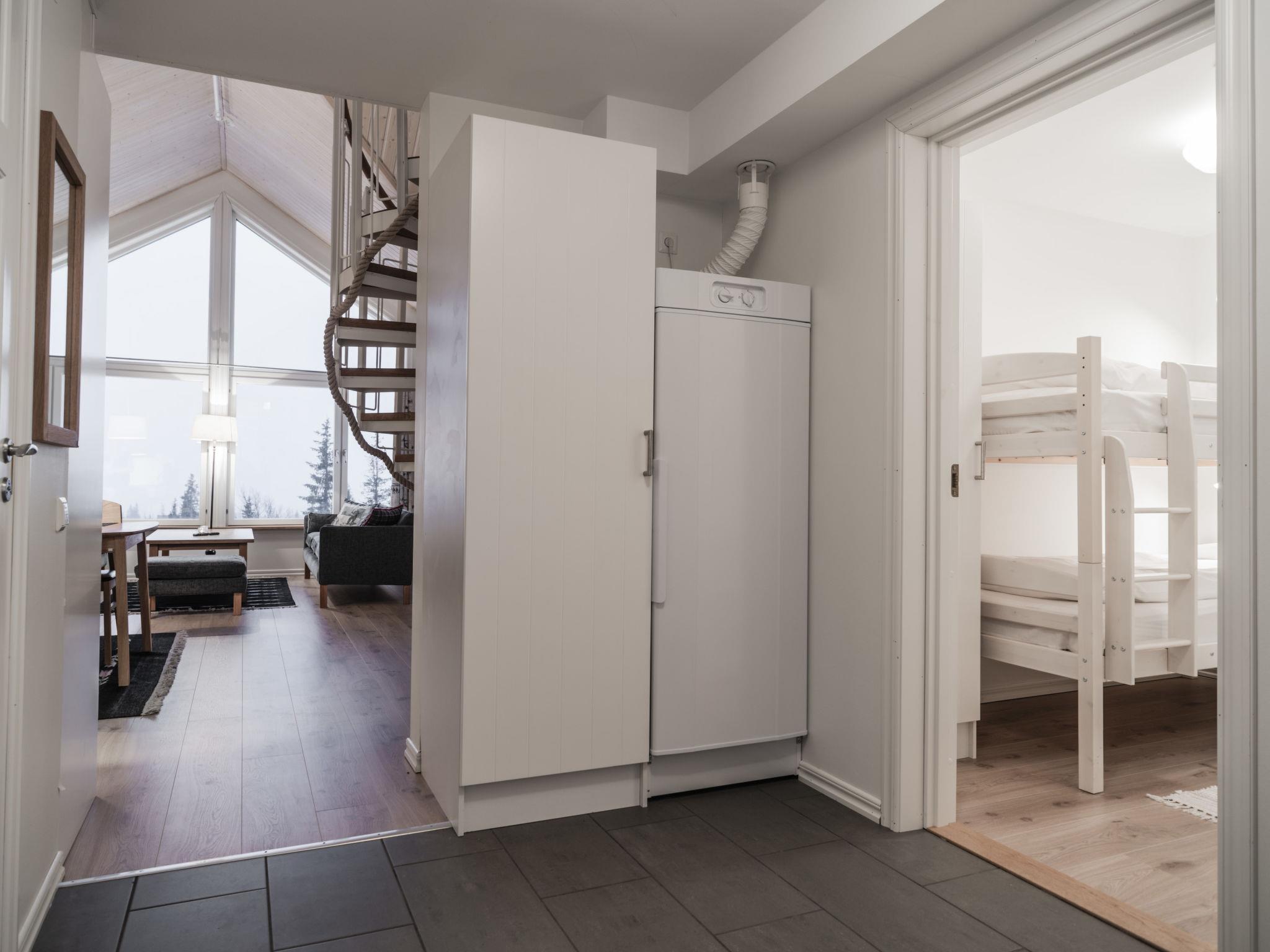 "Trillevallen 9", 5-room apartment. Bright, modern and tasteful furnishings: open living/dining room with dining table and TV. Exit to the balcony. 1 room with 1 double bed. 1 room with 1 x 2 bunk beds (120 cm, length 200 cm) (80 cm, length 200 cm). 1 room with 1 x 2 bunk beds. Open kitchen (oven, dishwasher, 4 ceramic glass hob hotplates, toaster, microwave, freezer, electric coffee machine). 2 showers/WC, Sauna. Upper floor: (spiral staircase), 1 room with 2 beds. Balcony. Very beautiful view of the mountains and the forest. Facilities: washing machine. Internet (WiFi, free). Please note: non-smoking house. Smoke alarm, fire extinguisher.