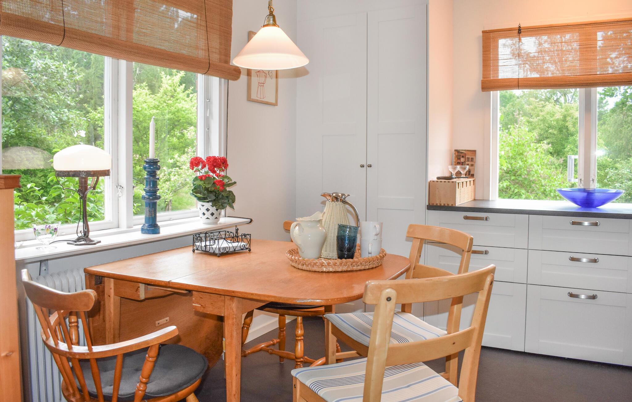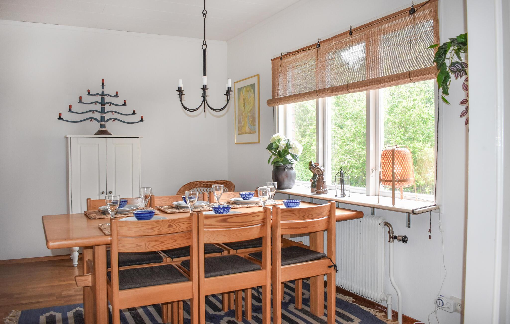 Det charmerende hus med sine store fællesarealer har en varm og indbydende atmosfære og er hyggeligt indrettet - perfekt til et socialt samvær med familie og venner. At lave mad sammen i det veludstyrede køkken, læse en bog i sofaen eller spille spil ved spisebordet går hånd i hånd her.