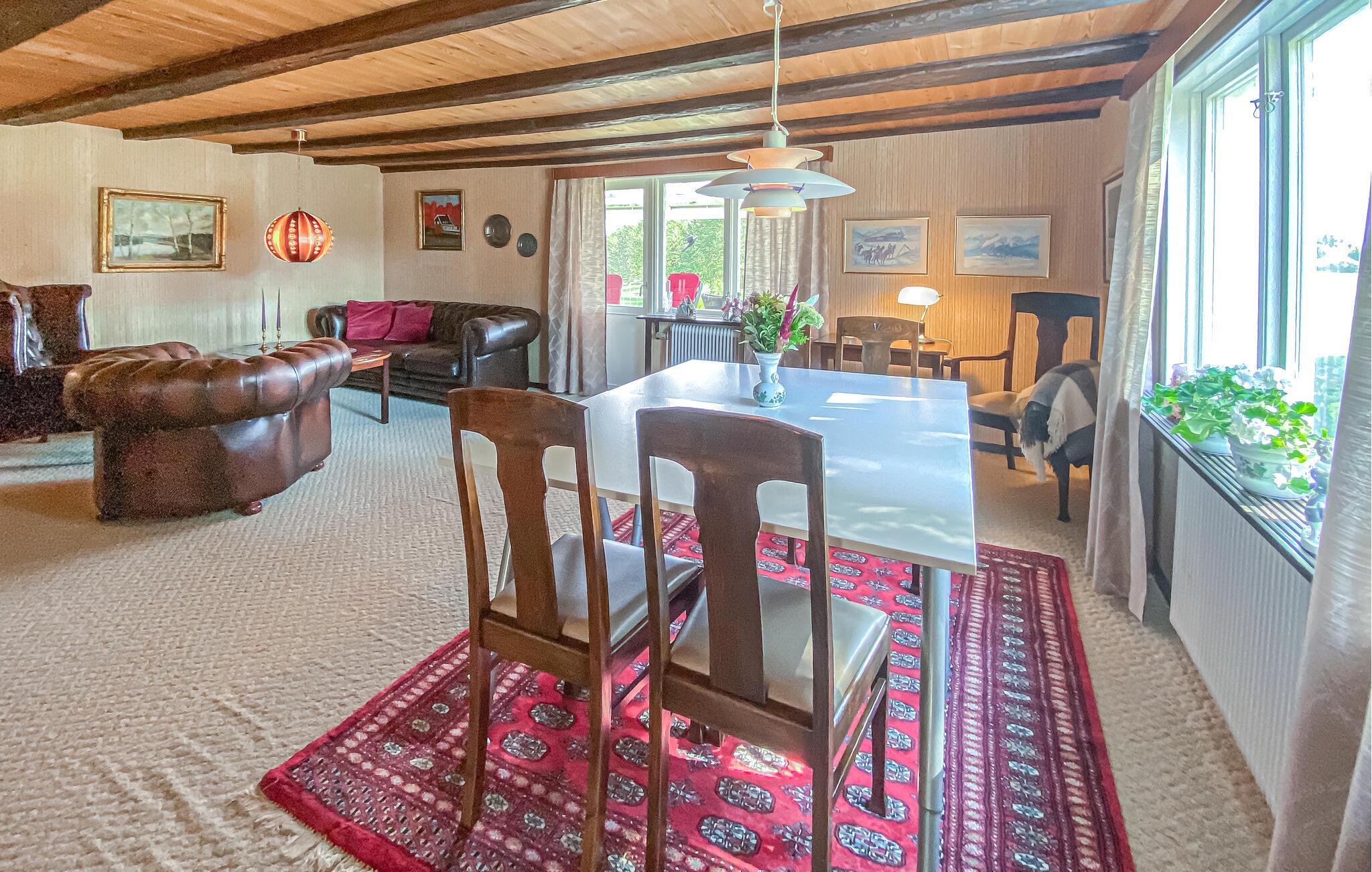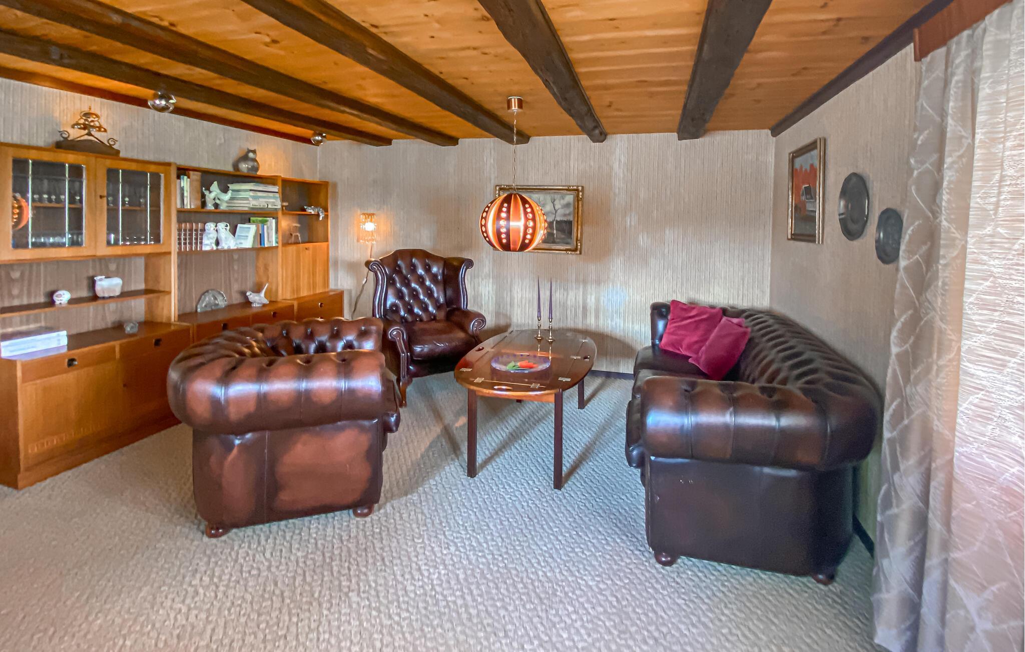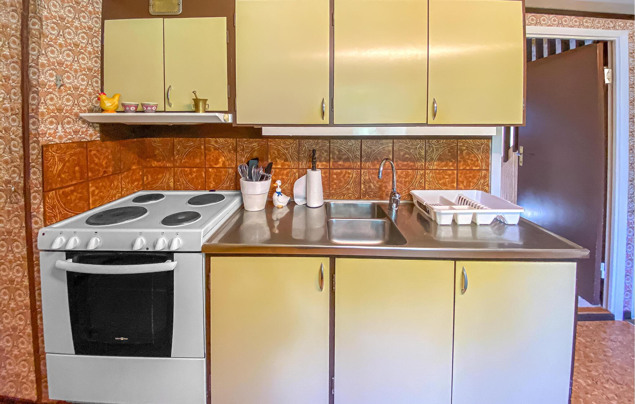 Dette rustikt indrettede hus med sine glade farvetoner er som skabt til en fornøjelig pause fra hverdagen. Sofaen indbyder om aftenen til hyggelige stunder med et glas vin, mens siddegruppen med blomstermønster egner sig perfekt til en kaffepause. Uanset om I vil snakke sammen eller lave mad, er det jer, der bestemmer dagens rytme.