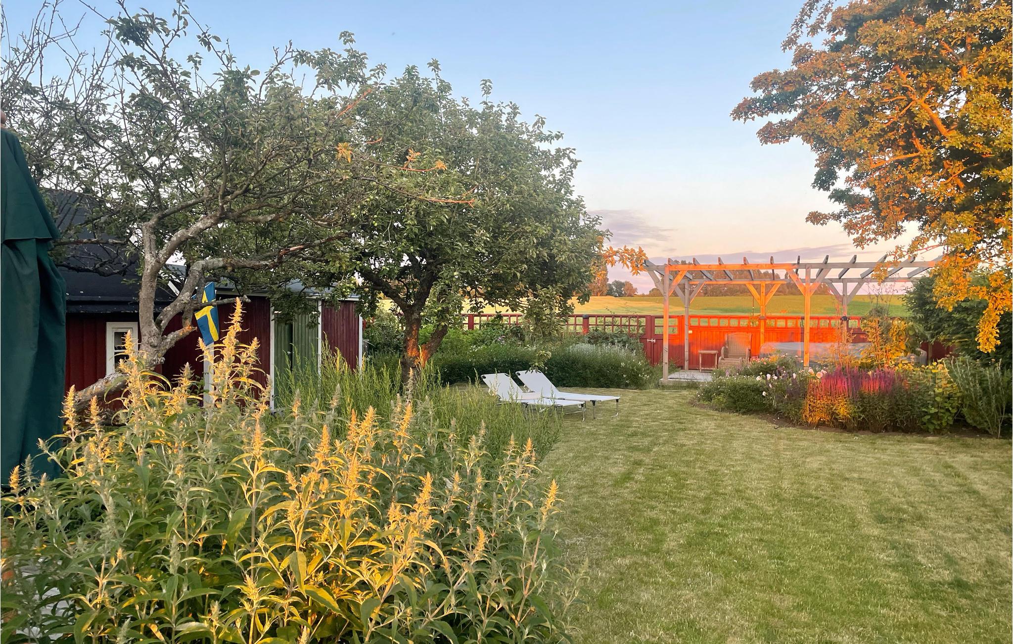 Huset ligger ud til en fin, rolig og grøn have fyldt med blomster, frugt og bær, hvor der også er plads til leg. Oplev vidunderlige solnedgange over markerne og havet på den flisebelagte terrasse foran huset.