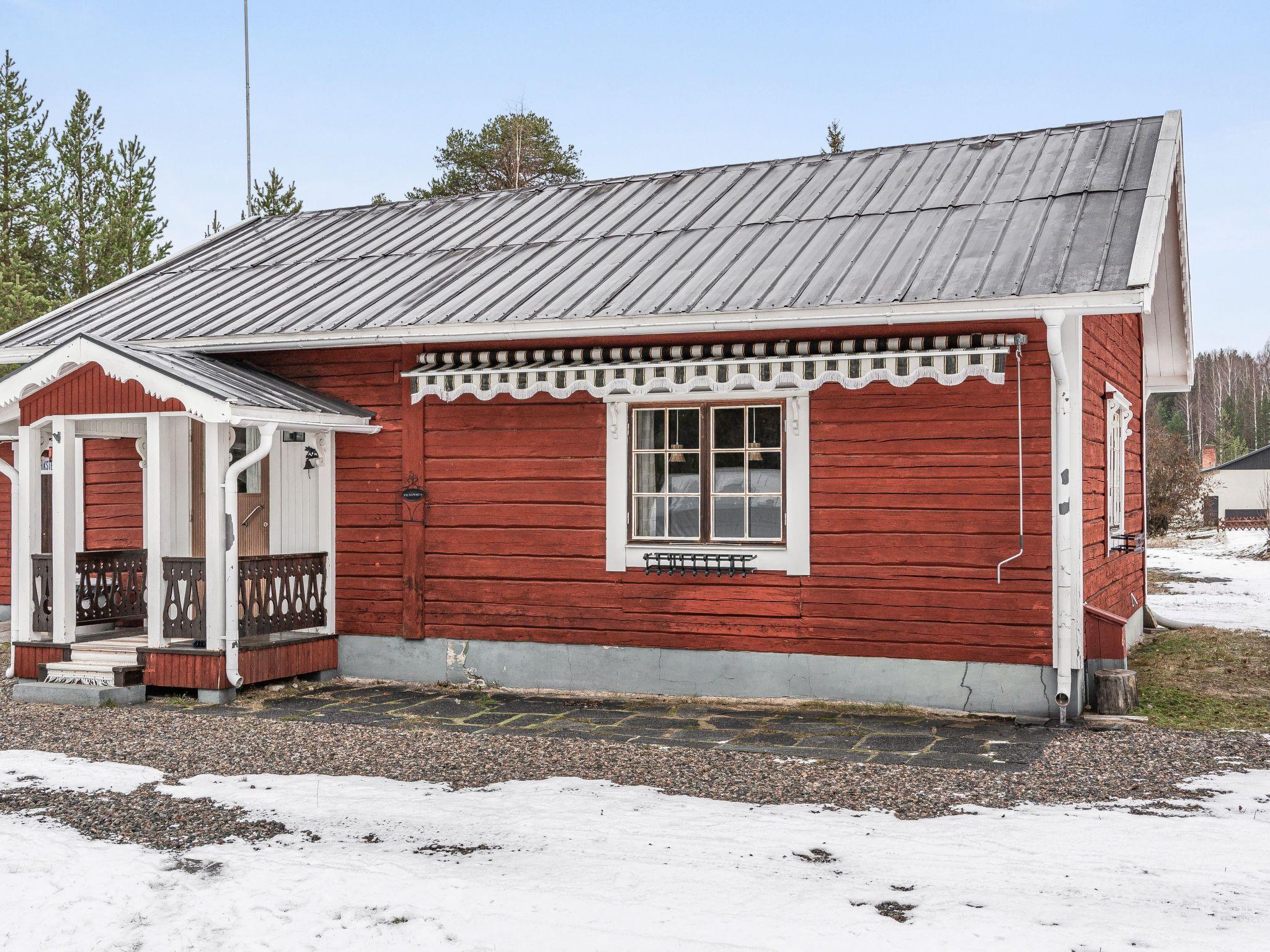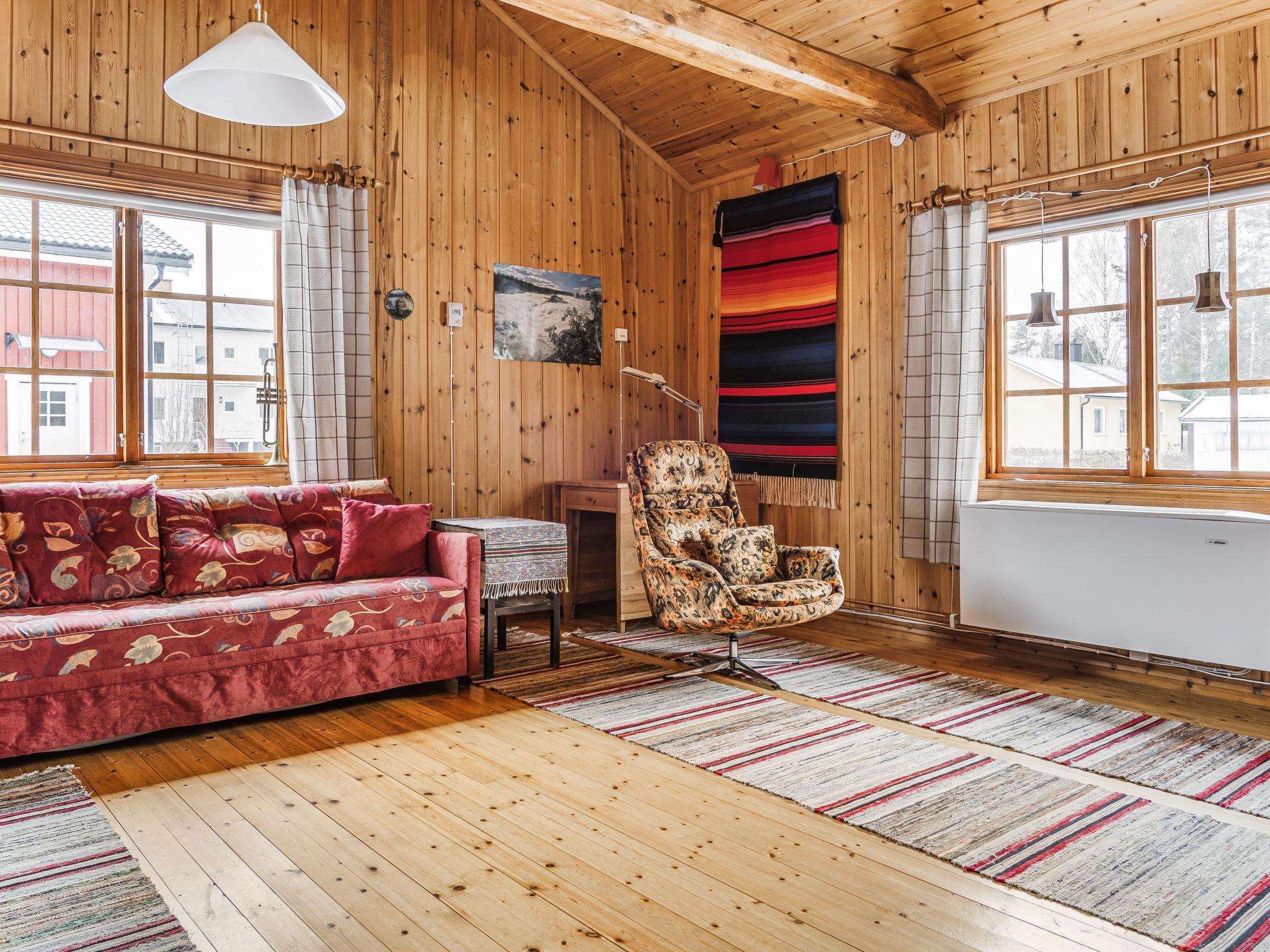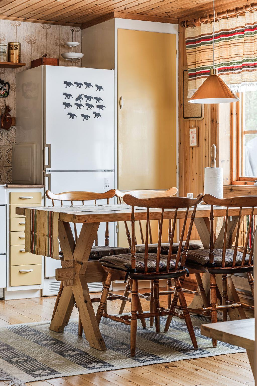 "Norrskensstugan", 2-room house 70 m2. Wooden furniture furnishings: living/dining room with 1 double sofabed, open-hearth fireplace and TV. 1 double bedroom with sloping ceilings with 1 bed (120 cm, length 200 cm), 1 sleeping facility (90 cm, length 200 cm). Open kitchen (4 hot plates, oven, toaster, kettle, microwave, freezer, electric coffee machine) with dining table. Shower/WC. Forced-air heating. Wooden floors. Terrace furniture. Beautiful view of the forest. Facilities: Internet (WiFi). Please note: non-smoking house. Smoke alarm, fire extinguisher. Instead of an enclosed bedroom, some sleeping areas are located in an open-plan area (gallery, alcove, etc.).