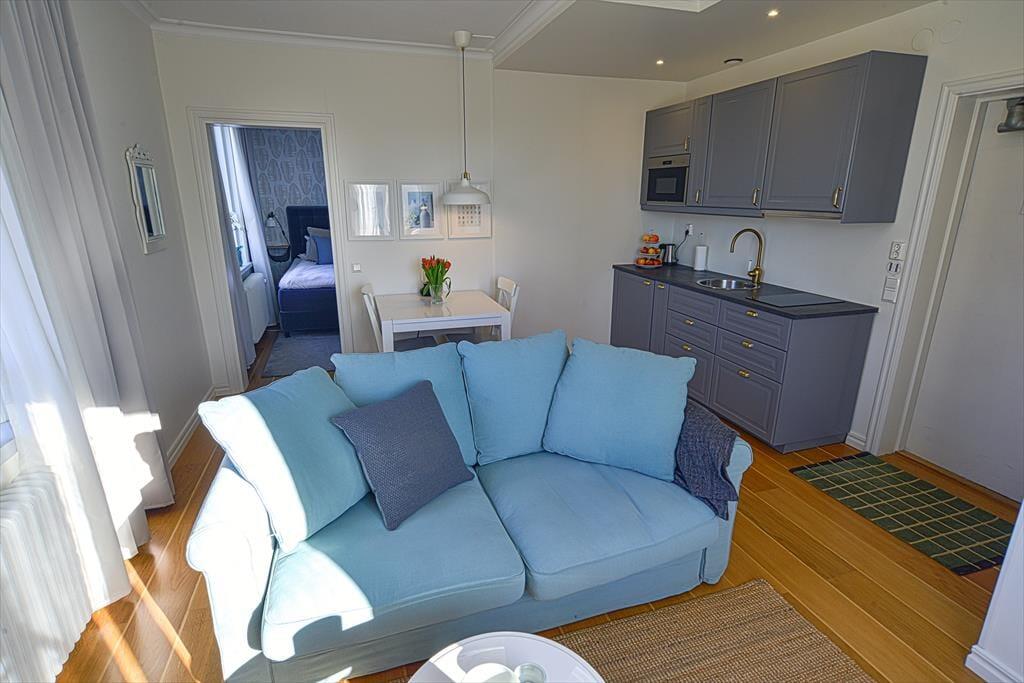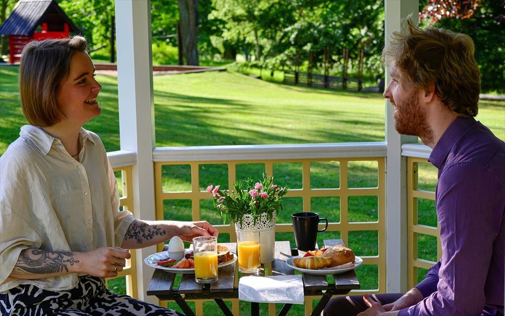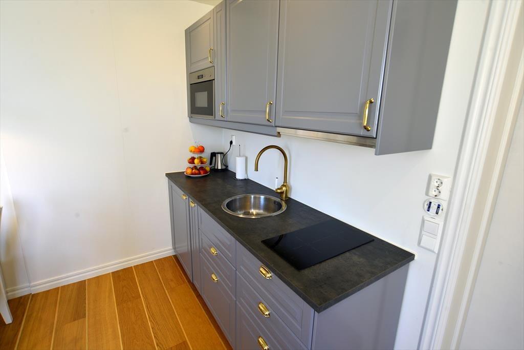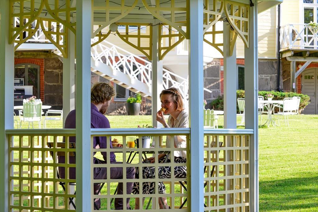 Det lille pantrykøkken i opholdsrummet er udstyret med kaffemaskine, elkedel, mikrobølgeovn, et lille køleskab med fryser og et komfur med 2 kogeplader, så du kan tilberede mindre måltider. I højsæsonen kan du efter lyst og behov bestille mad fra hotelrestauranten og også få morgenmad bragt til lejligheden. Du har desuden adgang til vaskemaskine med tørretumbler samt strygeudstyr i et separat vaskerum. Hotellets fællesarealer kan benyttes frit. Her finder du saloner med hyggelige siddepladser, et tårnværelse med en fantastisk udsigt, flere altaner og en stor have. Derudover er der billard, dart, bordtennis og et legerum for de mindste (i højsæsonen fra maj til september). I fitnessrummet kan du benytte to løbebånd, håndvægte og yogamåtter. Ud over saunaen direkte ved søen findes der på hotellet både dame- og herresauna. Børn er meget velkomne!Hotellet har en badebro ved søen, hvor man nemt kan bade. Her finder du også et vildmarksbad, som kan opvarmes med træ på kolde dage. For børn er der mulighed for at bade ved “Evabadet”, få minutters gang væk, hvor der er lavvandet sandstrand.