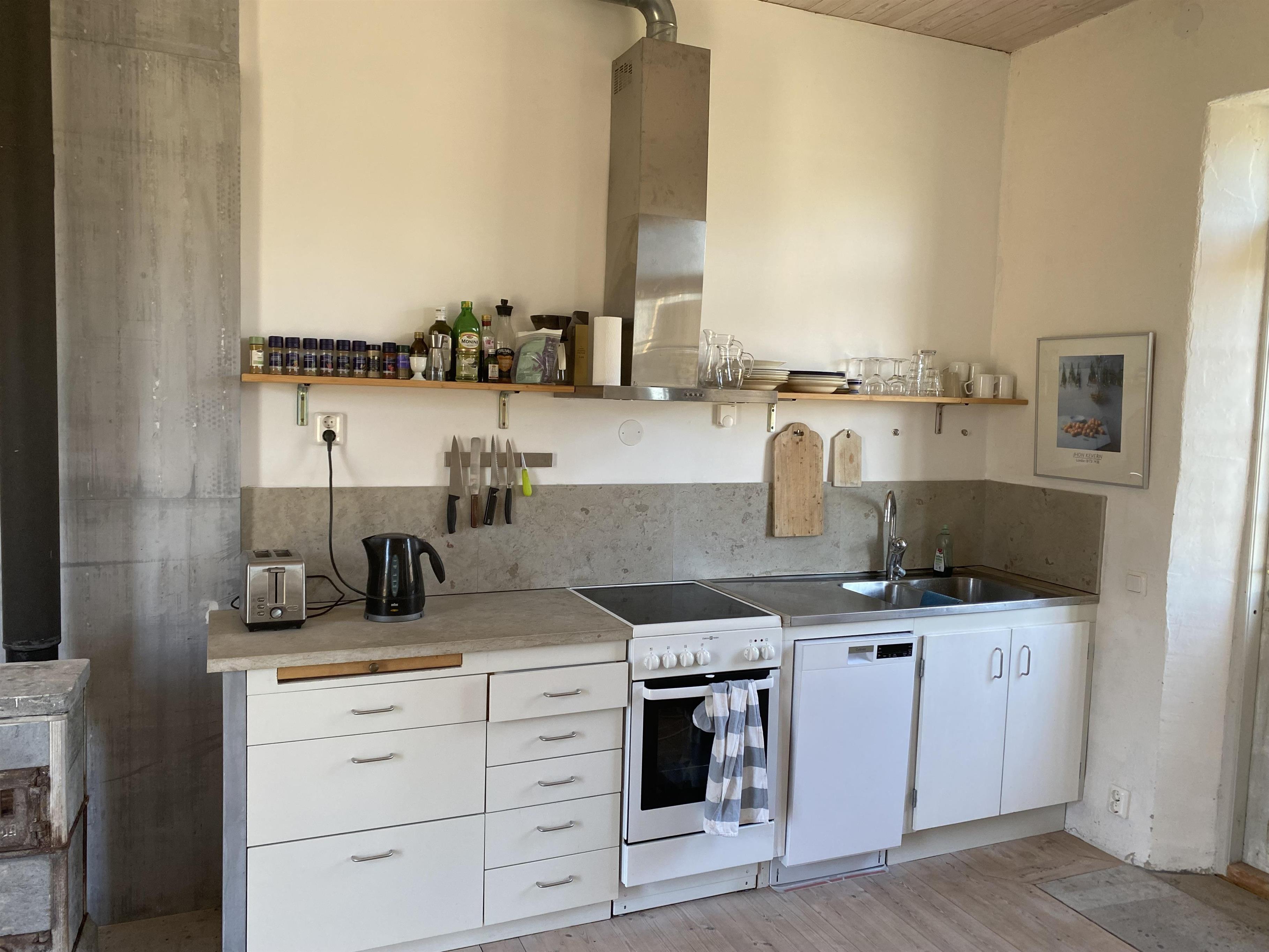 I stuen/køkkenet er der en dejlig fedtstens-pejs.