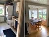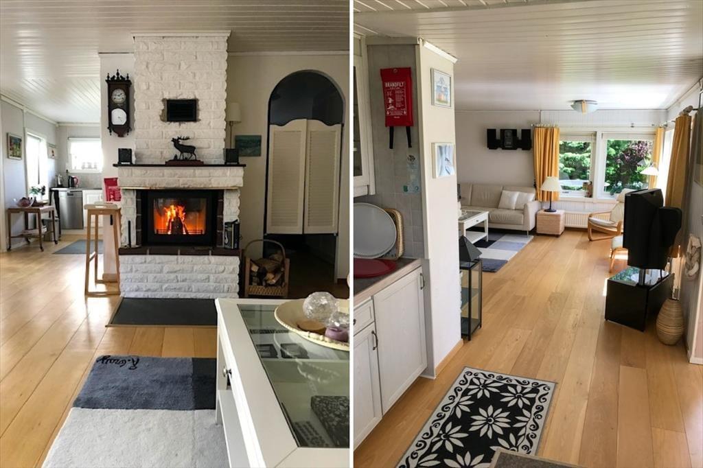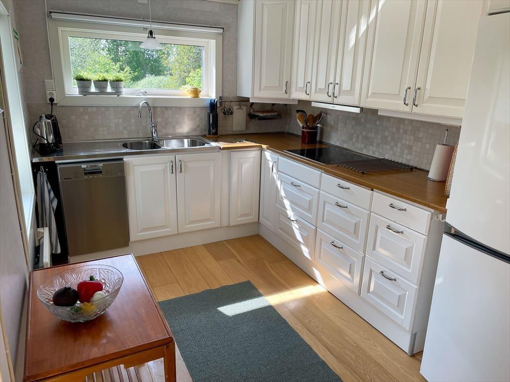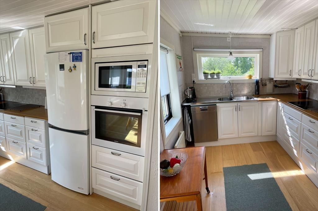 Det åbne køkken er fuldt udstyret med keramisk komfur, ovn, opvaskemaskine, køle- og fryseskab, mikroovn, kaffemaskine og brødrister. Et spisebord med udsigt over søen gør hvert måltid til en særlig oplevelse. Stuen tilbyder en hyggelig siddegruppe, satellit-tv, brændeovn og ligeledes en smuk udsigt over søen.