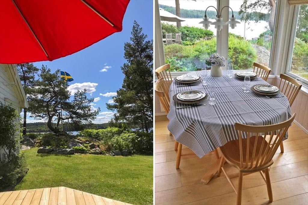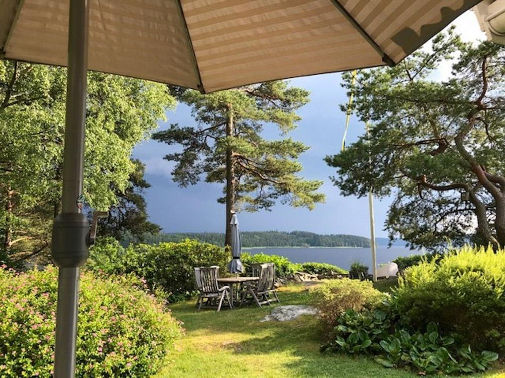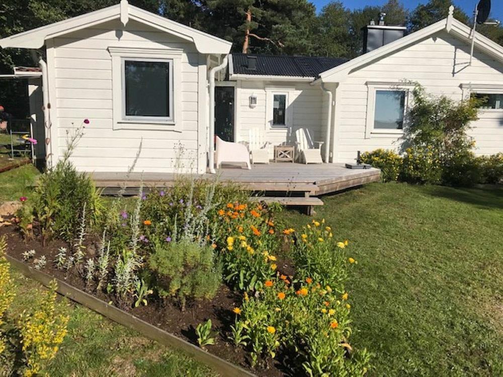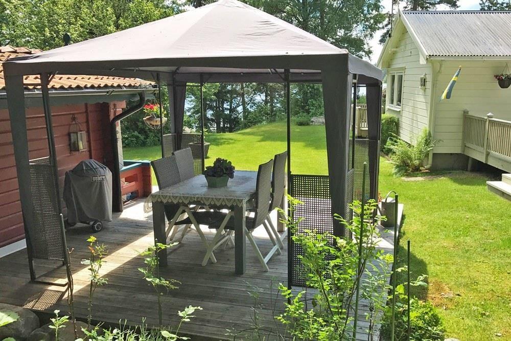 Udenfor findes to verandaer, en havepavillon, havemøbler, grill, en lege- og solplæne samt en privat bro med båd (Linder Fishing 410) med elmotor. Der er parkeringsplads direkte ved huset. På forespørgsel kan der stilles fire voksencykler til rådighed.