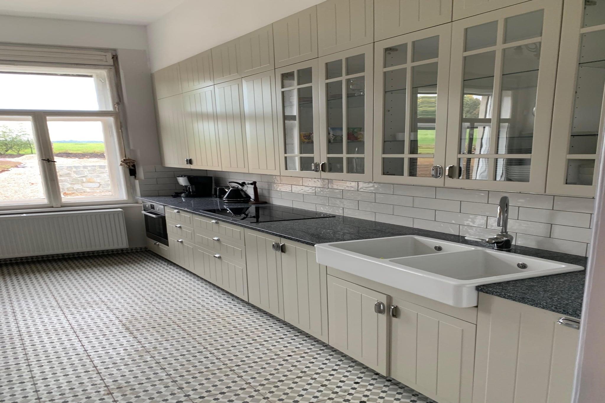 Stueetage: (Stue(Fjernsyn(parabol, Smart-TV), sofahjørne), spisestue(spisebord(16 personer)), Køkken(Fjernsyn(parabol, Smart-TV), spisebord(4 personer), kogeplade, elkedel, brødrister, kaffemaskine, ovn, mikrobølgeovn, opvaskemaskine , køleskab, fryser), soveværelse(dobbeltseng, Fjernsyn), soveværelse(enkeltseng, enkeltsovesofa, dobbeltseng, Fjernsyn), badeværelse(bruser(Walk-in-bruser), håndvask), badeværelse(bruser(Walk-in-bruser), håndvask), toilet(håndvask, toilet), toilet(håndvask, toilet), fællesrum(pejs, sofahjørne)) På 1. etage: (soveværelse(enkeltseng, enkeltsovesofa, dobbeltseng, Fjernsyn), soveværelse(enkeltseng, enkeltseng, enkeltseng, dobbeltseng, Fjernsyn), badeværelse(bruser(Walk-in-bruser), håndvask), badeværelse(bruser(Walk-in-bruser), håndvask), toilet(håndvask, toilet), toilet(håndvask, toilet), toilet(håndvask, toilet)) varme(elektrisk, central), terrasse(overdækket), have(privat, indhegnet), cykelopbevaring, havemøbler, solstole, grill, parkering, legeredskaber, barneseng, havepejs