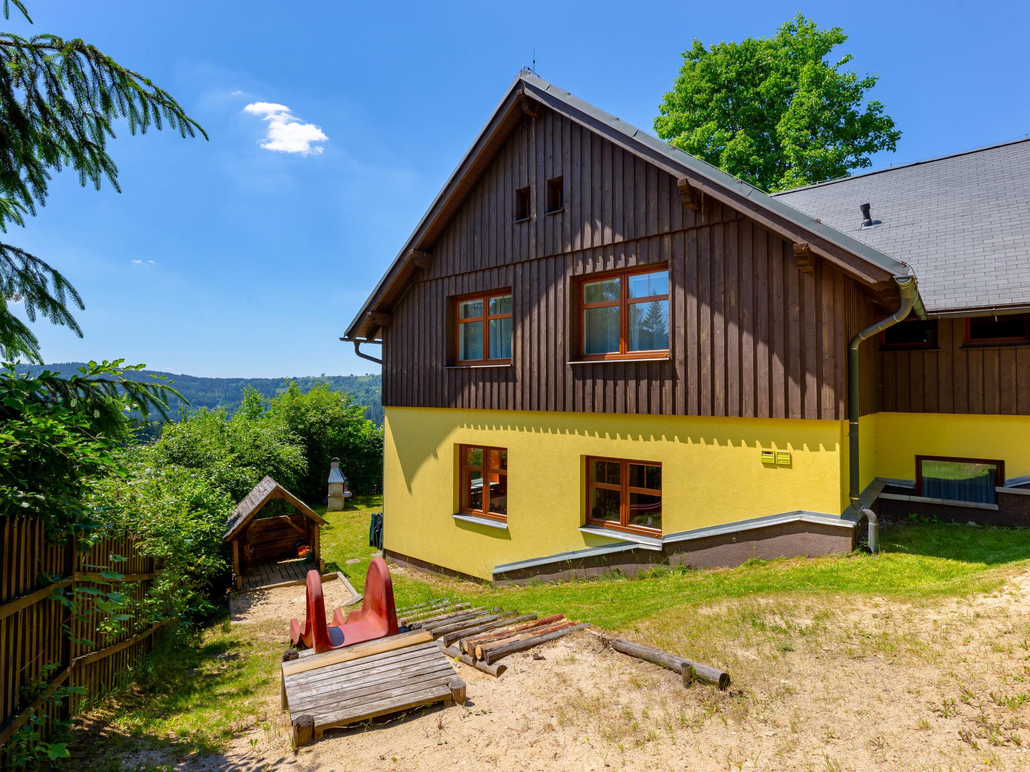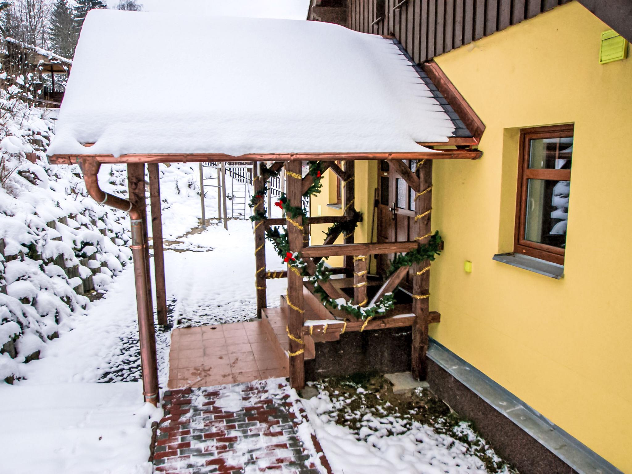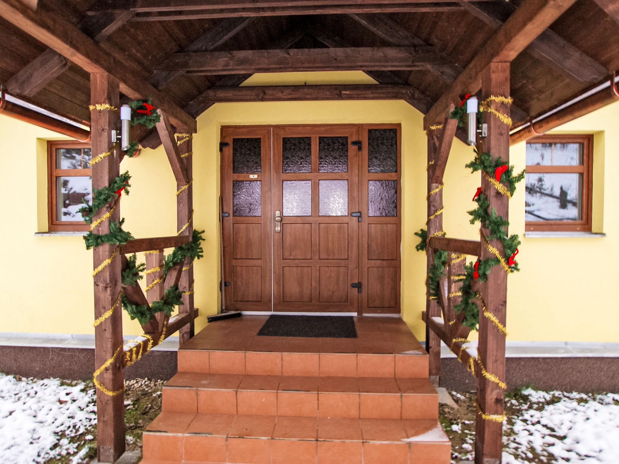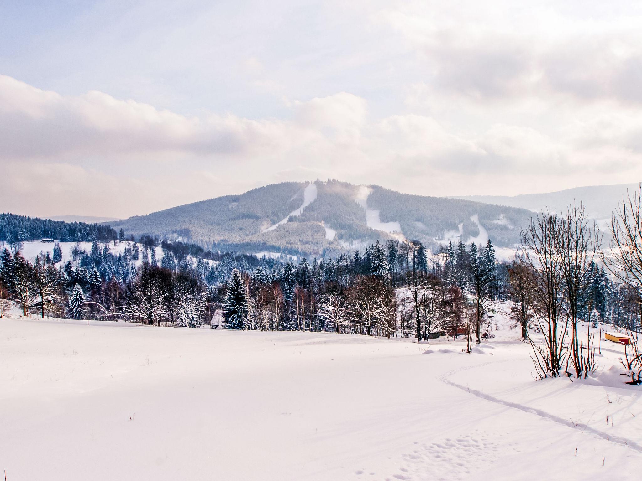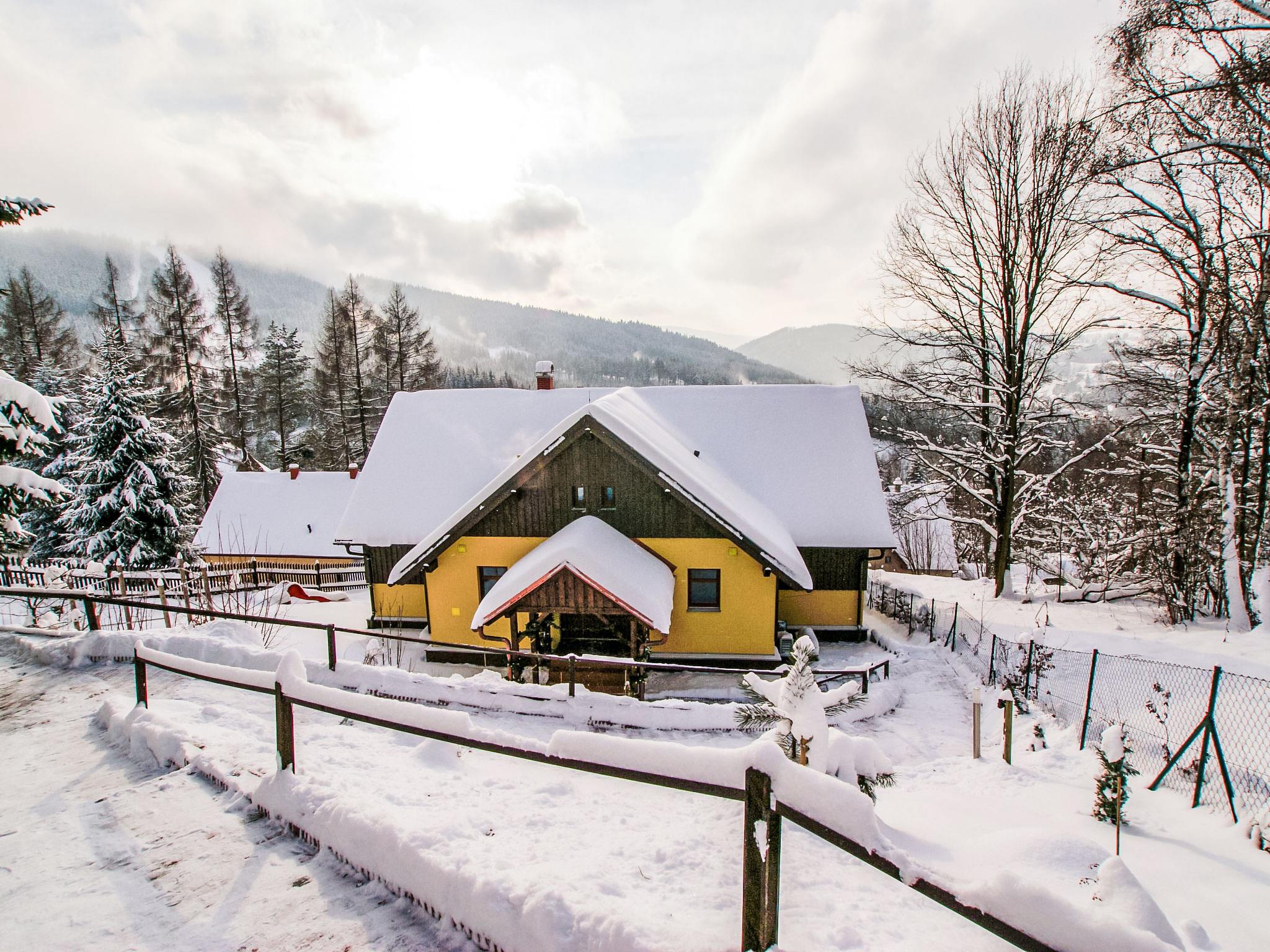 Albrechtice 5 km from Tanvald: Modern, comfortable house "Albrechtice", 2 storeys, detached, built in 2007. On the outskirts, 200 m from the skiing area. Private: property 1'800 m2 (fenced), indoor pool heated (seasonal availability: 01.Jan. - 31.Dec.). Hot tub, garden furniture, barbecue, children's playground. In the house: sauna, storage room for skis, washing machine, tumble dryer. Motor access to the house. Parking (for 4 cars) at the house. Grocery 200 m, supermarket 5 km, restaurant 250 m, bus stop 250 m, railway station 1.2 km, outdoor swimming pool 5 km, indoor swimming pool 12 km, public bathing area 12 km. Tennis 2 km, mountain railway, slopes, ski school, sled run 150 m, cross country ski track 200 m. Well-known ski regions can easily be reached: Tanvaldsky Spicak 200 m, Hrabetice, Bedrichov 10 km, Harrachov 18 km. Please note: main road 4 km from the property. Railway line 1.2 km from the property. Nightclub/disco 4 km from the property.