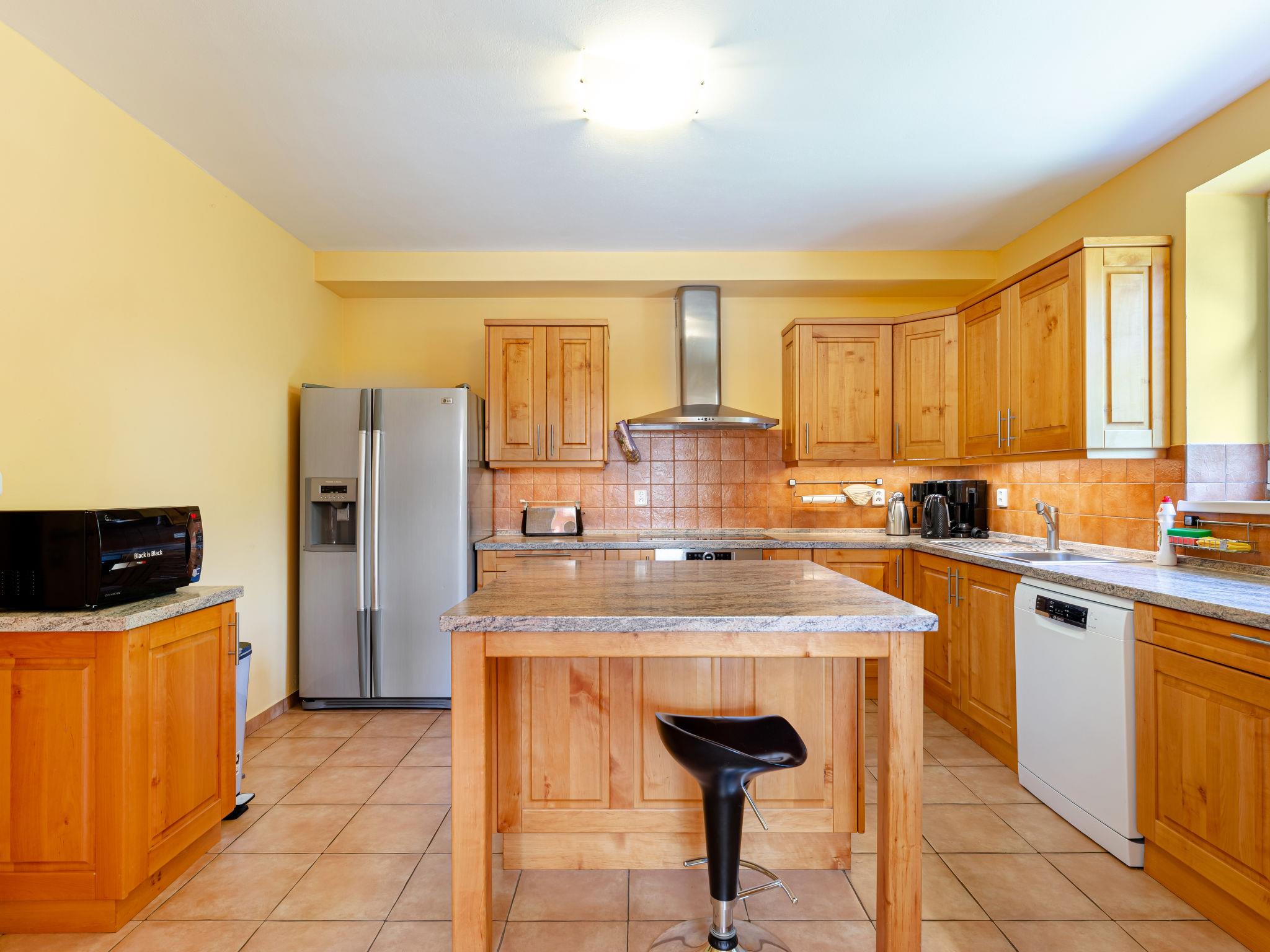 8-room house 270 m2 on 2 levels. Modern and cosy furnishings: living room with Scandinavian wood stove, satellite TV, video, radio and DVD. Exit to the terrace. Dining room. Kitchen (oven, dishwasher, 4 induction hot plates, kettle, microwave, electric coffee machine) with separate WC. Exit to the swimming pool. Shower/WC, hydro massage bath, Sauna. Gas heating, boiler (380 litres). Upper floor: 2 rooms, each room with 2 beds. 4 rooms, each room with 1 double bed. Exit to the balcony. Bath/WC, shower/WC, 2 sep. WC's. Marvellous view of the mountains and the valley. Facilities: children's high chair, baby cot for up to 3 year olds. Internet (WiFi, free). Suitable for families. Maximum 3 pets/ dogs allowed.