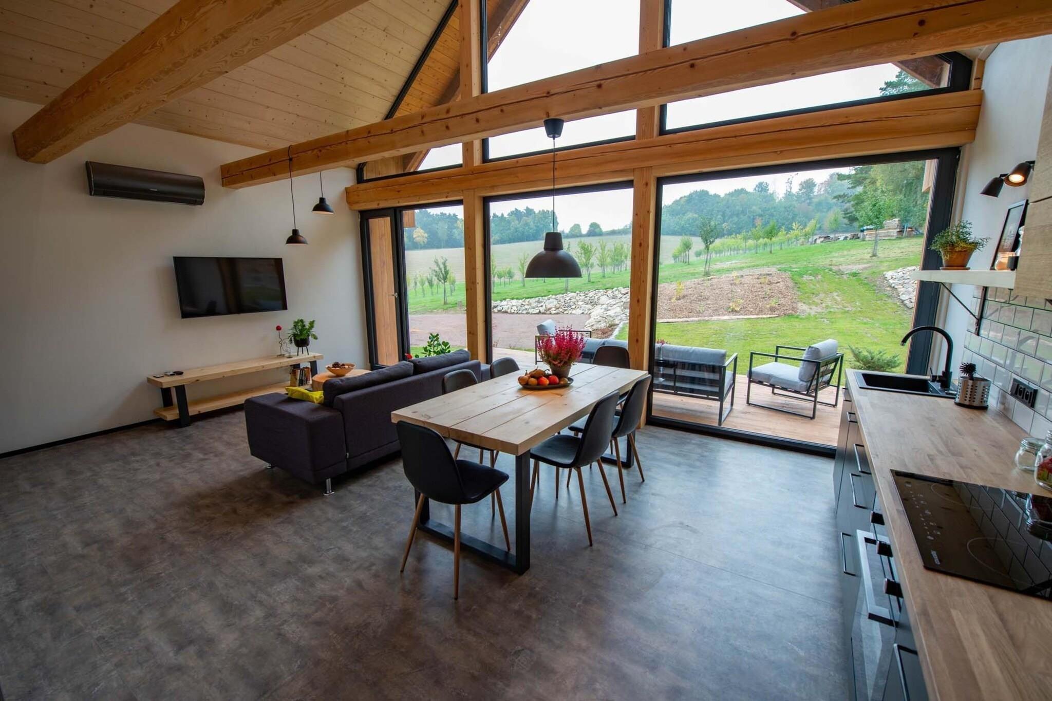 Beliggende i den charmerende landsby Smrcek, i hjertet af Vysocina-regionen, tilbyder denne ejendom en rolig flugt omgivet af natur. Smrcek, der er kendt for sine opalmarker, er en ideel base for eventyrsøgere, der tilbyder nem adgang til udendørs aktiviteter og kulturelle oplevelser. Uanset om du udforsker det maleriske tjekkiske landskab eller slapper af i komforten af din luksusindkvartering, tilbyder Smrcek den perfekte balance mellem fred og eventyr. Smrcek er et glimrende udgangspunkt for udflugter til UNESCOs kulturarvssteder, såsom Pilgrimskirken i Ždár nad Sázavou og den historiske by Telc. Kun 1,6 km væk finder du det fantastiske Pernštejn Slot, et af de bedste- bevarede gotisk-renæssanceslotte i Europa For en ændring af tempo er den livlige by Brno kun en times tid kørsel væk og byder på alt fra imponerende arkitektur til familievenlige attraktioner. Udforsk det bedste af tjekkisk kultur, historie og natur fra dette perfekte tilflugtssted. Vores ejendom har to moderne huse midt i en fredfyldt frugthave, som hver indeholder to stilfulde lejligheder. Du kan leje lejlighederne enkeltvis eller booke hele ejendommen til gruppeophold, bryllupper eller særlige begivenheder. Husene er designet med store vinduer og lysebrunt træaccenter og blander sig problemfrit med det naturlige landskab, mens de giver alle hjemmets bekvemmeligheder. Hver lejlighed er udstyret med moderne bekvemmeligheder, herunder et fuldt møbleret køkken, aircondition og en privat terrasse, hvor du kan slappe af efter en dag med udforskning.
