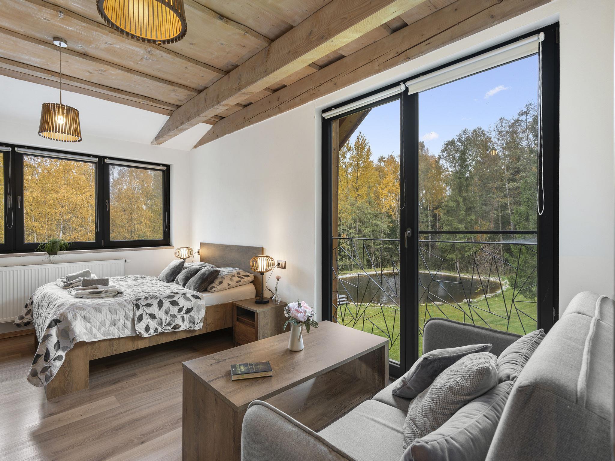 Kurí 3 km from Benešov nad Cernou: Luxurious chalet "Srub Kurí", 2 storeys, detached, built in 2019. In a quiet position, along the wooded area, in the countryside. For shared use: natural pond. Bathing jetty. Private: property. Barbecue, fireplace. In the house: WiFi, hot tub, infrared sauna, spa area, washing machine, tumble dryer. Parking at the house. Grocery 3 km, restaurant 300 m, bus stop "Benešov nad Cernou, pila" 2 km, grass beach 50 m (small), outdoor swimming pool 13 km. Nearby attractions: Žofínský prales, Sokolcí, 10 km, Blansko, Dobrá Voda 12 km, Jiricská nádrž, Tvrz Žumberk 15 km, Nové Hrady, Porešín, ZOO park Dvorec 20 km, Hrad Rožmberk, Ceský Krumlov 35 km. Well-known ski regions can easily be reached: Karlstift (AT) 25 km, Lipno 50 km, Sterstain (AT) 50 m. Well-known lakes can easily be reached: Vodní nádrž Lipno 50 km. The owner can arrange fishing in a private lake or rafting on the Vltava river (on request, extra).