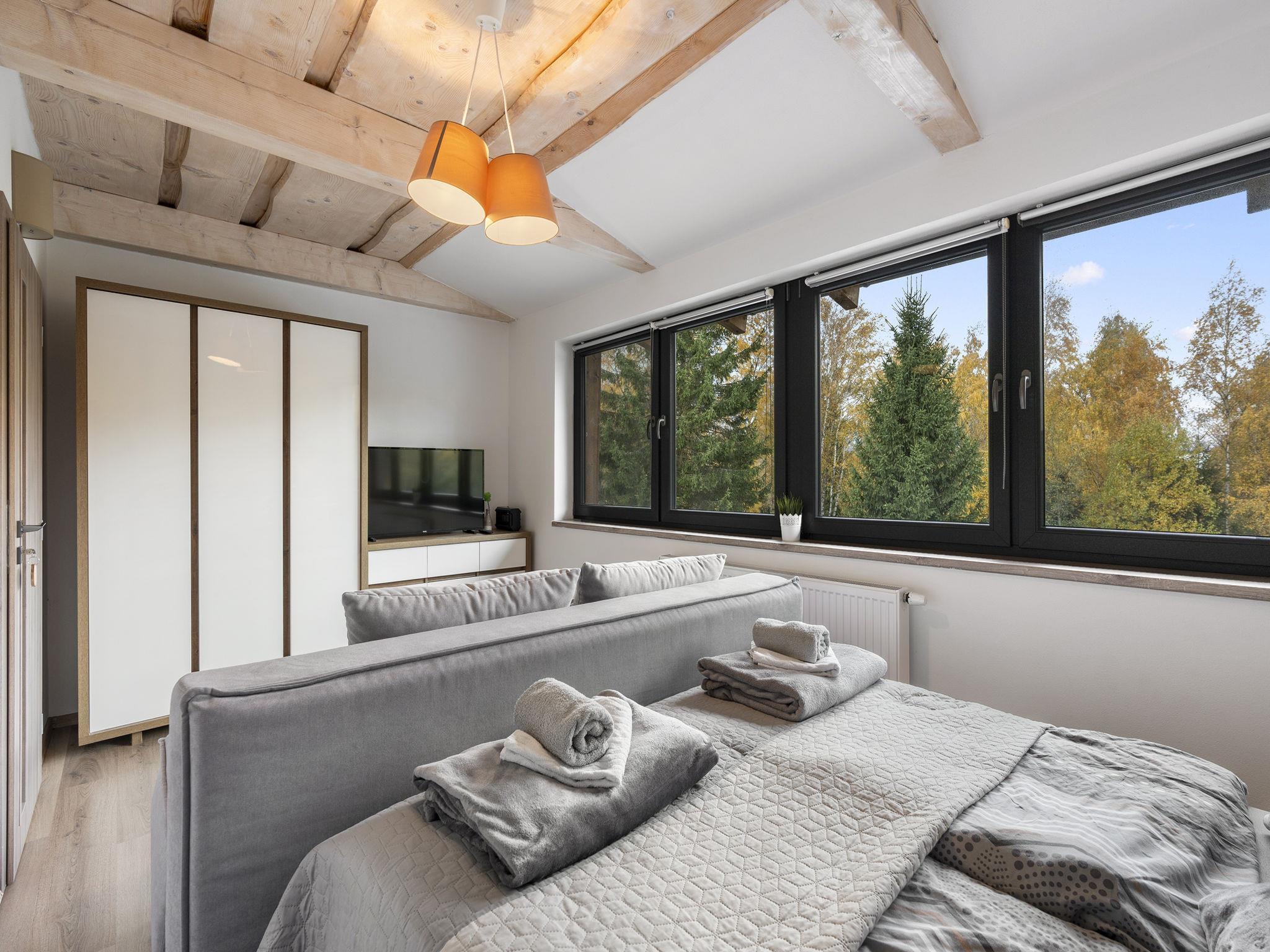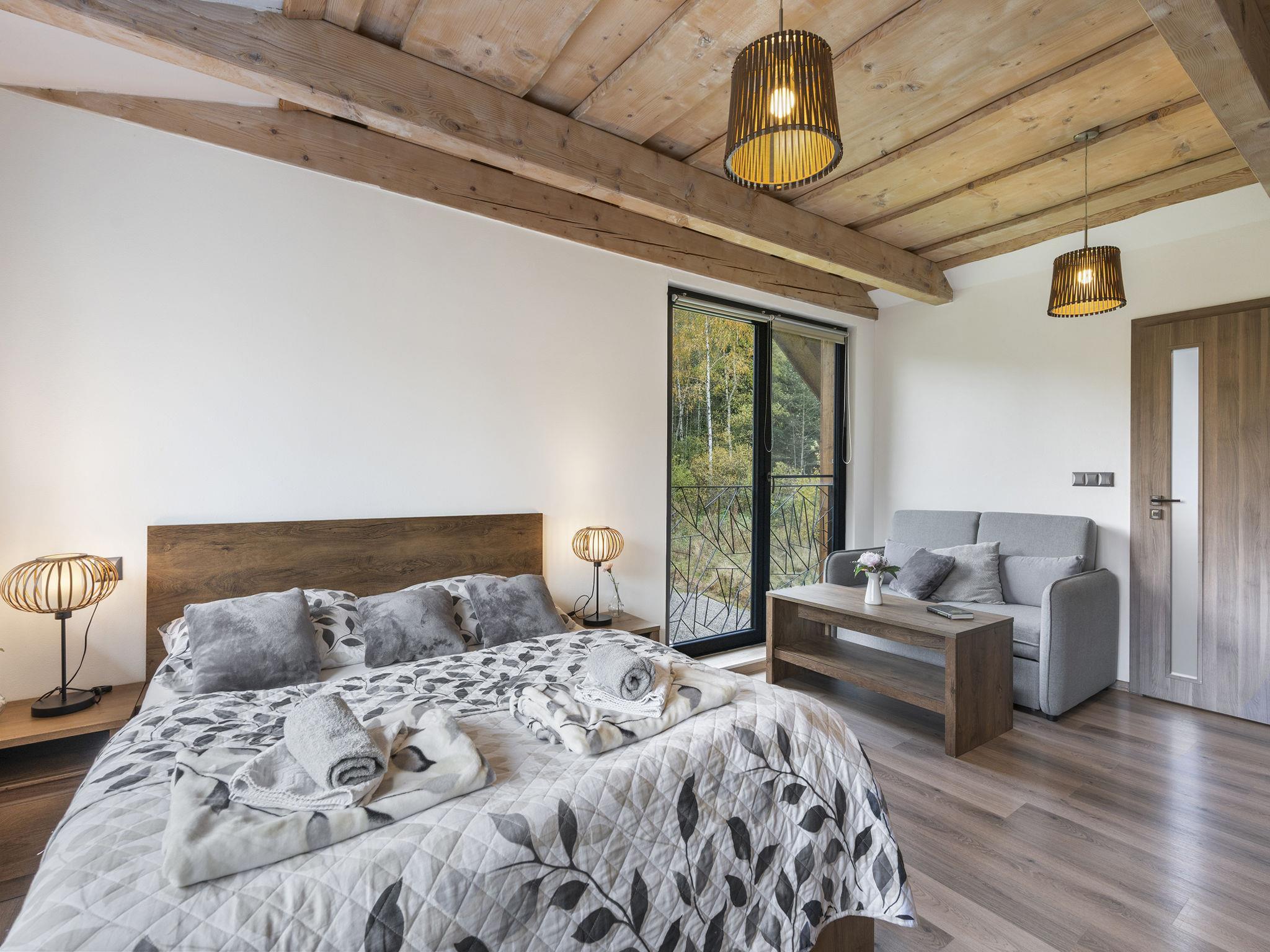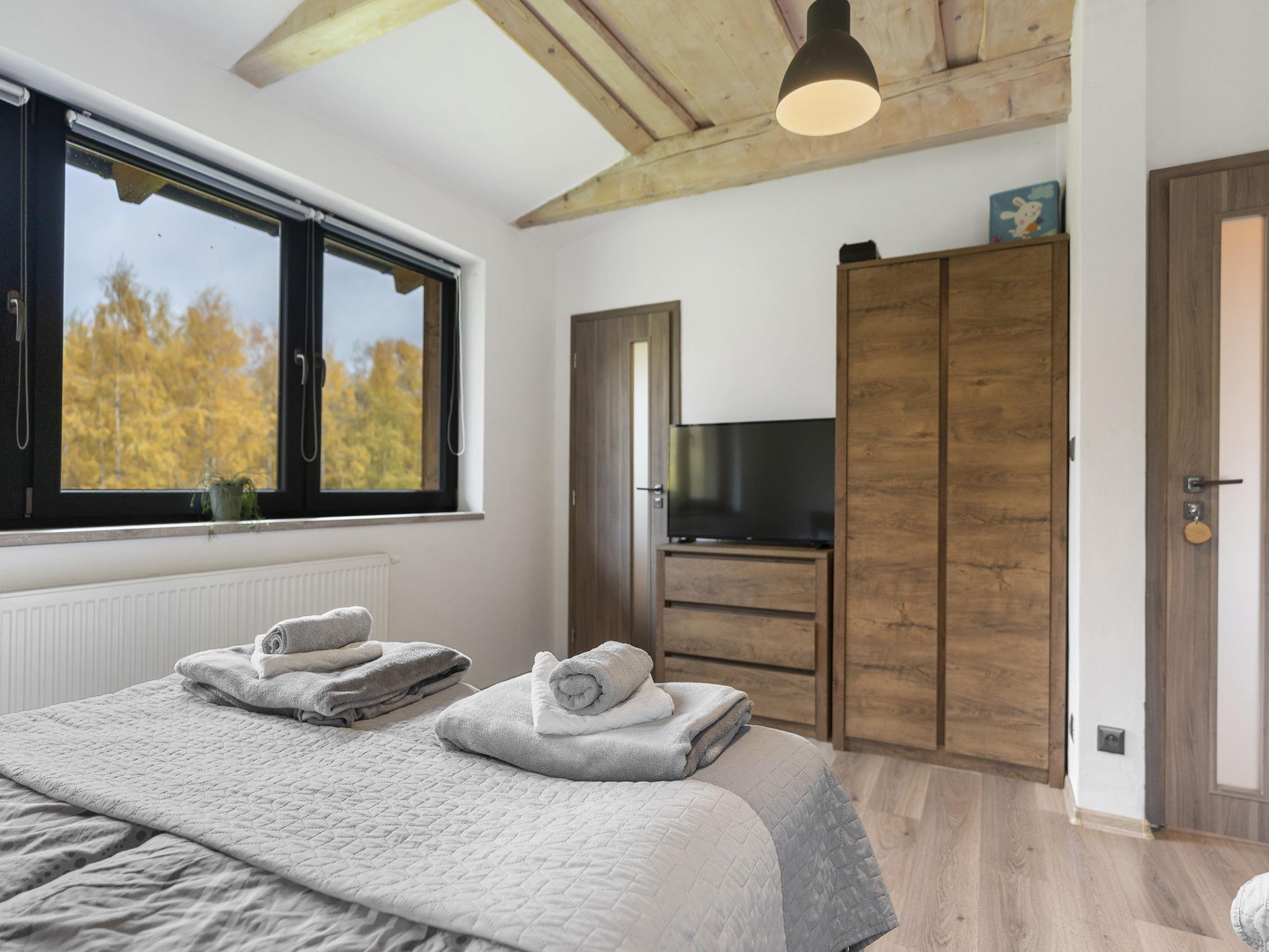8-room chalet 300 m2 on 2 levels. Spacious, comfortable and modern furnishings: open large living/dining room with open-hearth fireplace, dining table and separate WC. Exit to the terrace. 1 room with 1 double bed and shower/WC. Living room with panoramic window with open-hearth fireplace, shower/WC and hydro massage bath. Kitchen (4 hot plates, oven, dishwasher, kettle, microwave, electric coffee machine) with bar. Underfloor heating. Upper floor: 1 children's room with 1 bed and 1 double bed. 1 room with 1 double bed and shower/WC. 1 room with rooflight with 1 double bed. 1 room with 1 double sofabed and 1 double bed. 1 room with panoramic window with 1 double sofabed, 1 double bed and shower/WC. Bath/shower/WC. Large terrace. Terrace furniture. Beautiful panoramic view of the countryside and the forest. Facilities: Internet (WiFi, free). Please note: suitable for families. Smoke alarm, fire extinguisher. Beer tap available (extra).
