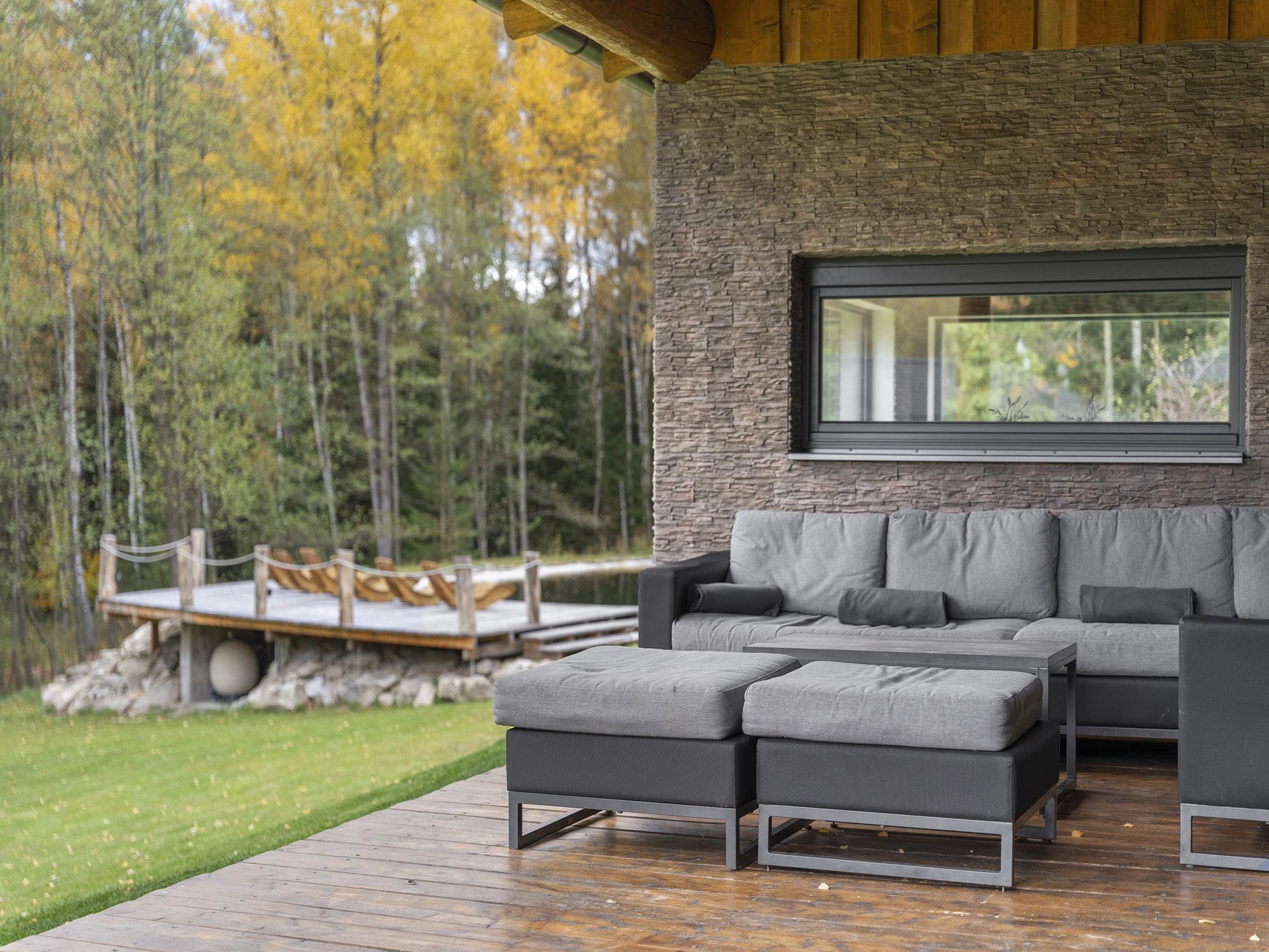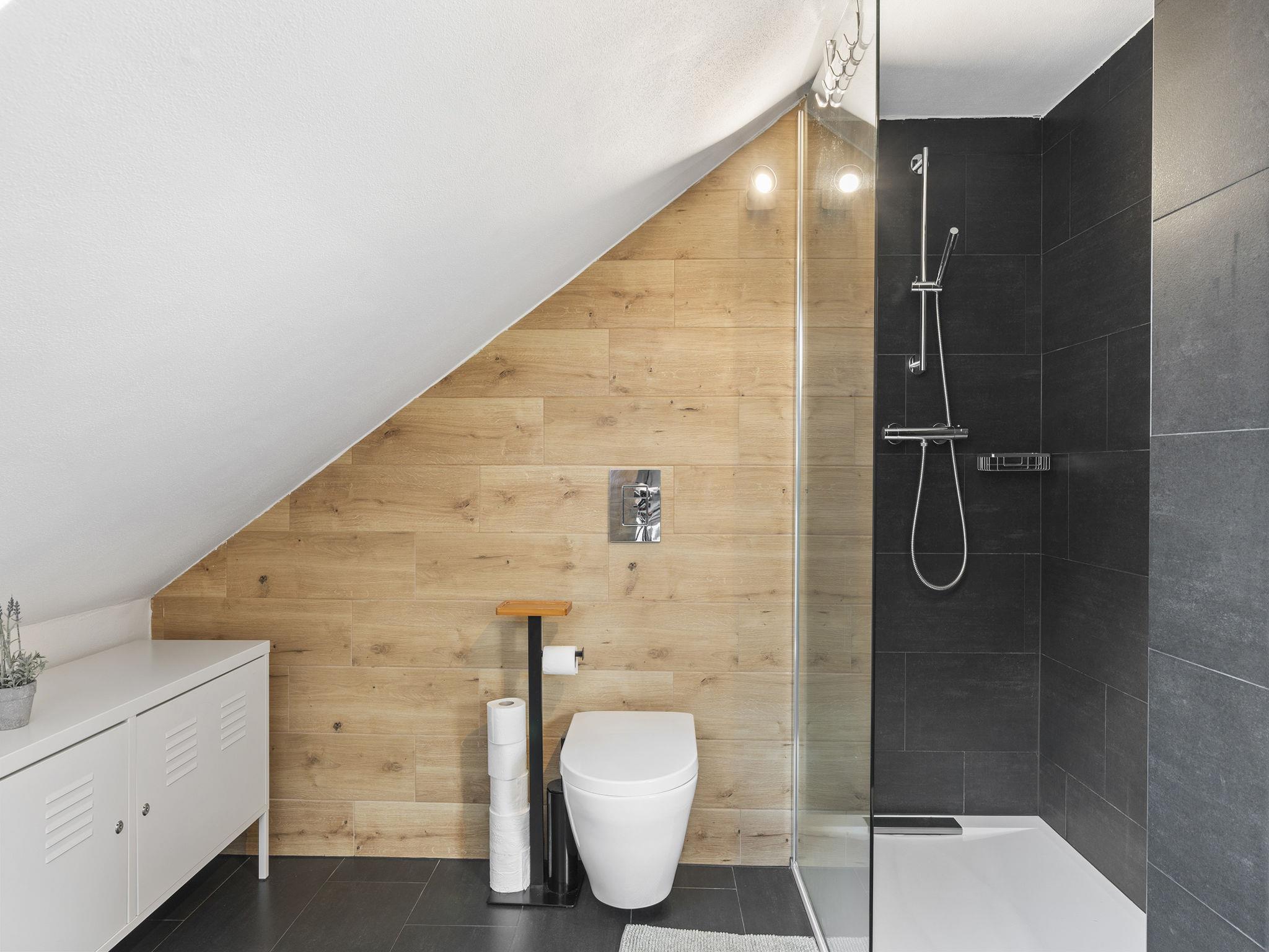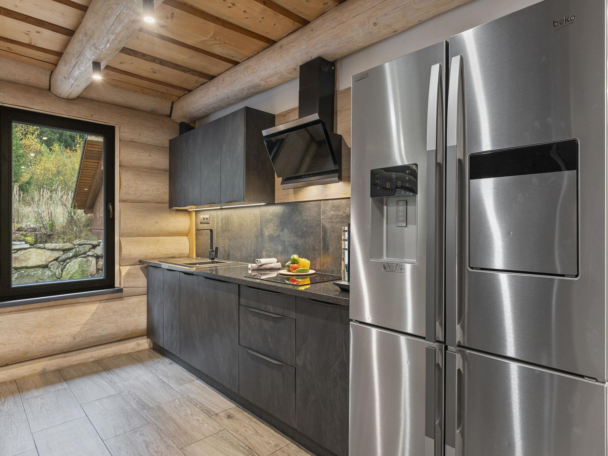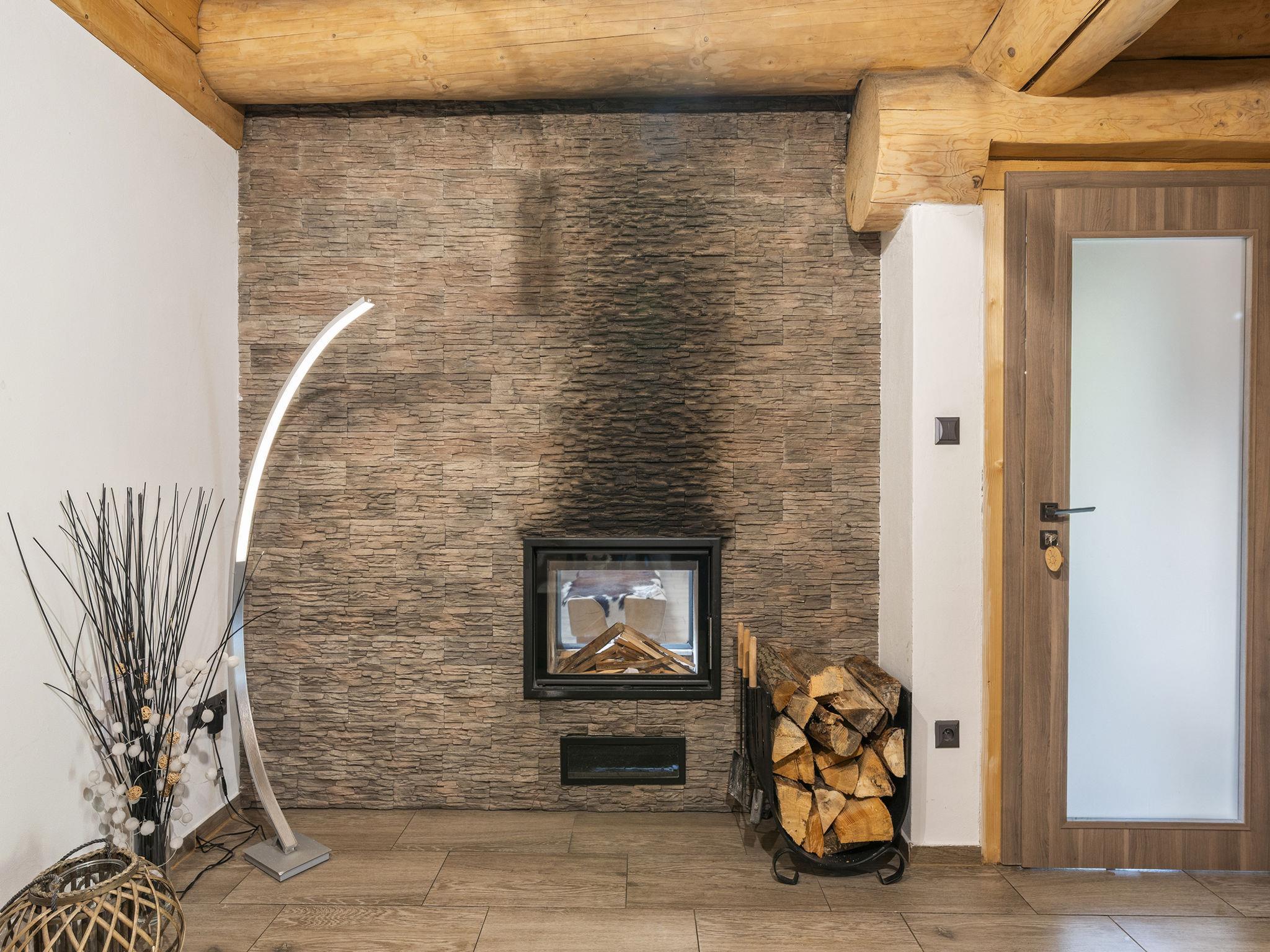 8-room chalet 300 m2 on 2 levels. Spacious, comfortable and modern furnishings: open large living/dining room with open-hearth fireplace, dining table and separate WC. Exit to the terrace. 1 room with 1 double bed and shower/WC. Living room with panoramic window with open-hearth fireplace, shower/WC and hydro massage bath. Kitchen (4 hot plates, oven, dishwasher, kettle, microwave, electric coffee machine) with bar. Underfloor heating. Upper floor: 1 children's room with 1 bed and 1 double bed. 1 room with 1 double bed and shower/WC. 1 room with rooflight with 1 double bed. 1 room with 1 double sofabed and 1 double bed. 1 room with panoramic window with 1 double sofabed, 1 double bed and shower/WC. Bath/shower/WC. Large terrace. Terrace furniture. Beautiful panoramic view of the countryside and the forest. Facilities: Internet (WiFi, free). Please note: suitable for families. Smoke alarm, fire extinguisher. Beer tap available (extra).