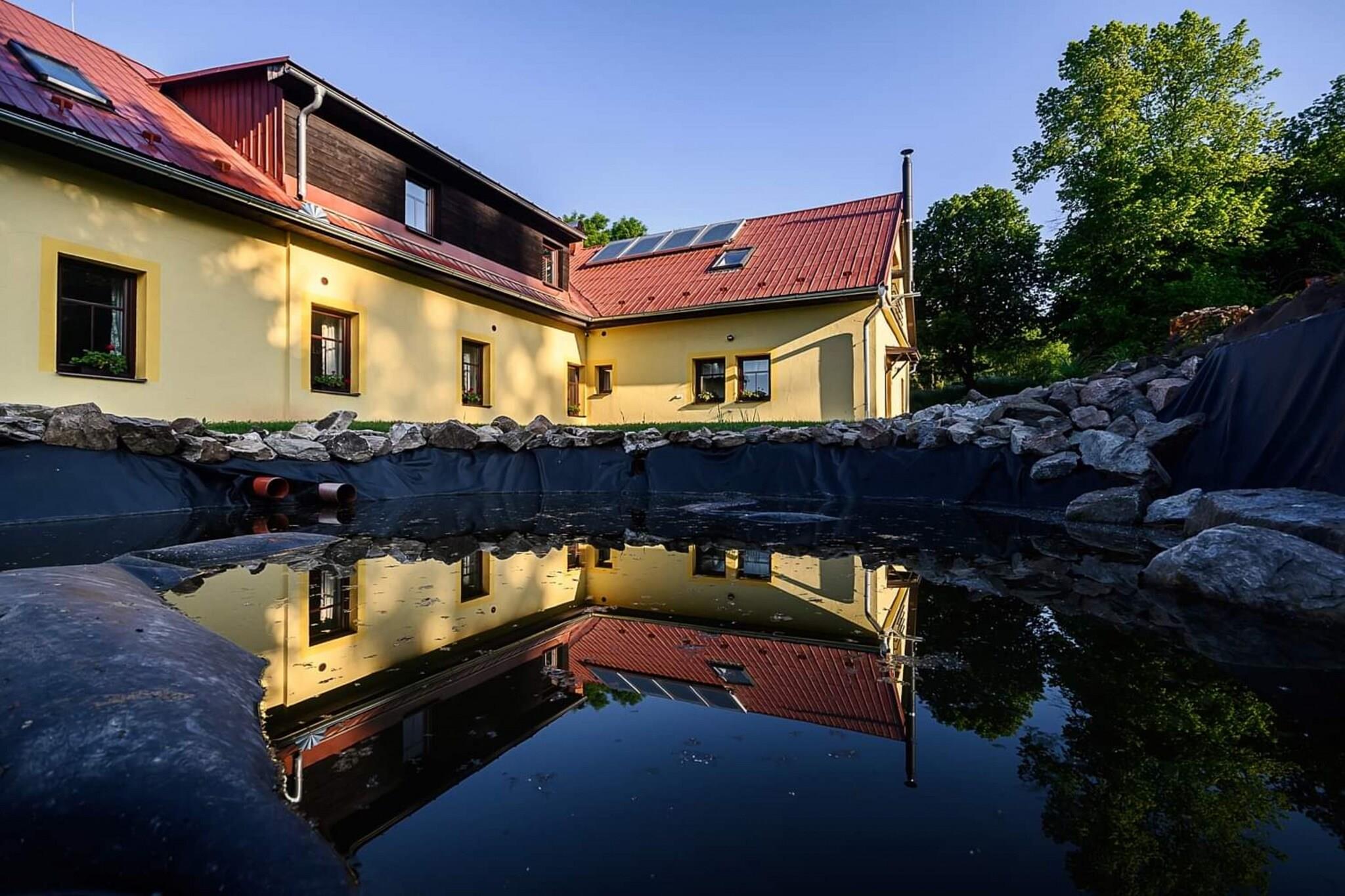 Denne rummelige villa, ideel til grupper eller familier, kan rumme op til 17 personer med ni soveværelser og ni badeværelser. Hvert værelse er udstyret med bruser og toilet, hvilket giver privatliv og komfort for alle gæster. Villaen er blevet fuldstændig renoveret i 2021 og indeholder moderne faciliteter såsom sauna, vaskerum med vaskemaskine og tørretumbler, skirum og cykelskur. Fire veludstyrede køkkener, hvoraf to har opvaskemaskine, sørger for bekvemmelighed under måltidstilberedning. En hyggelig stue med pejs og tv giver et behageligt sted at slappe af efter en travl dag. Beliggende i en stille landsbydal nær Žaclér, er villaen en fremragende base for udendørs aktiviteter. De omkringliggende Giant Mountains byder på attraktioner året rundt. Vandreentusiaster kan bestige Snežka, den højeste top i Tjekkiet, mens naturelskere kan udforske de fantastiske Adršpašsko-Teplické-klipper. Trætopstien i Janské Lázne giver en betagende udsigt fra oven. Om vinteren tilbyder nærliggende skisportssteder såsom Prkenny Dul og Skisportsstedet Pec forskellige pister til skiløb og snowboarding, hvilket gør denne villa til en perfekt vinterferie. Udenfor kan gæsterne nyde en rummelig have med overdækket havepavillon og grillplads, perfekt til udendørs sammenkomster. For børn er der en rutsjebane, sandkasse og masser af græsplæneplads til at lege. Efter en dag med udforskning kan gæsterne slappe af i saunaen eller samles ved pejsen til en hyggelig aften. Det mobile ølhanesystem tilføjer et ekstra strejf af sjov for dem, der ønsker at nyde en forfriskende drink i villaens komfort.