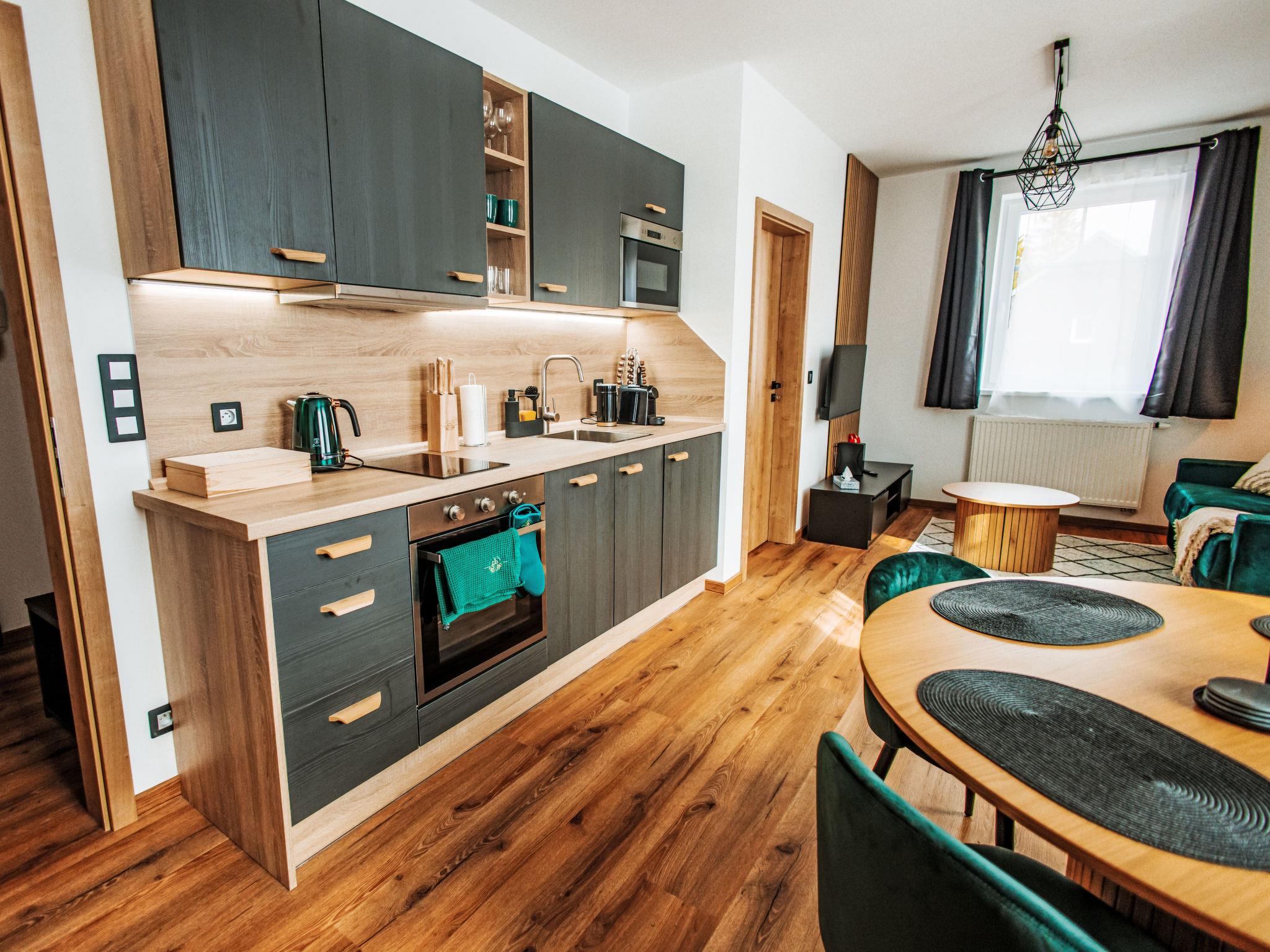 2-room apartment 35 m2 on 2nd floor. Comfortable and cosy furnishings: open living/dining room with 1 double sofabed and TV. 1 room with 1 double bed and TV. Open kitchen (oven, dishwasher, 4 ceramic glass hob hotplates, kettle, microwave, electric coffee machine) with dining table. Shower/WC. Heating. View of the mountains. Facilities: children's high chair, baby cot, hair dryer. Parking (1 car). Please note: non-smokers only.