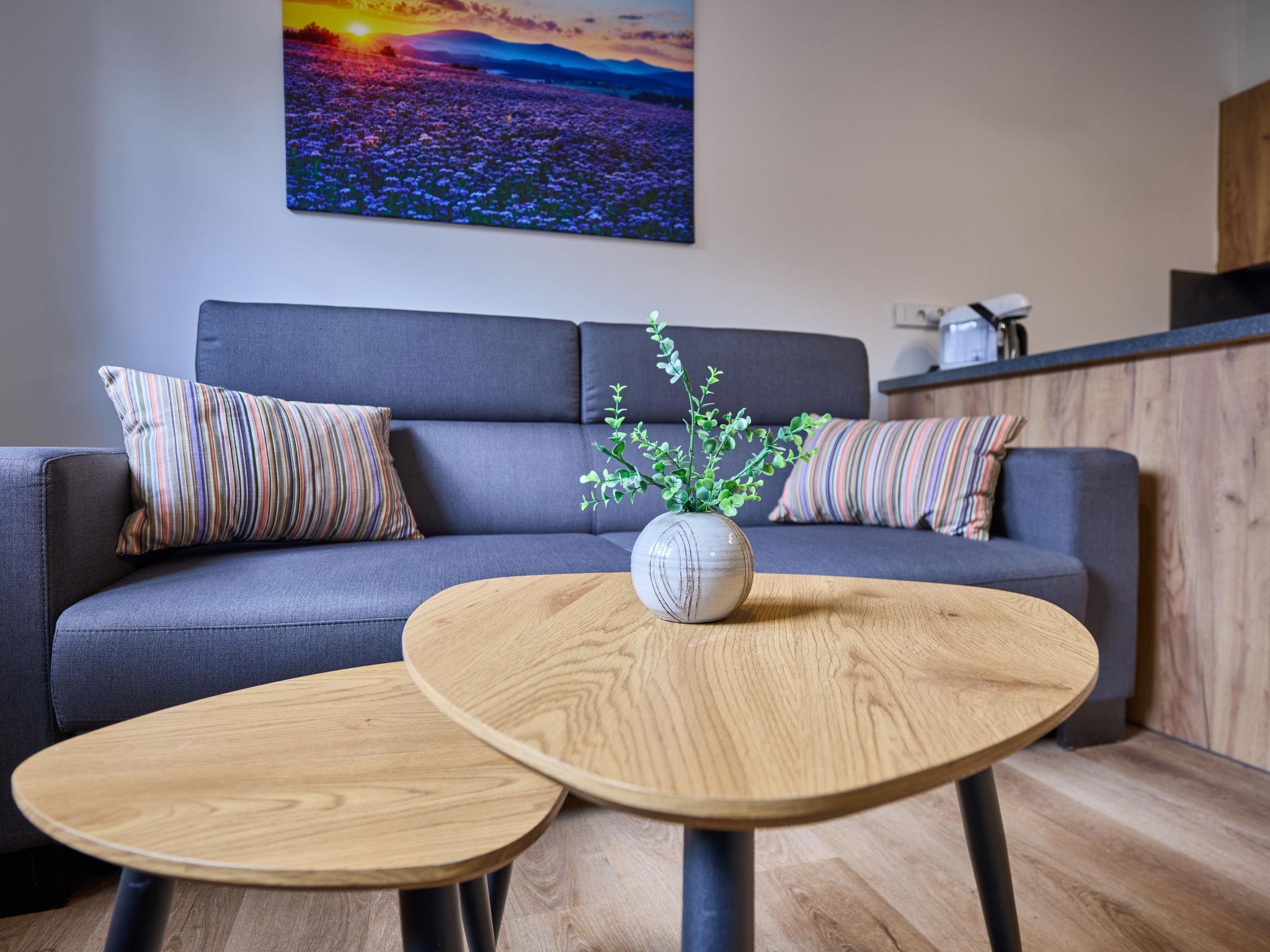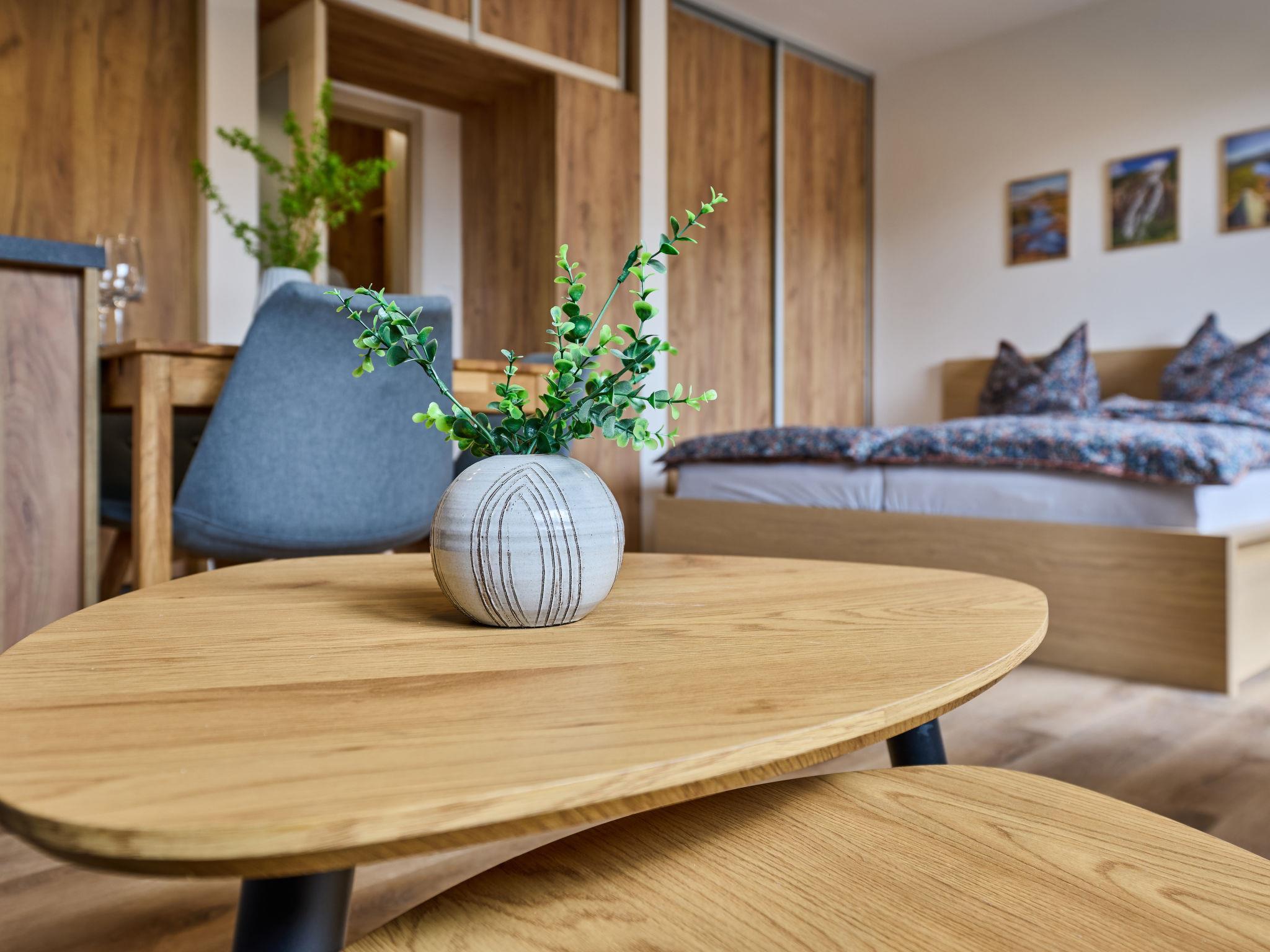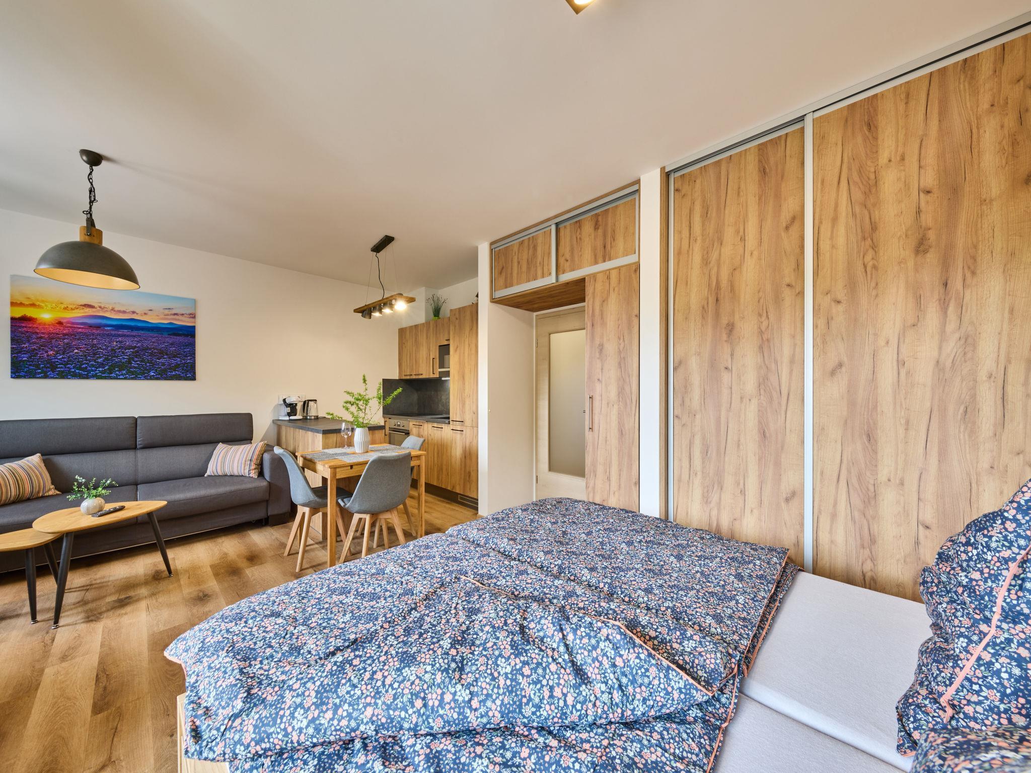 1-room studio 30 m2 on 1st floor. Very beautiful and modern furnishings: living/sleeping room with 1 double sofabed and 1 double bed. Kitchenette (4 ceramic glass hob hotplates, kettle, microwave, electric coffee machine). Shower/WC. Heating. Small balcony. Balcony furniture, box-room. Facilities: Internet (WiFi, free). Please note: suitable for families. Non-smoking house. No lift. Cellar. CZ5429.20.2
