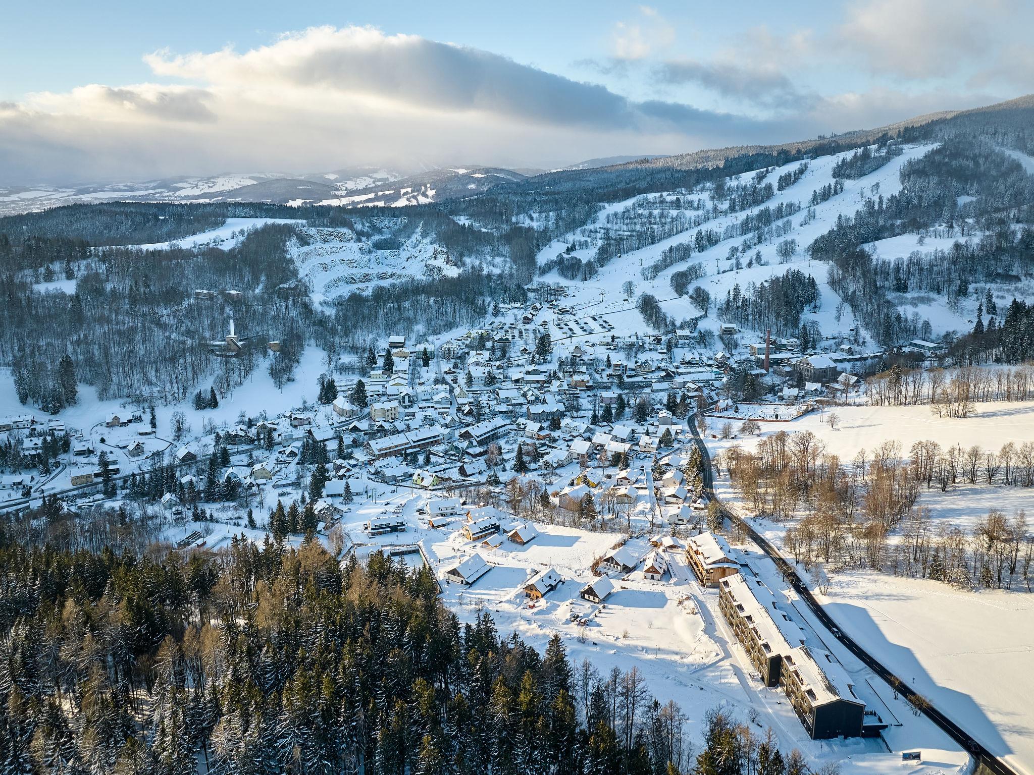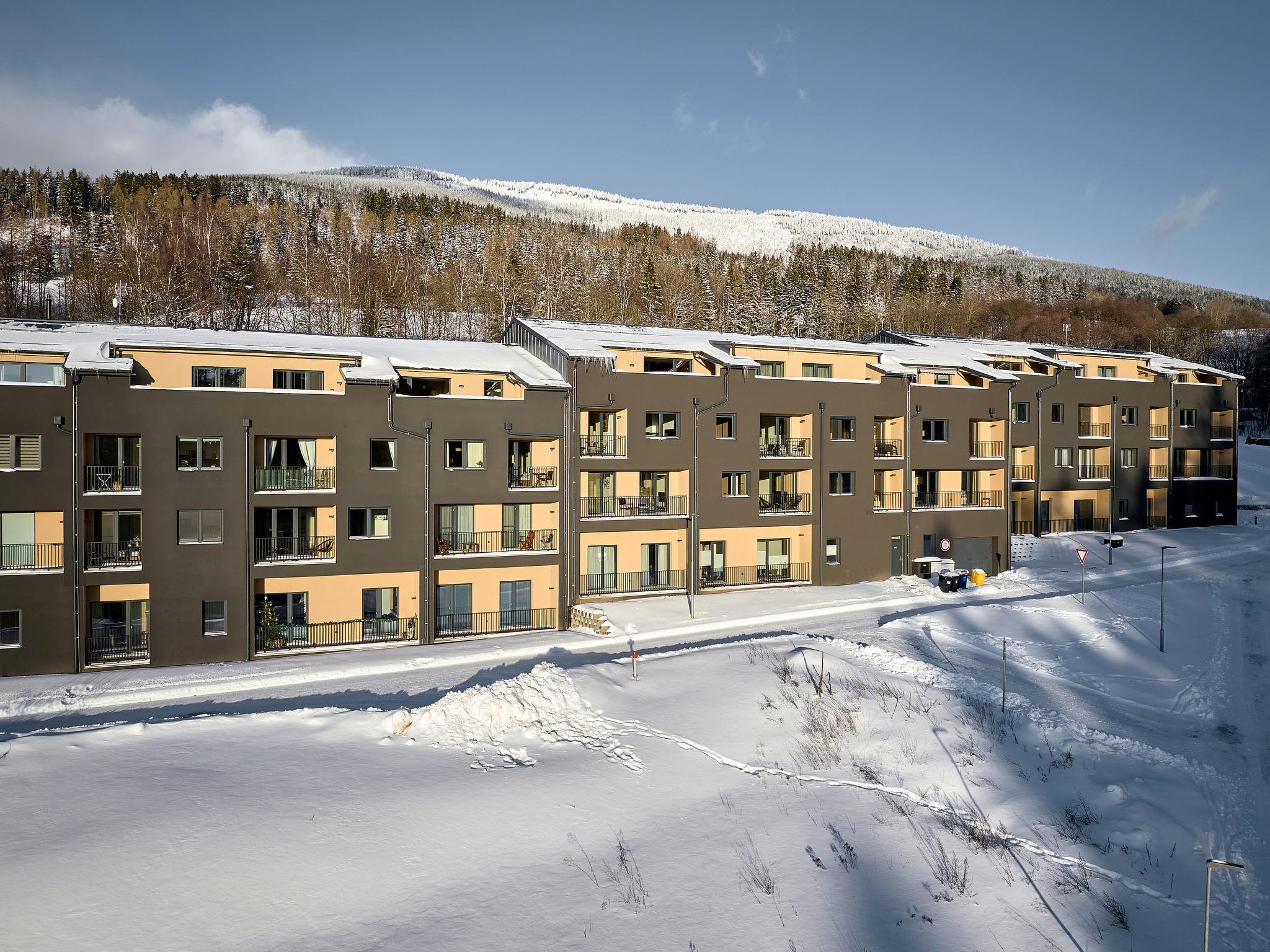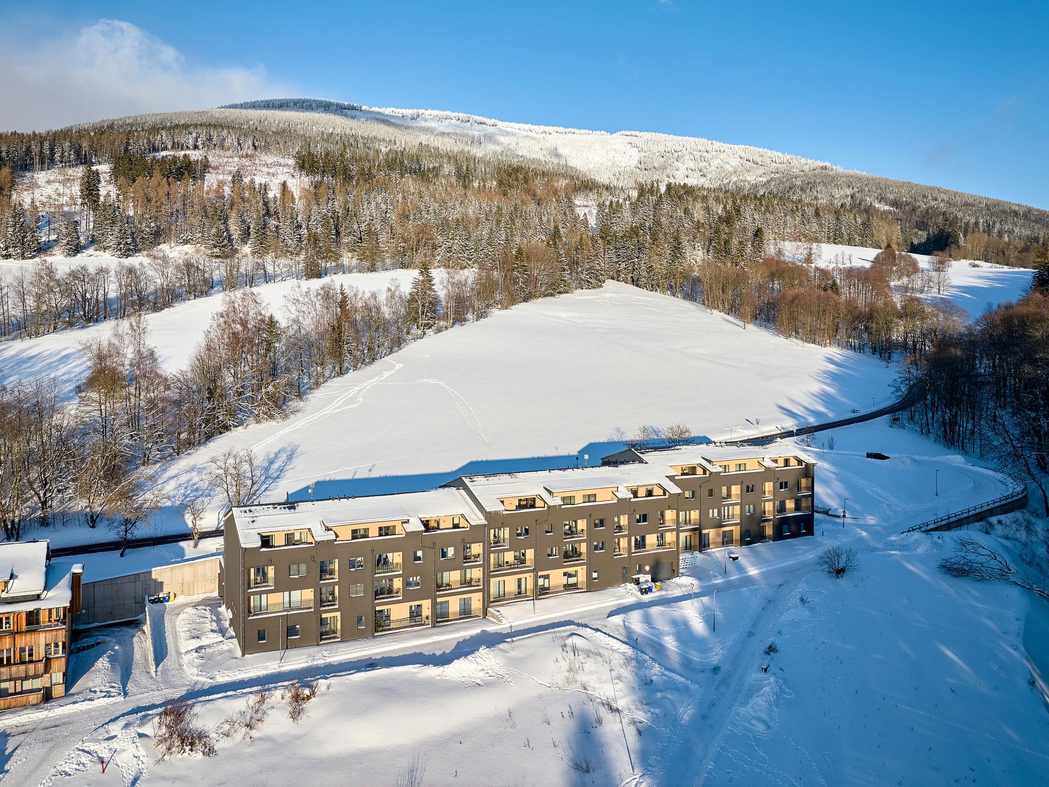 Modern, comfortable apartment block "Cerný Dul", detached. In the centre of Cerný Dul, 900 m from the skiing area. In the house: lift, storage room for skis, central heating system. Parking at the house. Grocery 600 m, bus stop "Cerný dul, námestí" 640 m, indoor swimming pool 25 km. Golf course (18 hole) 12 km, tennis 5 km, walking paths from the house 10 m, cycle lane, ski lift 900 m, chair lift, slopes, ski rental 900 m, ski school, children's ski school, ski-kindergarten. Nearby attractions: Janské Lázne Spa 6 km, Vrchlabí 13 km, Aquapark Trutnov 28 km, Zoo Safari Dvur Králové 32 km, Bozkovské jeskyne 40 km, Adršpašské skály 47 km. Well-known ski regions can easily be reached: Cerný Dul 900 m, Janské Lázne 5 km, Herlíkovice, Pec pod Snežkou. Well-known lakes can easily be reached: Cistá 3.5 km, Vrchlabí 12 km. Hiking paths: Snežka 28 km.